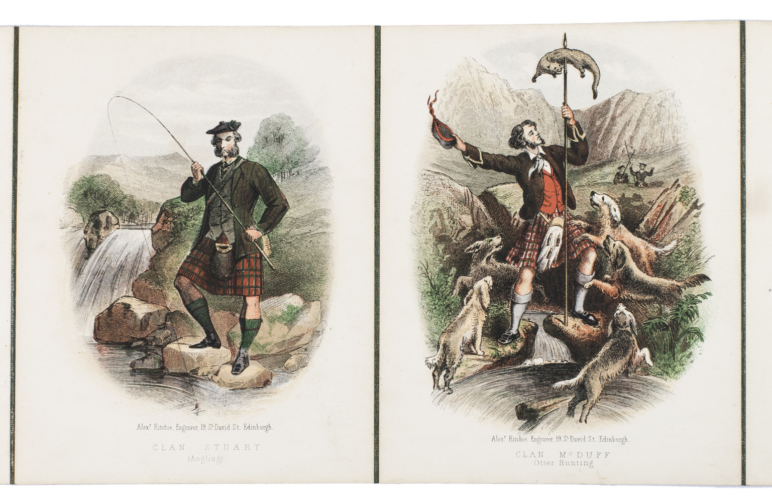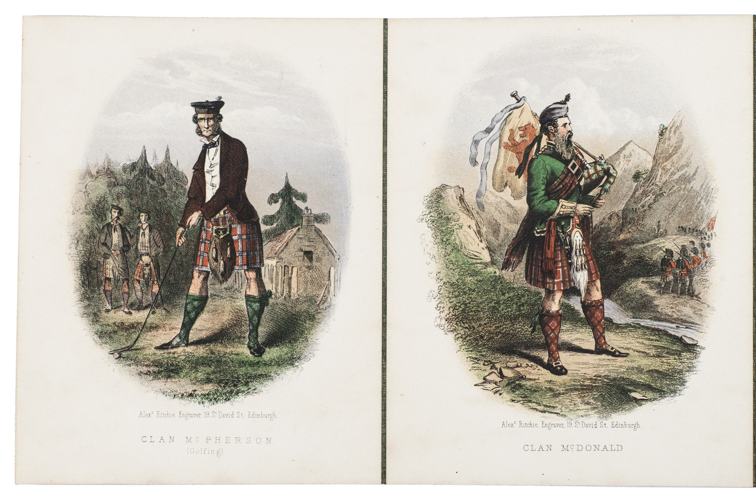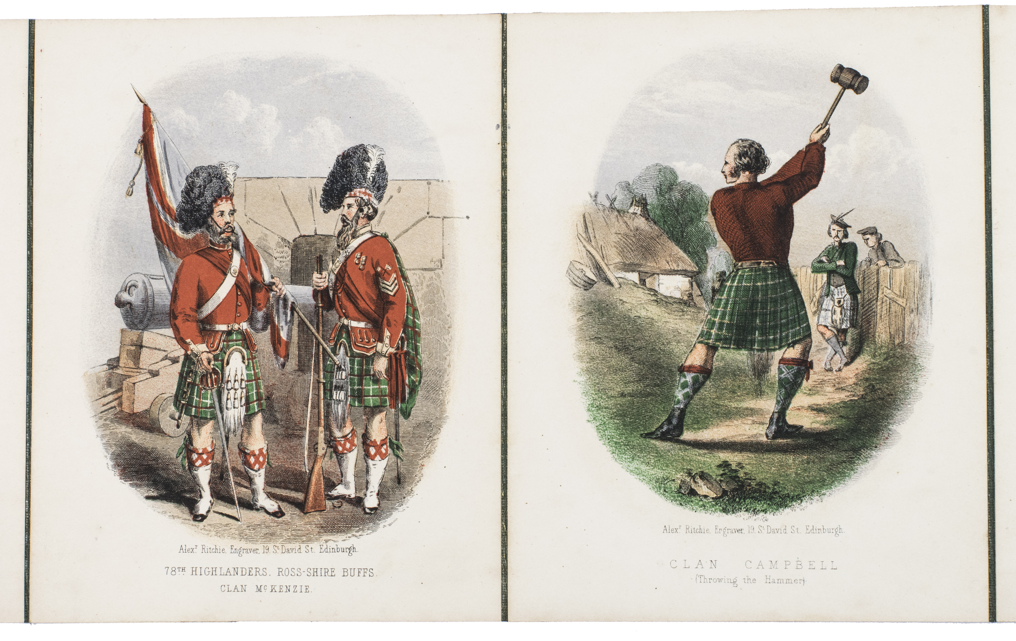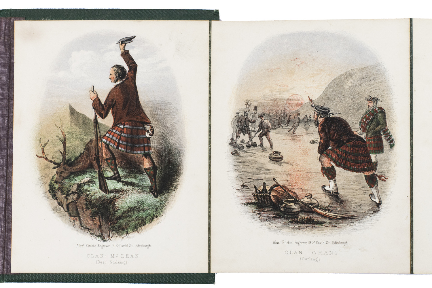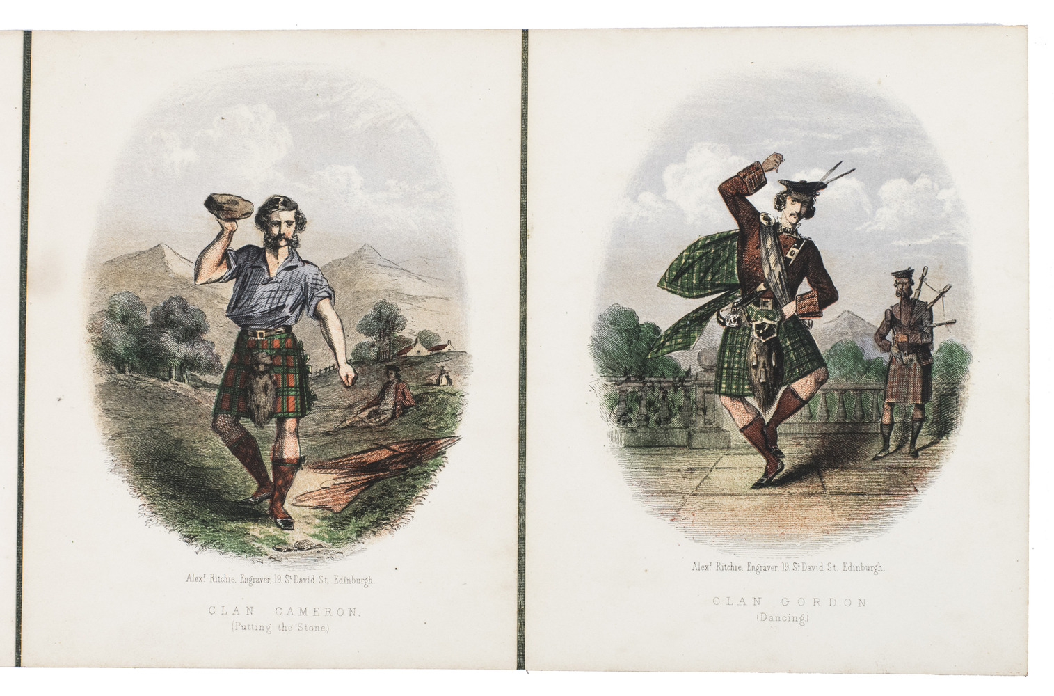Edinburgh, C. Sinclair, [between 1850 and 1873]. 15.5 x 12 cm. With 12 very detailed, hand-coloured engravings of Scottish men representing 12 clans in their traditional tartans. All engravings are mounted on dark green moiré-grained cloth in 2 sets of 6, respectively folding out from the front and back pastedowns. All engravings are captioned in the plate, giving the name of the clan depicted and a short description of the scene, and signed by the engraver, Alexander Ritchie. Original publisher's gold- and blind-stamped green wave-grained cloth, with the title in gold within an elaborate gold-stamped frame on the front board and a blind-stamped ornamental oval centrepiece (a personification of Scotland?) within an elaborate blind-stamped frame on the back board, remnants of red cloth ties. [2 sets of 6 engravings folding out].