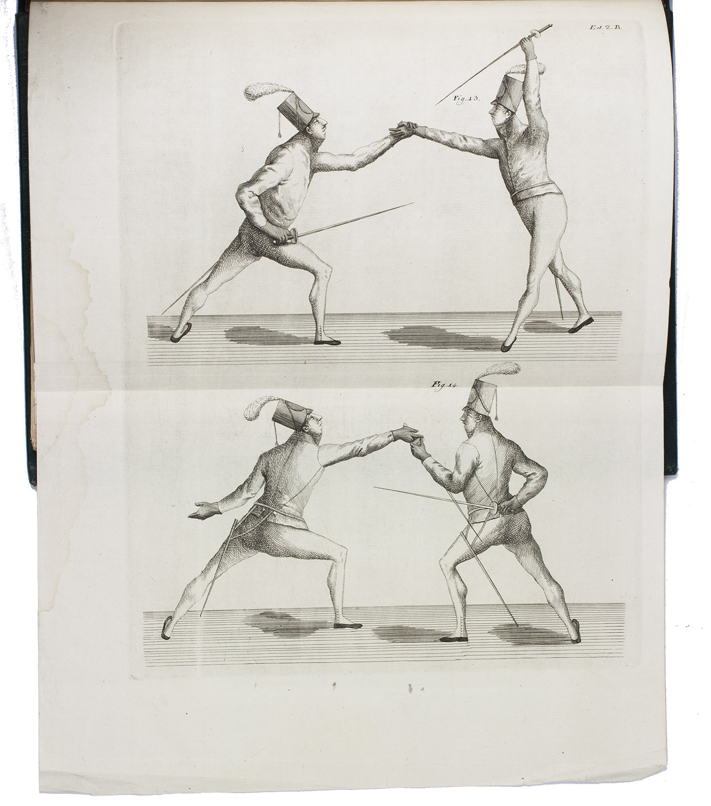 First and only edition of a complete course in Portuguese on the use of the foil, by Theotonio Rodrigues de Carvalho, including the principles of both offence and defence. With 8 plates containing 17 figures, each showing a pair of fencers demonstrating defensive moves, attacks and various styles of swordsmanship. The author modestly says it is translated from the best French sources, but by editing and combining material from a variety of sources, he produced a separate work. The "Advertencia" explains that the figures were originally to appear on 2 plates, changed to 8 after the text was printed, hence the odd numbering.