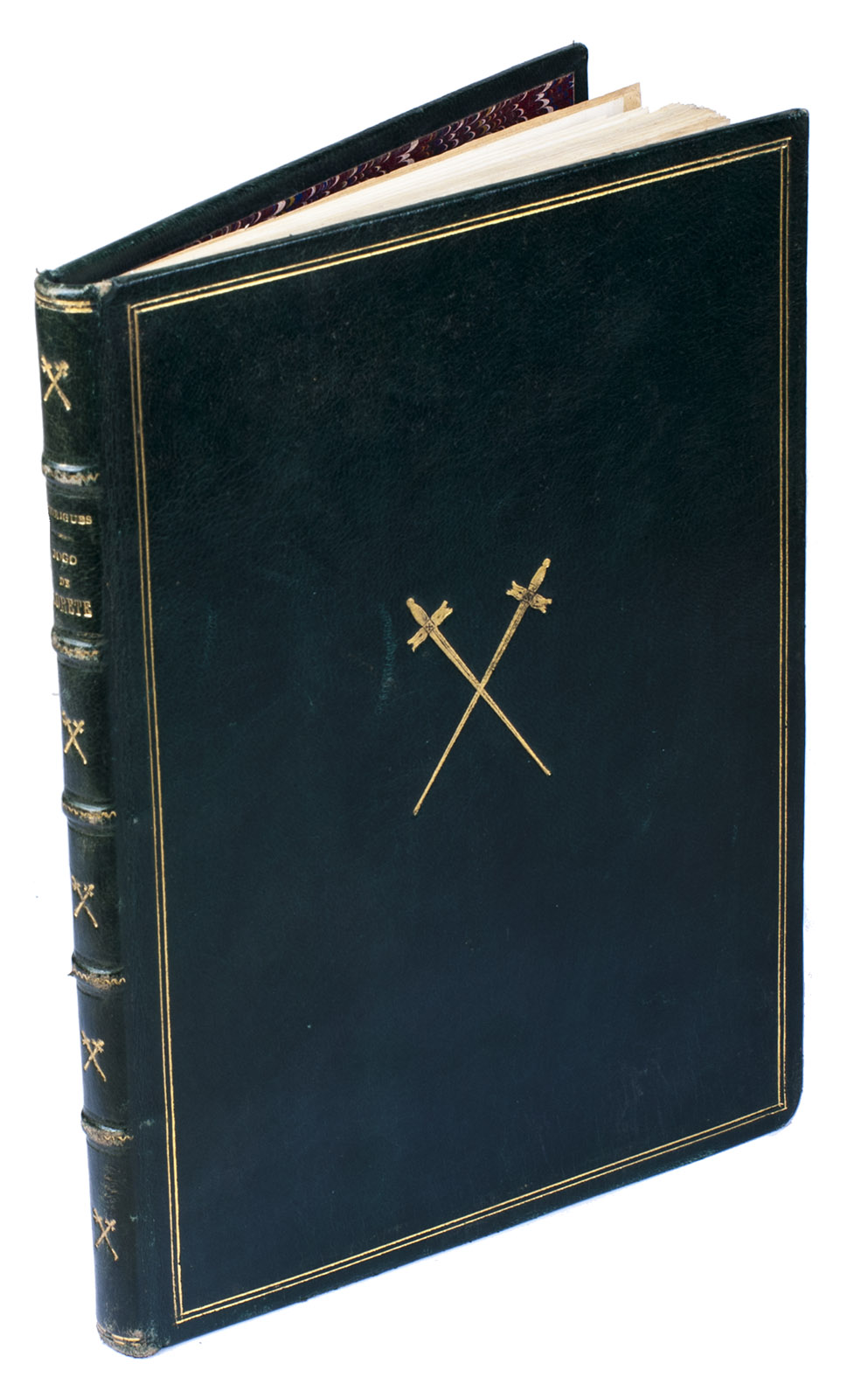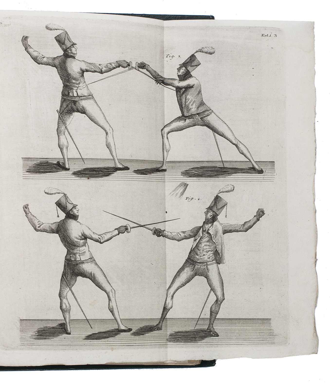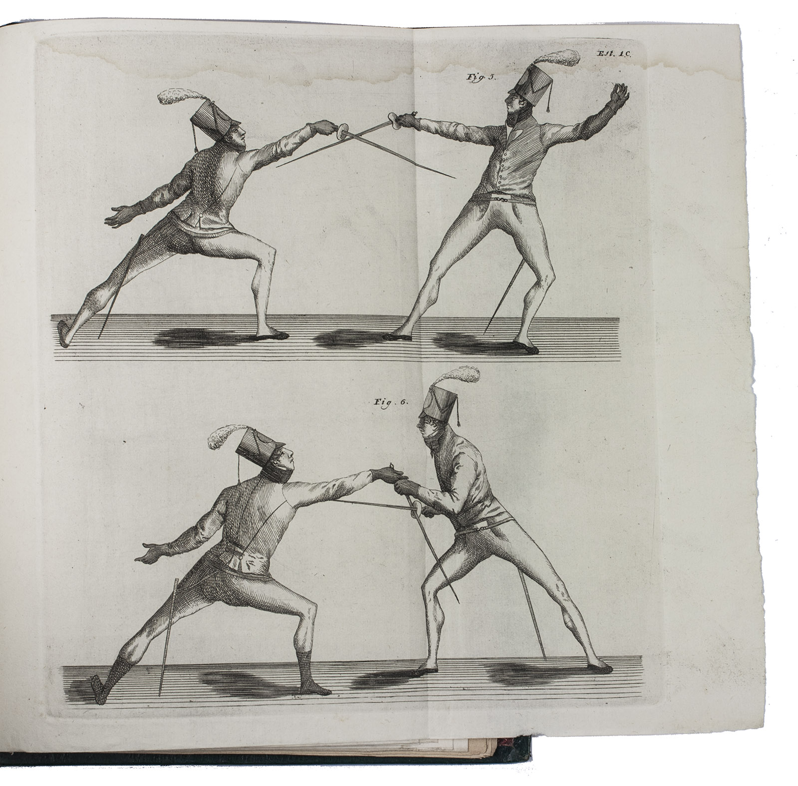 One plate with a tear, water stains at the head of some plates, occasionally reaching the feather in a fencers hat, but otherwise in very good condition and nearly untrimmed, with a few bolts unopened at the head. Enrique De Leguina, Bibliografía e historia de la esgrima Española 173; Thimm, A bibliography of fencing and duelling, 48; WorldCat (4 copies).