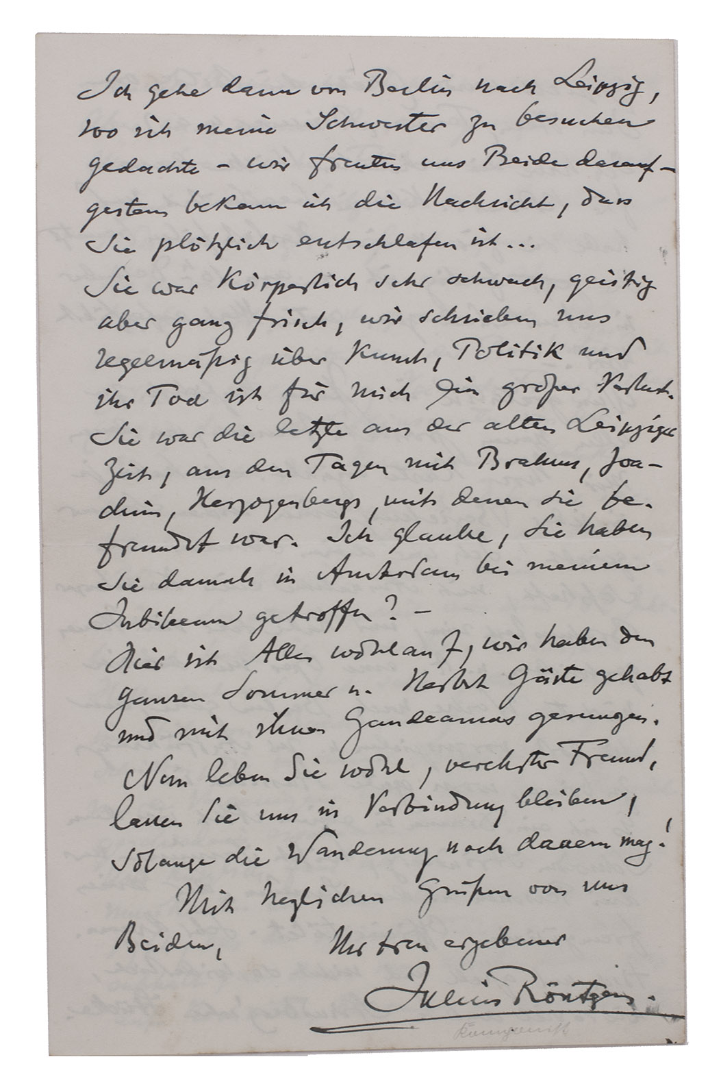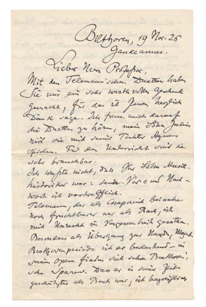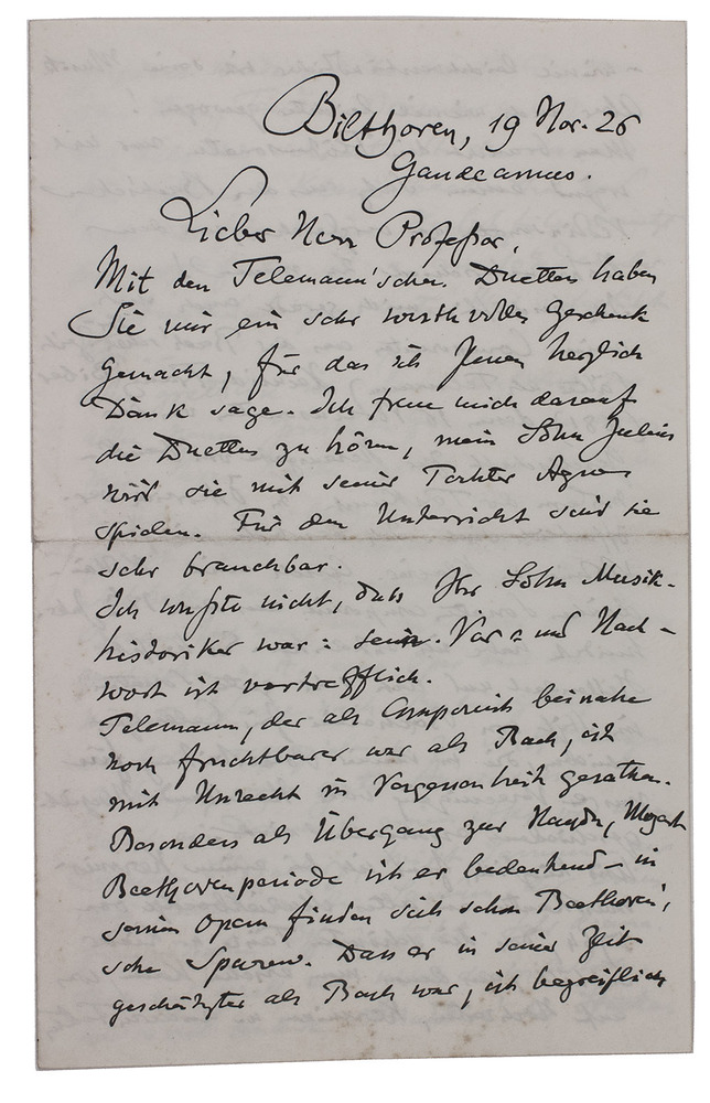 Extensive personal letter by the composer Julius Engelbert Röntgen. The letter is written on all four pages of a double-leaf to a "Lieber Herr Professor" to thank him for sending the "Telemann'schen Duetten", a publication with a for- and afterword by the addressee's son. The letter is most likely addressed to the eminent German musicologist Max Seiffert who played a prominent role in the Vereniging voor Nederlandsche Muziekgeschiedenis and the Dutch music scene of the interbellum. In very good condition.