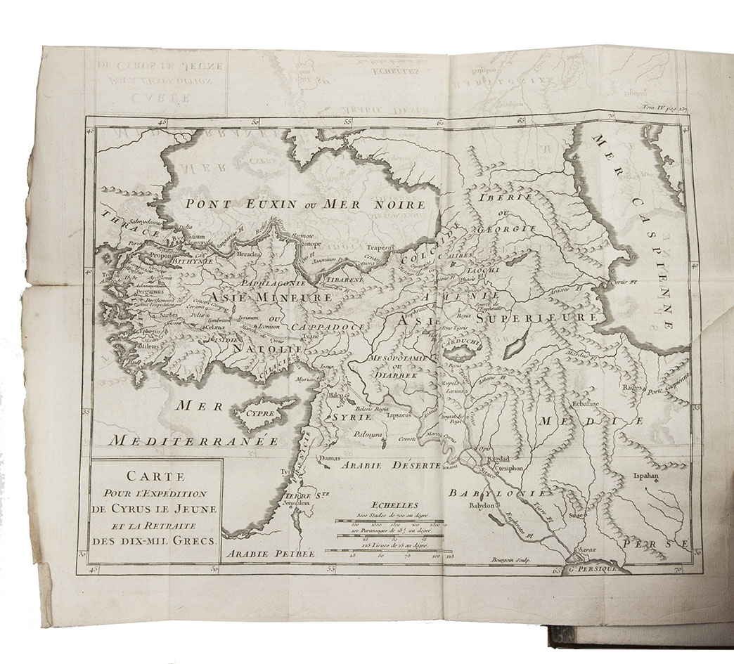 Lovely set, in the original French, of Rollin's very popular Histoire ancienne, which, contrary to its full title, primarily describes ancient Greece (the other ancient peoples are only treated in the first two volumes). It's a mixed set from three editions published by the Estienne family in nice closely matching bindings. After the first volume appeared in 1730, the series grew well beyond its initially planned five volumes and became tremendously popular, appearing in numerous editions and translations well into the 19th century.