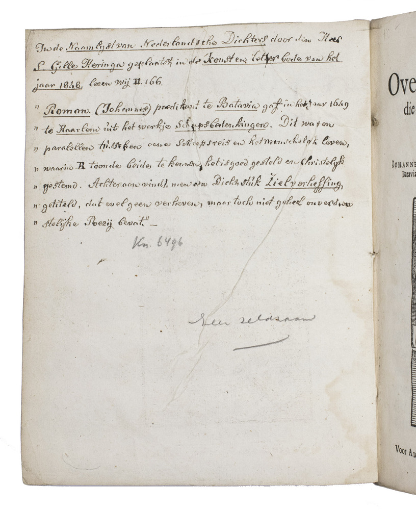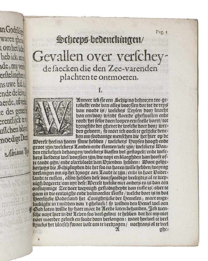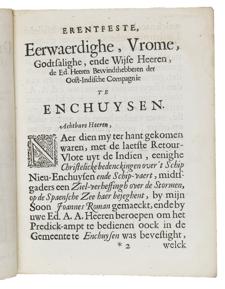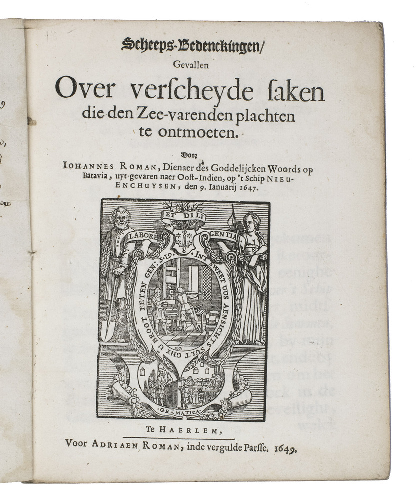 Very rare first and only edition of a pamphlet containing reflections related to seafaring, written by the Dutch minister Johannes Roman (d. 1689). He had left his birthplace of Haarlem for Batavia in January 1647. On his journey to the Dutch East Indies on board the East Indiaman Nieu-Enchuysen (built in 1636, also known under all spelling variations of (Nieuw) Enkhuisen), he probably wrote the present pamphlet - comprising 15 short texts in which he reflects on topics relevant to those embarking on sea voyages. The present work is dedicated by the publisher Adriaen Roman to the directors of the Enkhuizen chamber of the VOC. A long poem in Dutch has been included at the end of the work (on pp. 19-23), titled Ziel-verheffing, over de verlossinghe die ons de Heere heeft ghedaen uyt verscheyde stormen ende nood-weder, ons op de Spaensche zee over-ghekomen. Midtsgaders, dat Hy ons heeft laten ontmoeten een Engelsch schip van de Barbades ...