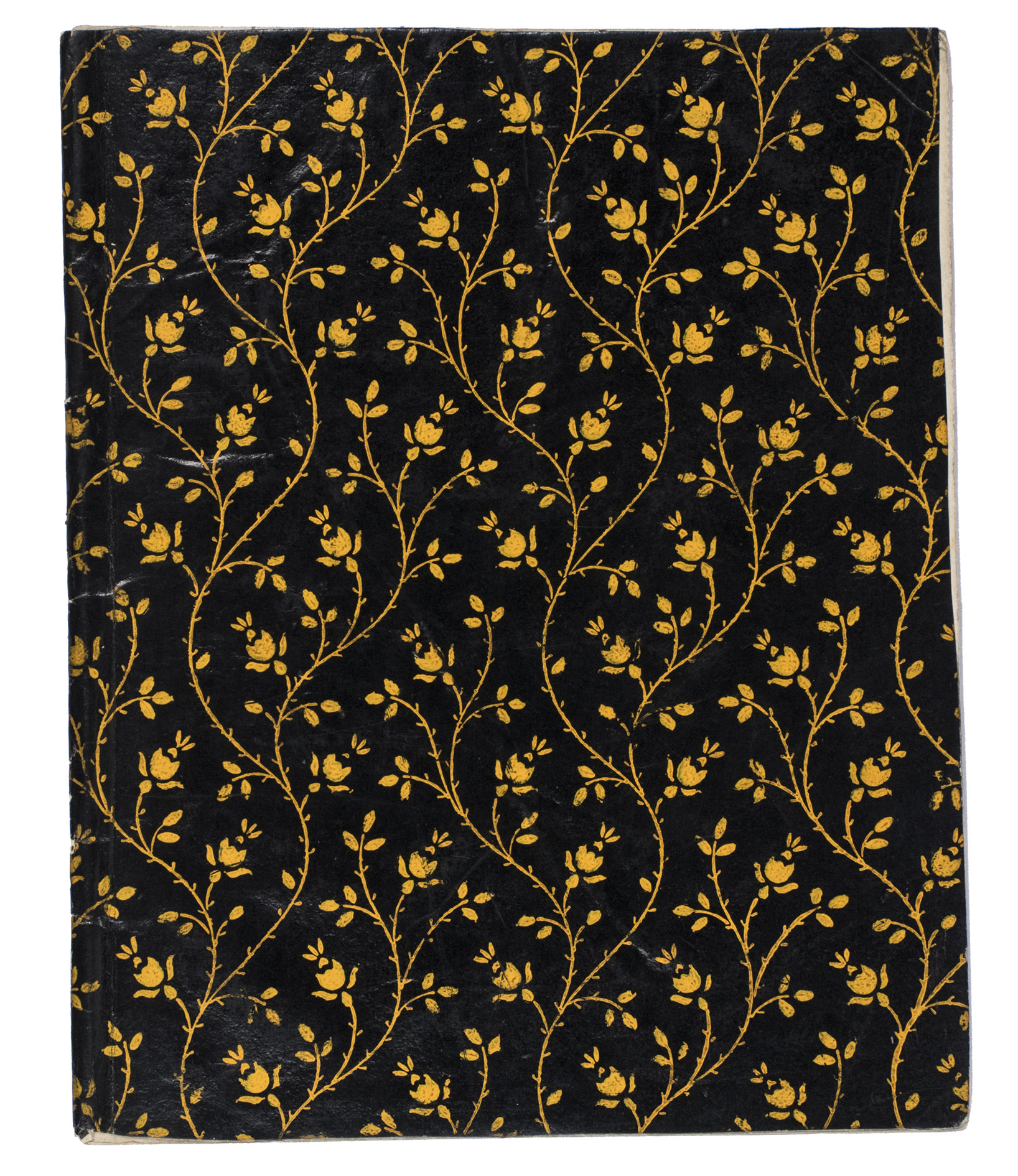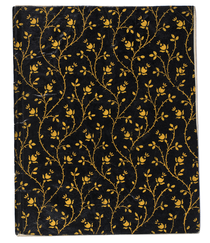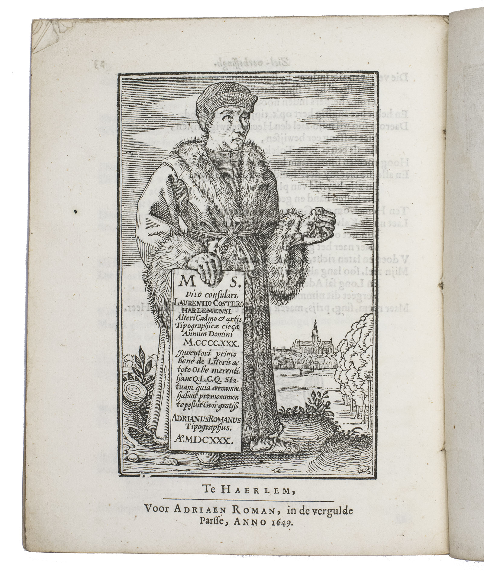 Haarlem, Adriaen Roman, 1649. 4to. With a large woodcut printers device on the title page, a large woodcut portrait of Laurens Janszoon Coster (printer's device of A. Roman, dated 1630 in the block) on the final page, 3 decorated woodcut initials, and a woodcut tailpiece. Later black and orange painted paper wrappers showing a floral design. [1], [1 blank], [2], 23, [1] pp.