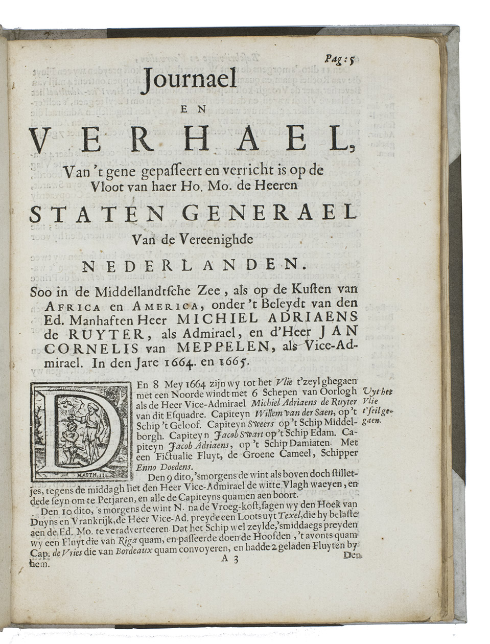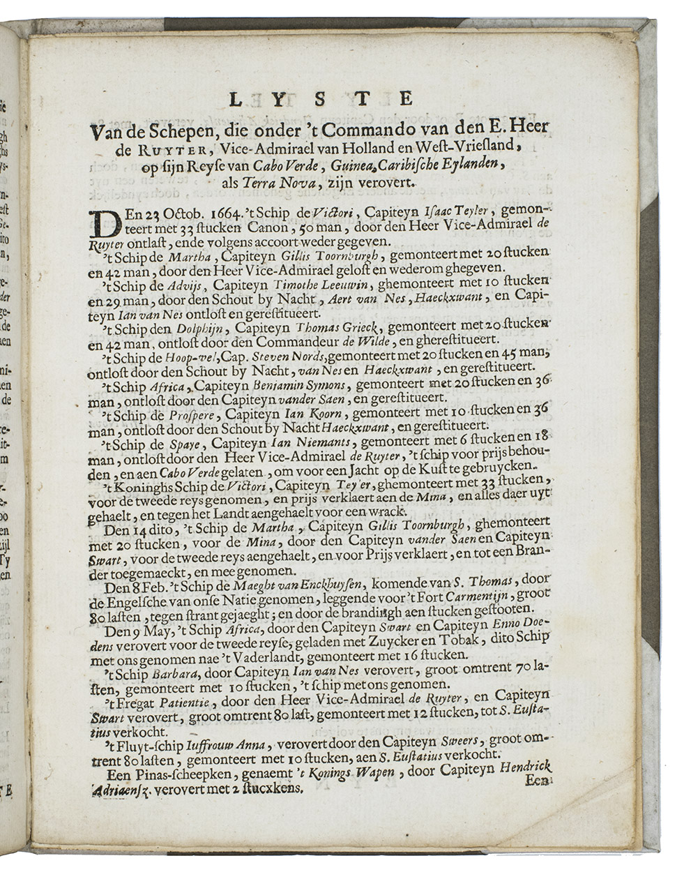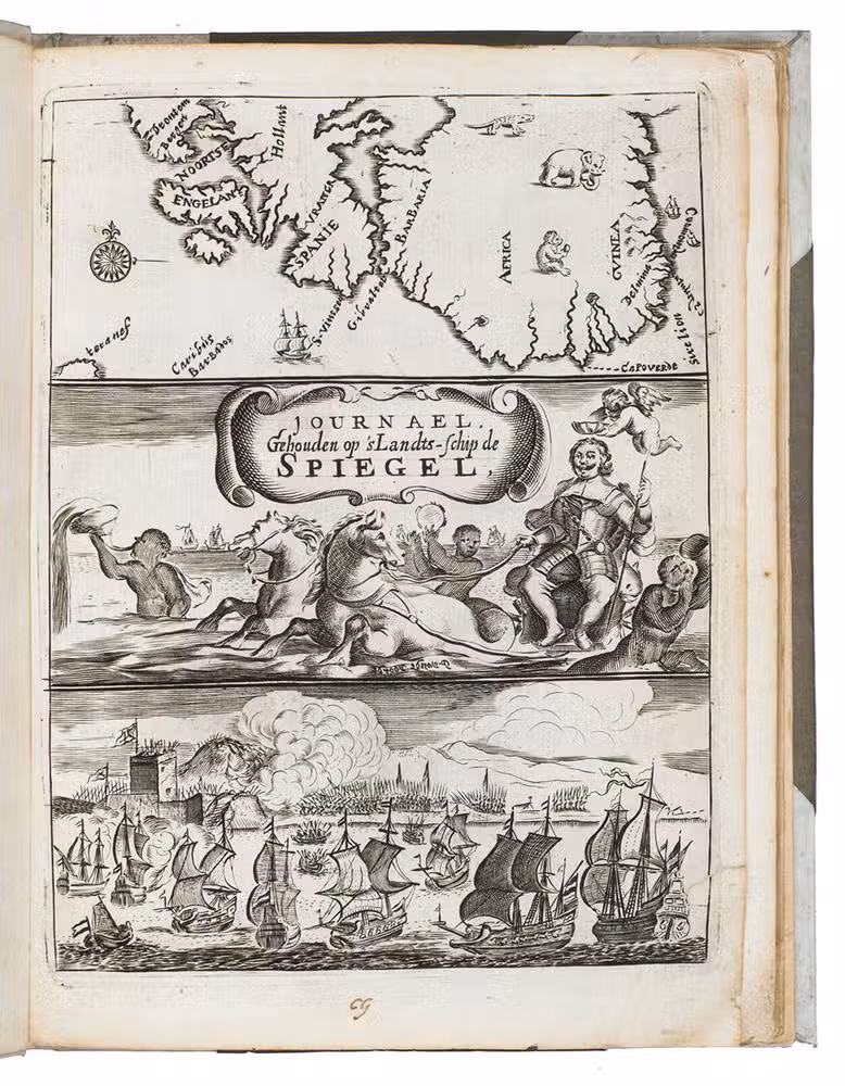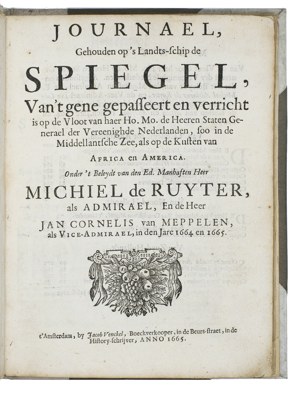 First edition of the journal of the Dutch warship Spiegel, which served as the flagship of Michiel de Ruyter (1607-1676) during an expedition to the coast of Africa, the Caribbean and Newfoundland. At the head of a squadron of twelve ships, the Spiegel had officially been sent to the Mediterranean as a martial exercise against the Barbary pirates. However, its real destination was the coast of West Africa, where the Dutch West India Company (WIC) and the English Company of Royal Adventures were fighting to control the trade in gold and ivory. In an expedition that was secretly planned by anti-English members of the States General, De Ruyter was to recapture the lost African possessions. After a diversion along the Spanish coast, the Dutch set sail to Africa where, aided by local soldiers in service of the WIC, De Ruyter retook all lost possessions. For the next mission, he was ordered to recapture Nieuw-Nederland (the New Netherlands: parts of modern New York, New Jersey and Delaware), which had recently been captured by the English. The squadron sailed to the Caribbean, where they captured sixteen English merchant ships. They abandoned plans to conquer the New Netherlands, perhaps for fear that it might be defended by a powerful English fleet, so after damaging the English fishery near Newfoundland, De Ruyter triumphantly returned home to the Netherlands.