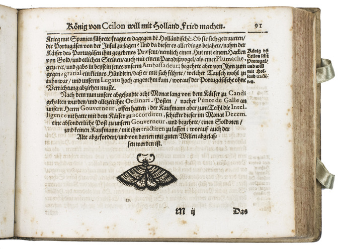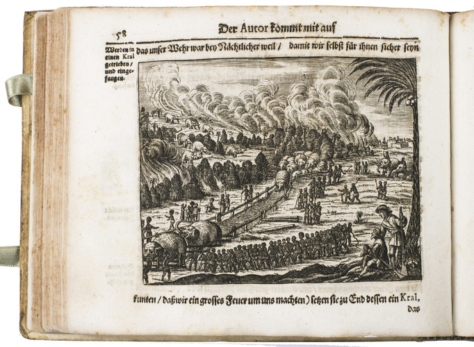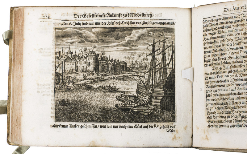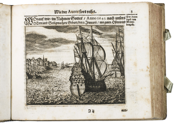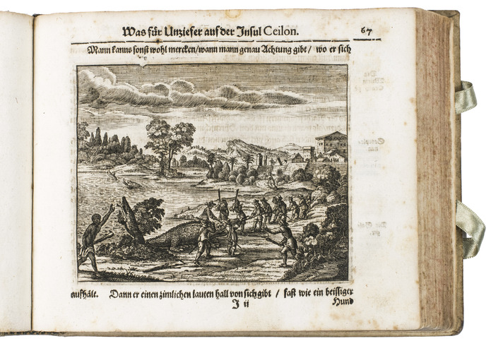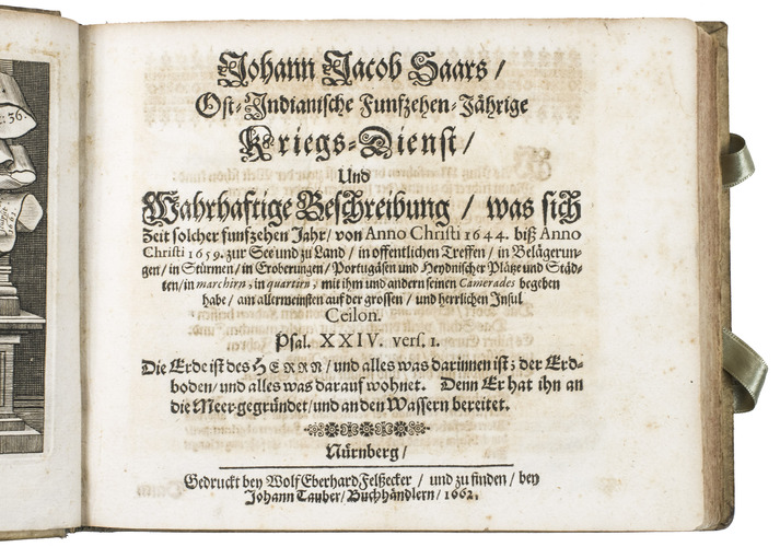 Johann Jacob Saar (1625-1664) was a German seaman. After working in the service of the Dutch East Indian army in Bantam, Batavia, and the Moluccas, Saar moved to Ceylon in 1647, which he describes most extensively, though he also covers Java, Batavia, the Banda islands, etc. He describes Ceylons trees and fruits, wild animals (including the hunting of crocodiles, depicted in 1 plate). He also gives more cultural-anthropological and historical information, such as how the natives treat their sick and dead people, how the king of Ceylon wanted peace with the Dutch, and he comprehensively describes the local practice of elephant hunting, which is beautifully illustrated in three plates. These illustrations, like the others, underline the diversity of the narrative. He and his crew then sailed from Ceylon to the coast of Goa. He describes how the Portuguese tried to capture a silver-fleet from the Japanese, but he also describes a sea battle off the coast of Goa between the Dutch and the Portuguese. On their way home, Saar visited and described Cape Town too, including Table Mountain, depicted in one of the plates.