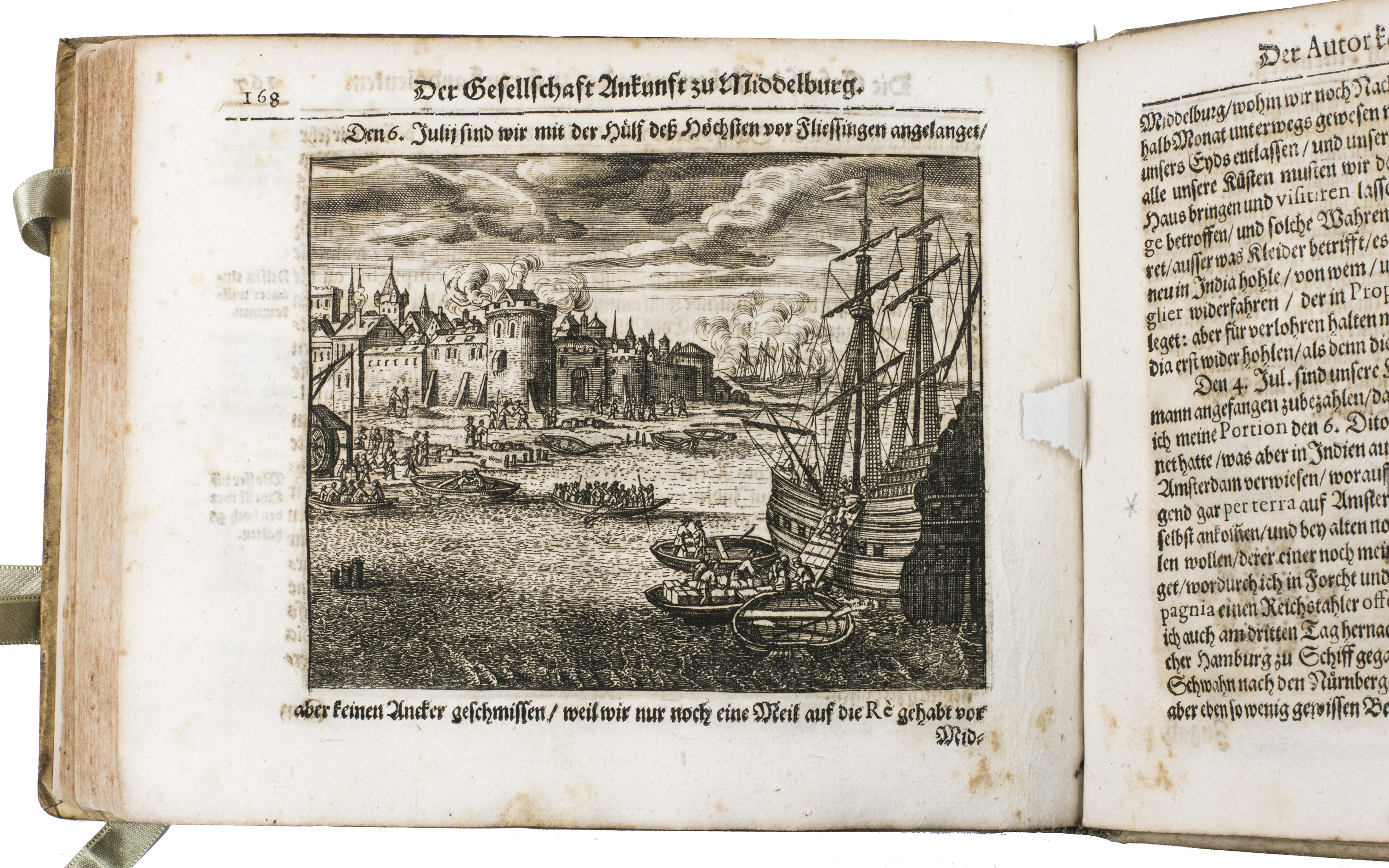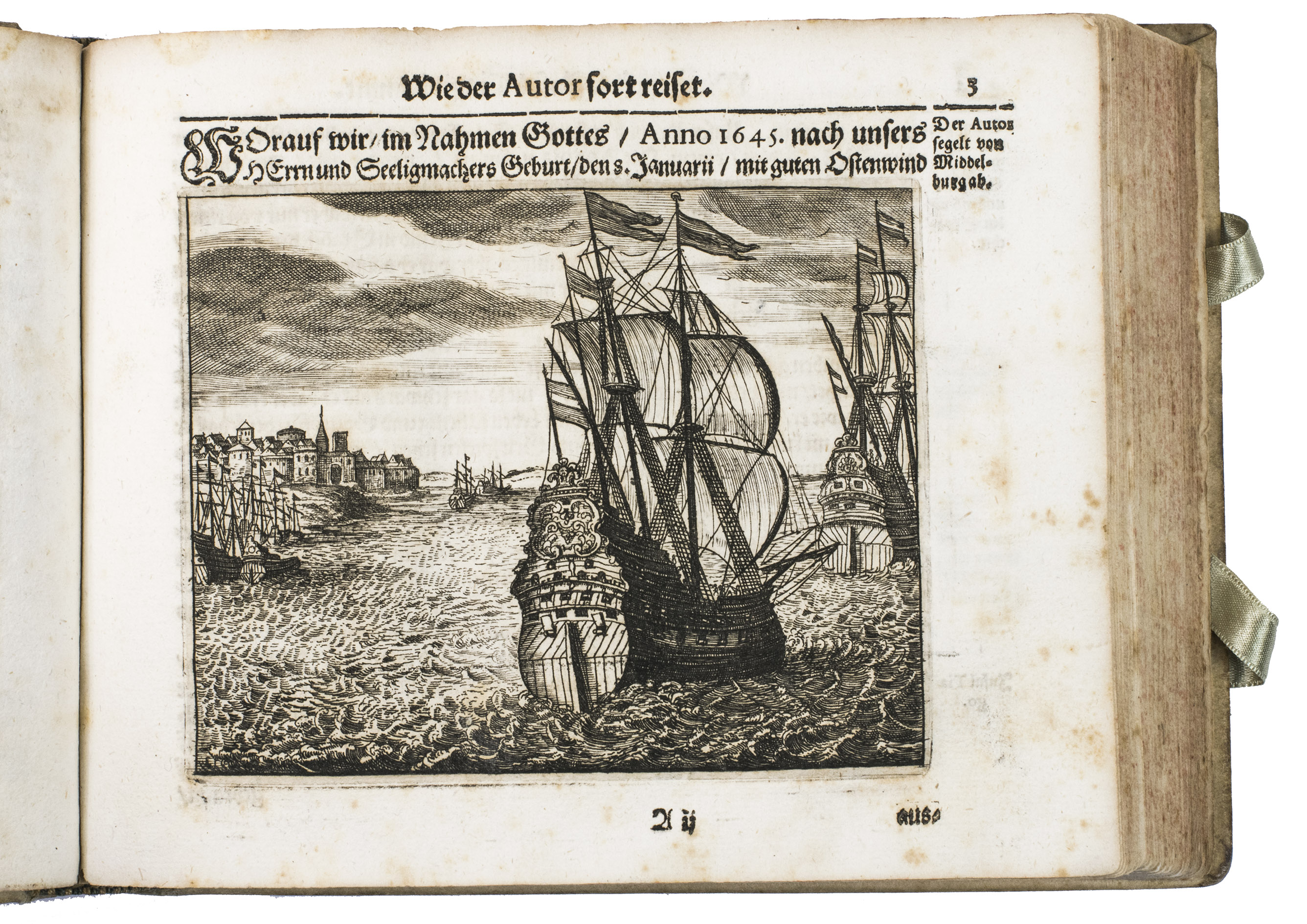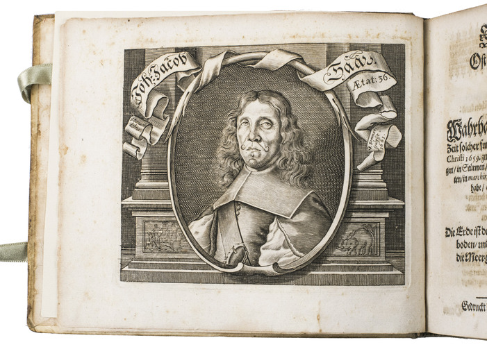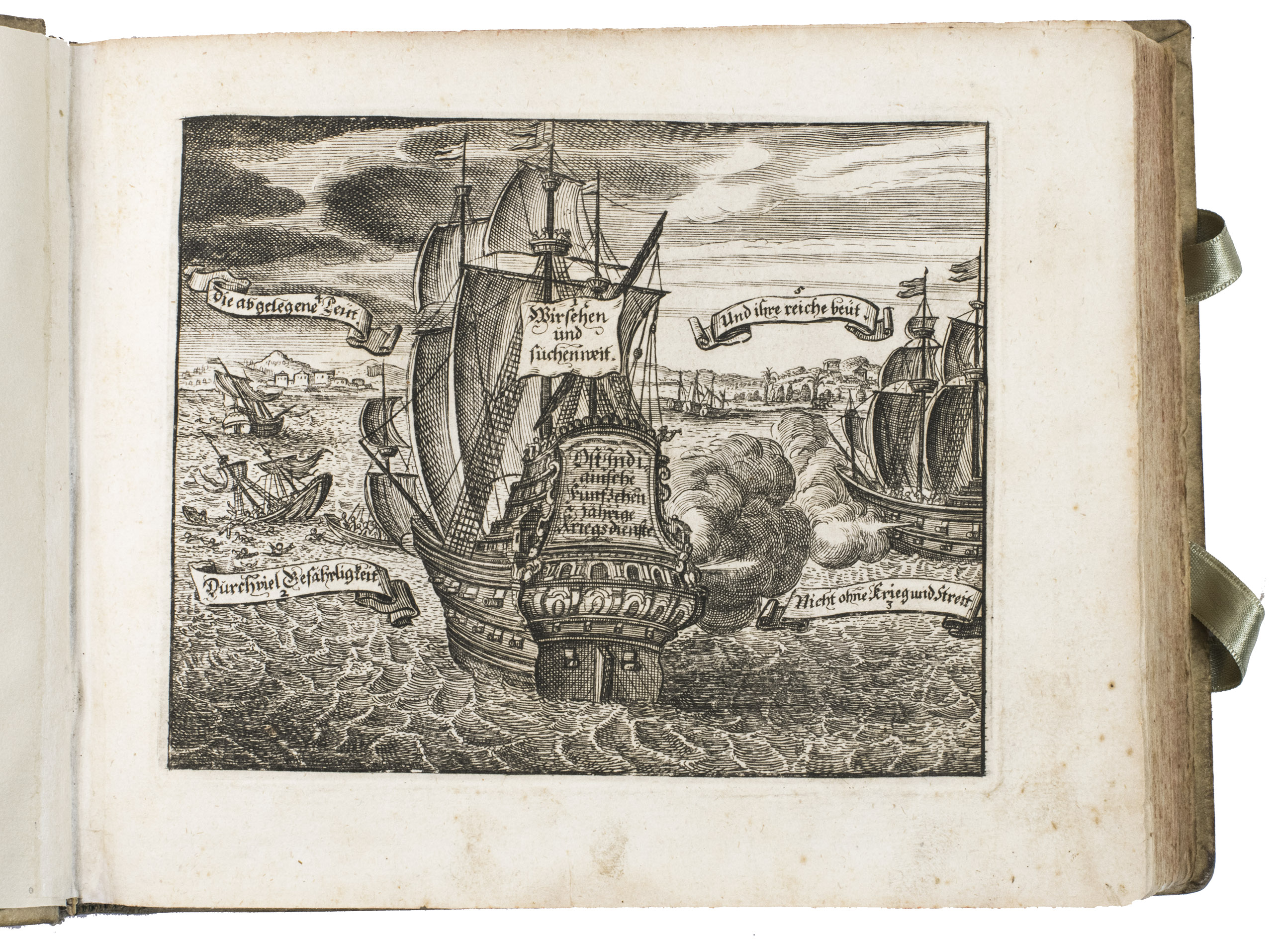 Nuremberg, printed by Wolfgang Eberhard Felssecker and sold by Johann Tauber, 1662. Oblong 8vo. With an engraved title page of a ship engaged in a sea battle, an engraved portrait of the author, and 15 engraved plates. Further with woodcut tailpieces, woodcut decorated initials, and headpieces built up from typographic ornaments. Set in fraktur type with incidental schwabacher, roman, and italic. Contemporary vellum. [12], 50, 170, "20" [= 18], [12] pp.