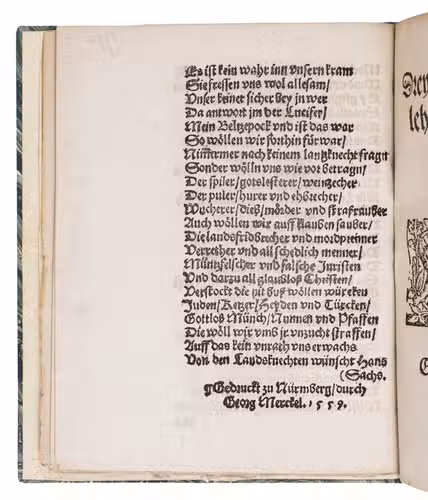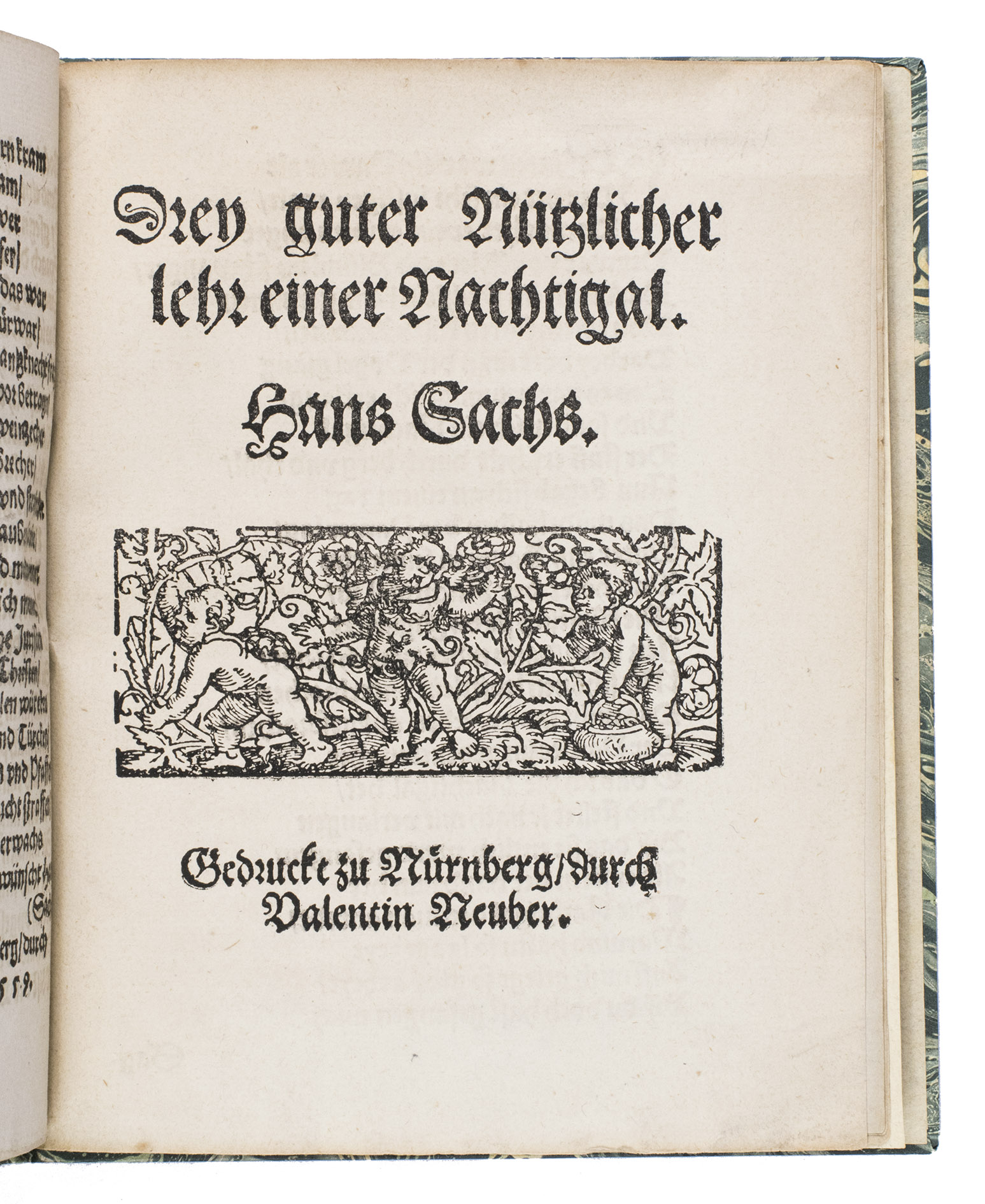 Ad 3 is an allegorical poem in verse, presented as a conversation between a peasant and a nightingale. It is based on Heinrich Steinhowel's translation of Aesop's The hawk and the nightingale (1476). Sachs' work was first published in 1555 and is here present in second edition. The woodcut on the title page was used as the lower border of a title page by Eberhard Schon; it shows three putti harvesting fruit amidst rose vines.