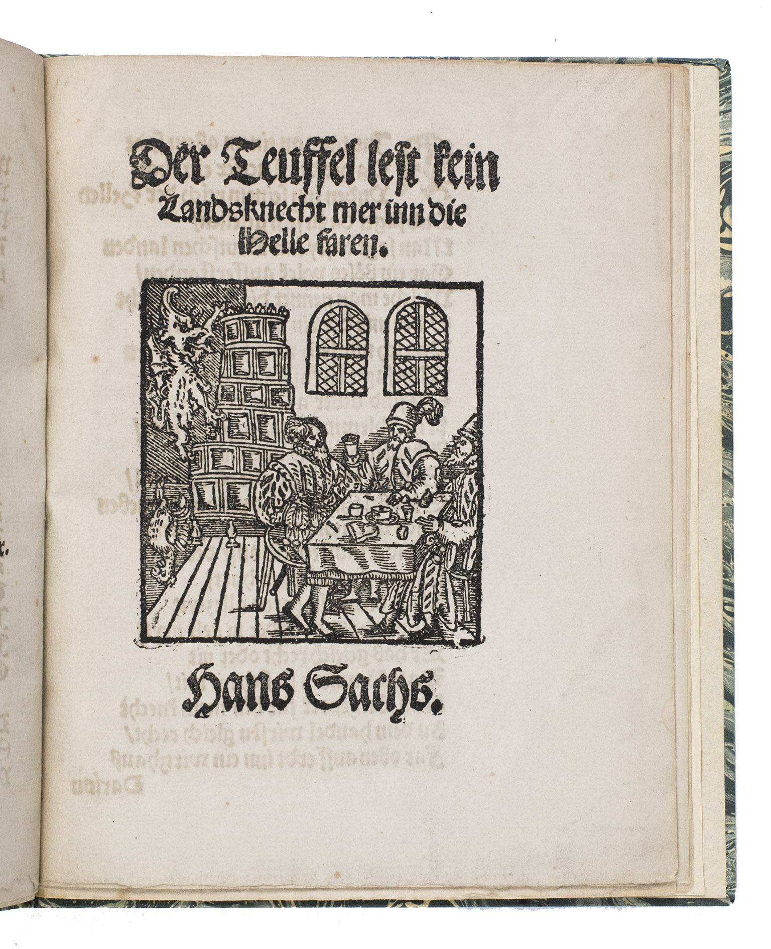 Ad 2 is a rare work on the crude and extravagant behaviour of the Landsknechts (German mercenaries). The woodcut vignette on the title page shows the devil hidden behind a stove, eavesdropping on three Landsknechts sitting at a table. The work was first published in 1555. The present edition is the fourth.