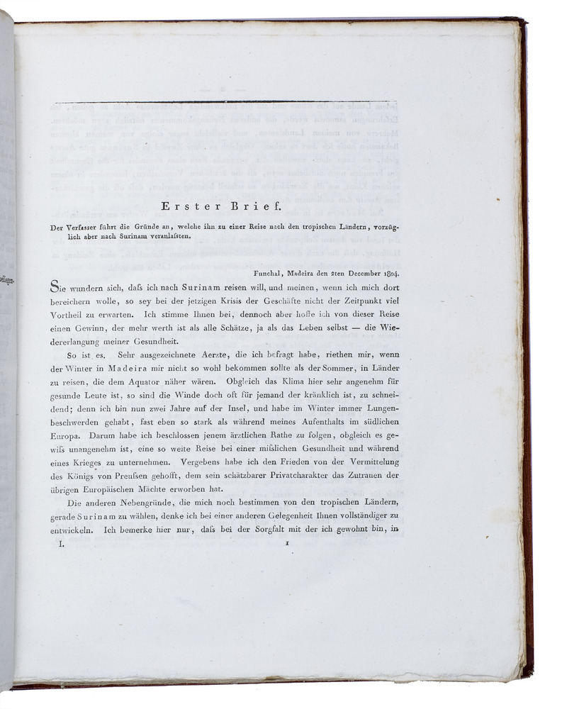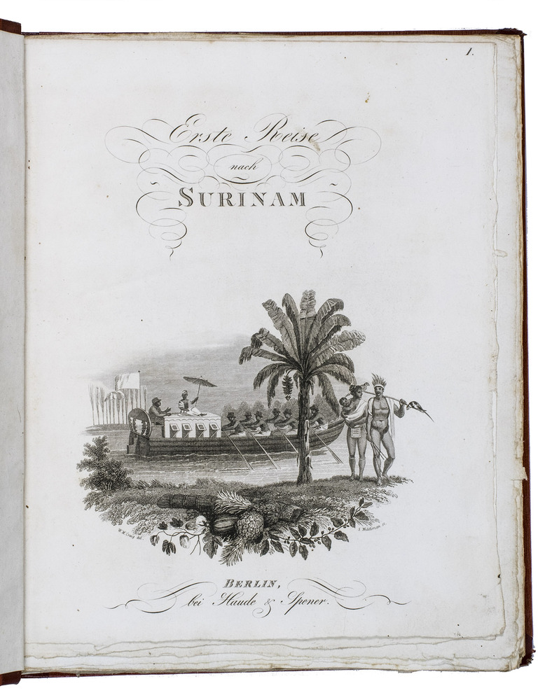 Second German edition, uncut and with wide margins, of this illustrative account of two journeys to Surinam and, on his way back to Europe, the east coast of America. The first German edition was published in Berlin in 1818. The first part, although originally written in German, was in fact first published in English with the title: A Narrative of a voyage to Surinam ... (London 1810, see Sabin 74750). A Dutch translation of this first part was published in Haarlem, in the same year as the present second German edition. The account was written in the form of 17 letters to an unknown addressee. It includes also an interesting account of the author's visit to Barbados and the cities on the east coast of America, and an appendix of 18 pages describing the plants, animals, birds, reptiles, etc. of Surinam.