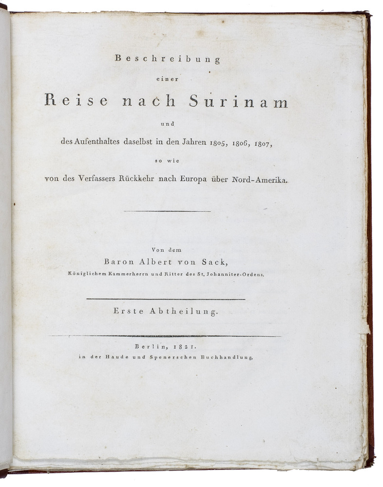 Sebastian Albert Freiherr von Sack (d. Berlin 1828), since 1821 Count von Sack, was a royal chamberlain, a knight of St. John, but above all an explorer who liked to travel. He made his first journey, described in volume 1 of the present work, to Surinam in 1805. From there, he went to North America in 1807, where he visited the cities Providence, Boston, New York, Philadelphia, Baltimore, Washington DC, and Alexandria. He made his return-journey to Germany via New York and Lisbon. Sack's second journey to Surinam, as described in volume 2, started in 1810 and ended in England in 1812. In this second volume, he describes among other things the climate, topography and geography of Surinam, its inhabitants, including the Indians and "bosnegers", the trade with foreign countries from 1700 to 1784, adding many interesting observations on slavery. Both parts are very interesting accounts of two long voyages including many letters, accounts of other authors, digressions on poisonous snakes, yellow fever, Indians in northern America, and steamships.