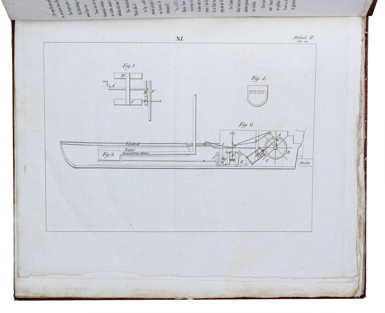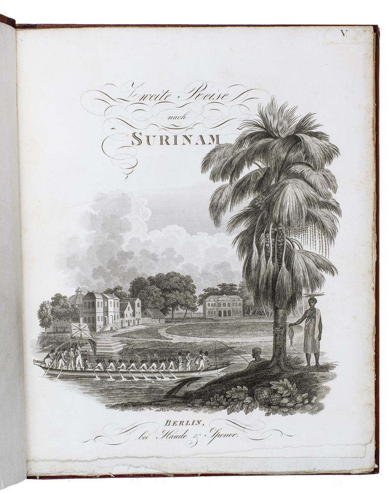 The frontispiece in volume 1 depicting the ship Jason with a dolphin hunting for a flying fish and plate IV in volume 1 of a black slave sowing cotton plants are taken from the first English edition. The other plates are engraved in Berlin and depict among other things the Governors house in Paramaribo (plate V, the illustration on the title page of volume 2), the steamer Phoenix of the second journey with a view of the city of Philadelphia in the background and two Indians in the foreground (plate VI), the map of the interior of Surinam (plate VII), the flora and fauna of Surinam (plates VIII-IX), and two plates of a steamer: plan and side view (plates X-XI).