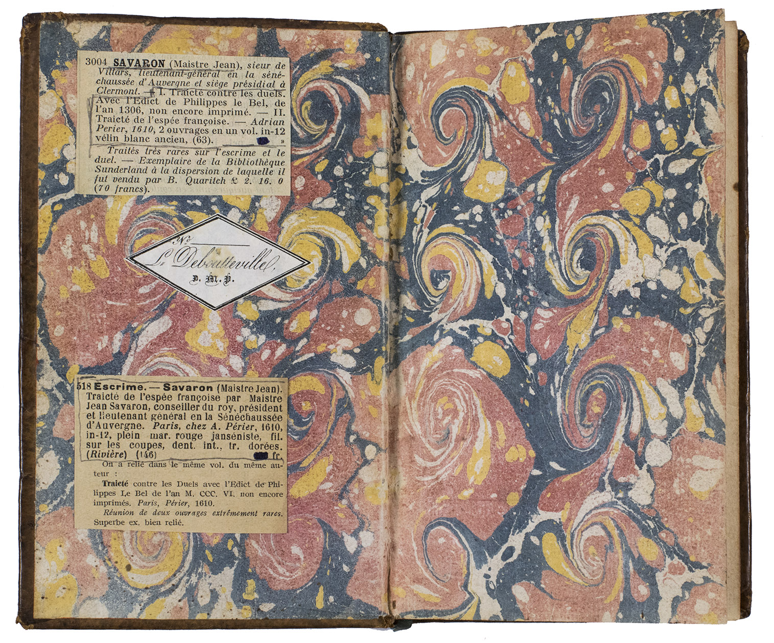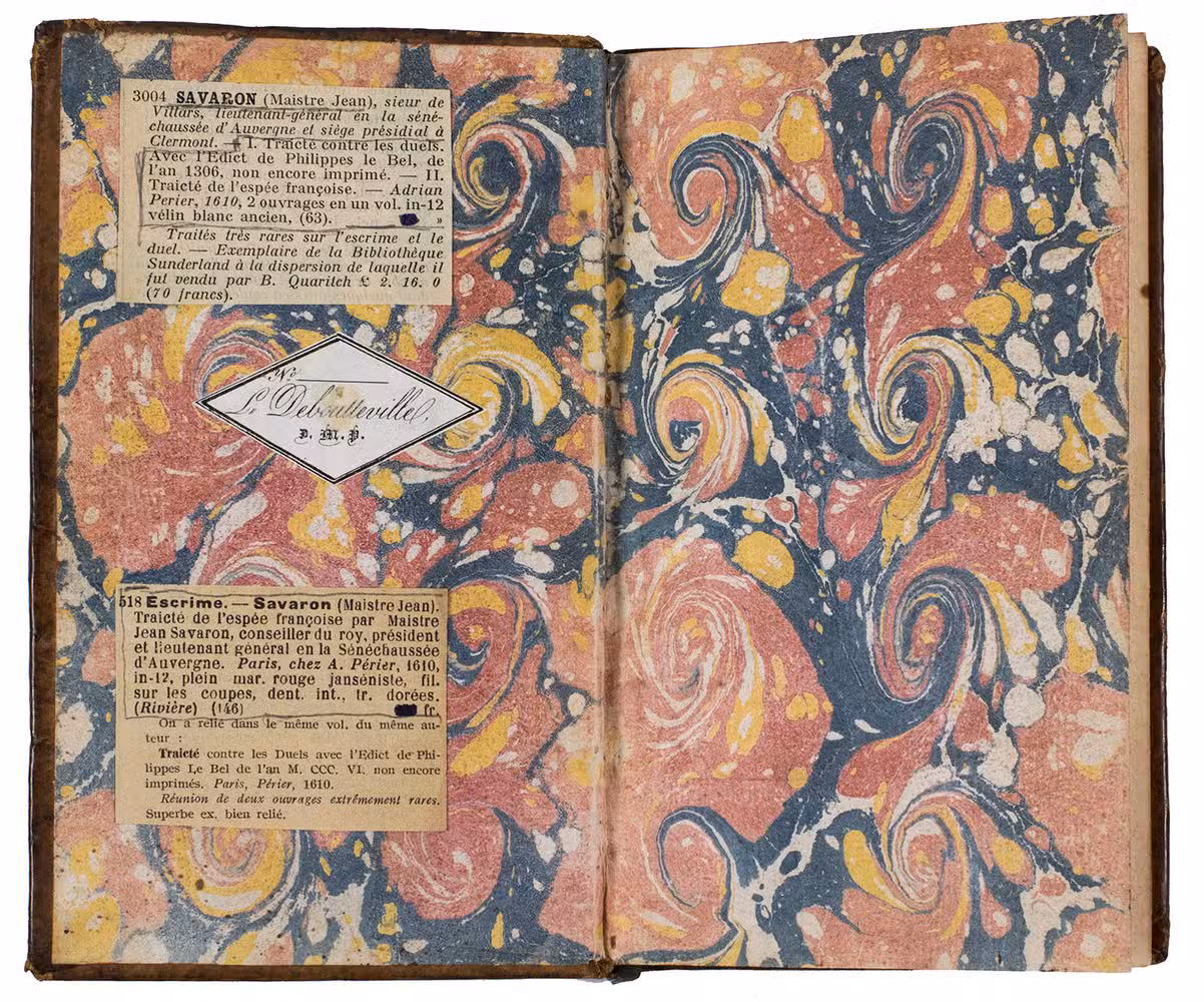 With owner's inscription of J.P. Gautin (?) including date 4 September 1610 at head of first title-page and a similar inscription shaved at head of second title-page; owner's initials "L.C. de T" in what appears to be a contemporary hand. Slightly browned, but otherwise in very good condition. Binding rubbed and spine damaged, but structurally sound and with most of the tooling clear. Two early complimentary treatises, on sword fighting and against dueling. Brunet V, col. 153 (ad 1 & 2); Cionarescu XVII, 61664 & 61665; Cockle, addendum 7 (ad 1); Levi and Gelli, p. 412 (ad 2); Thimm, p. 257 (ad 1 & 2); WorldCat (6 & 8 copies); not in Sloos, Warfare; Vigeant; for Savaron: NBG XLIII, cols. 386-387.