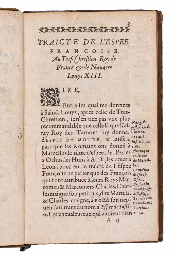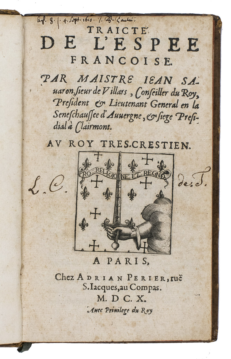 Traicté de l'espee Francoise.Paris, Adrien Périer, 1610. With engraved emblematic heraldic device on title-page (right hand holding a sword, emerging from a cloud, with crosses and fleurs-de-lis on the sword's blade and in the background, the whole representing King Louis XIII protecting France and the Church) with the motto "Pro religione et regno".