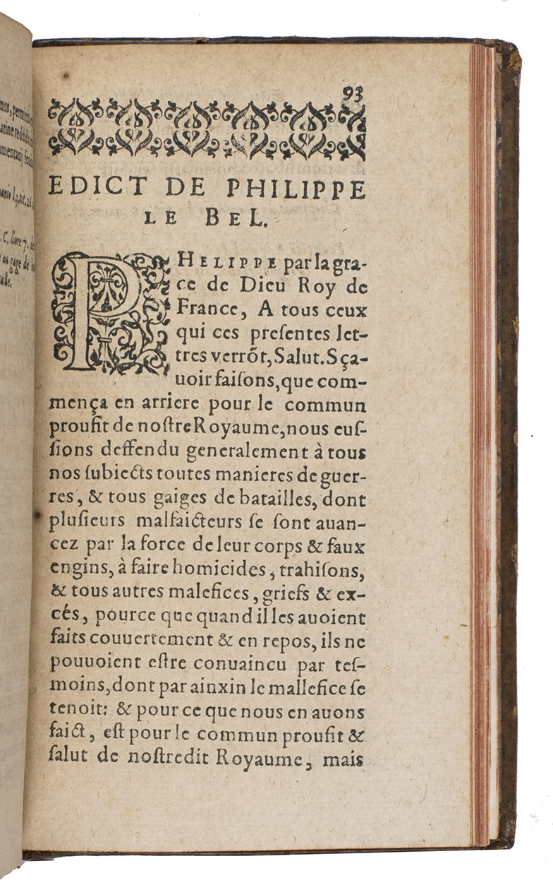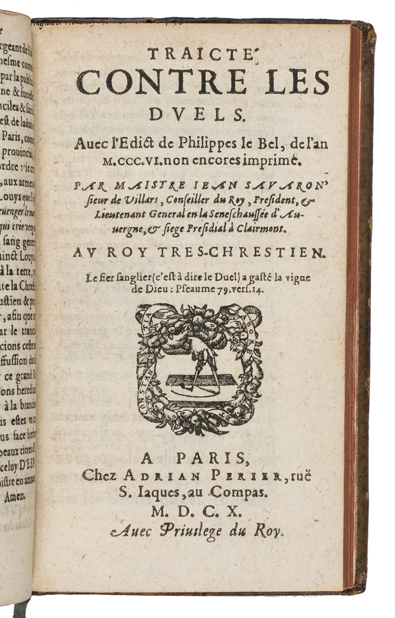 With: (2) SAVARON, Jean (Sieur de Villars). Traicté contre les duels. Avec l'edict de Philippes le Bel, de l'an M.CCC.VI. non encores imprimé.