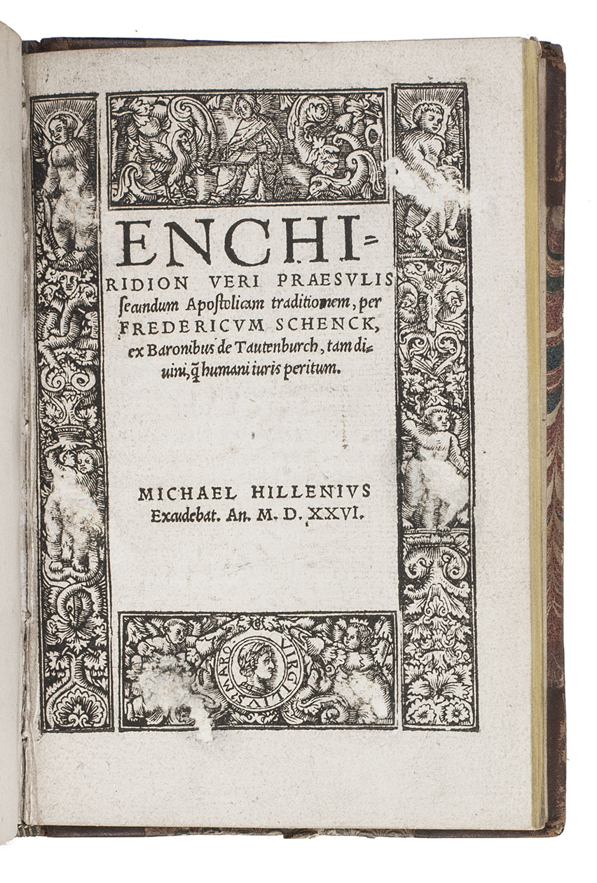 Antwerp, printed by Johannes Graphaeus for Johannes Steelsius, 1534. 4 works in 1 volume. 8vo. With the title-page of Enchiridion within a fine woodcut border, with the portrait of Virgilius Maro, and several decorated woodcut initial letters. 19th-century half calf. [48]; 72; [52]; [27], [1 blank] ll.