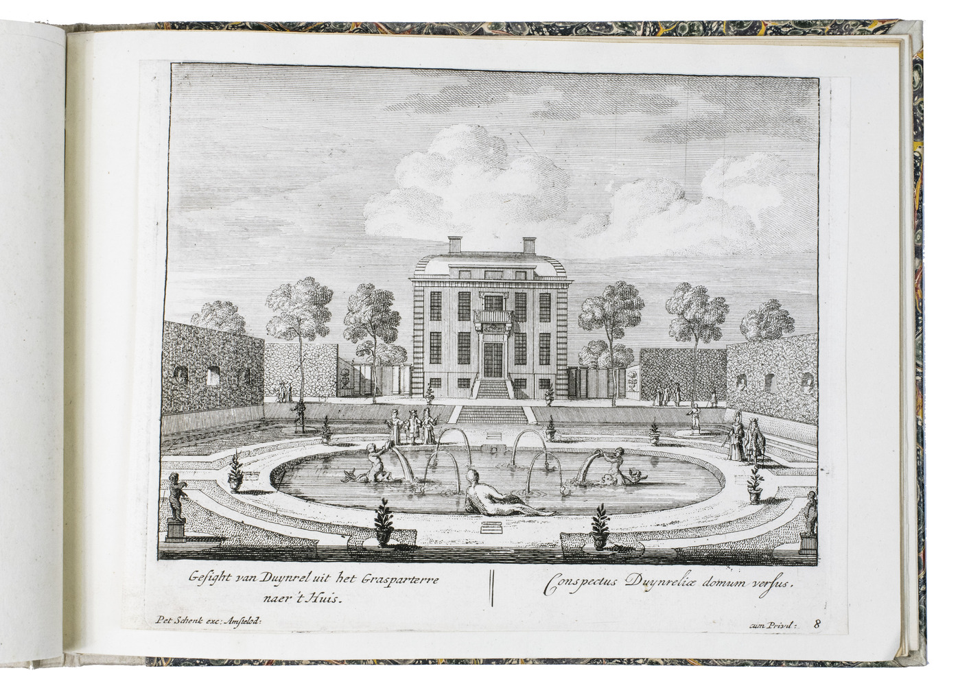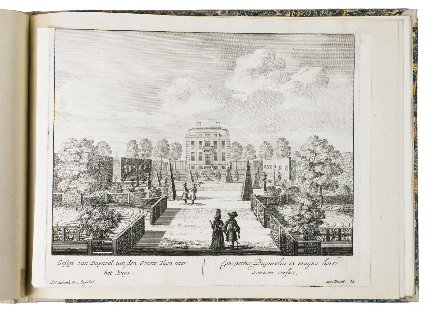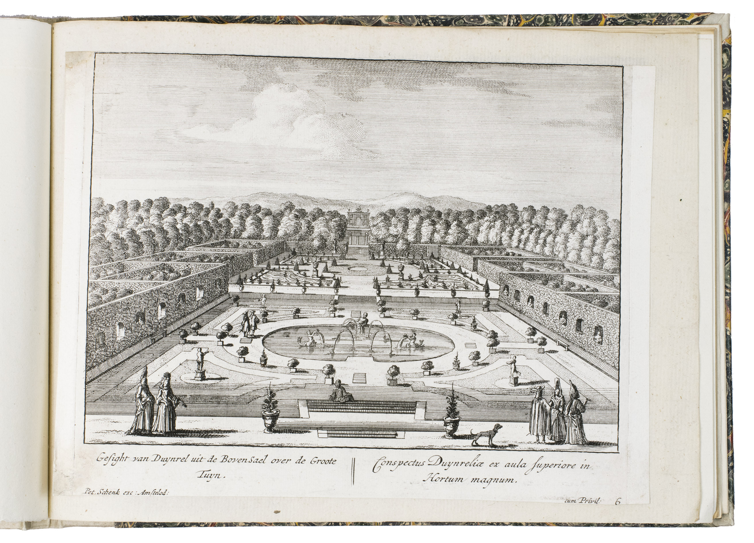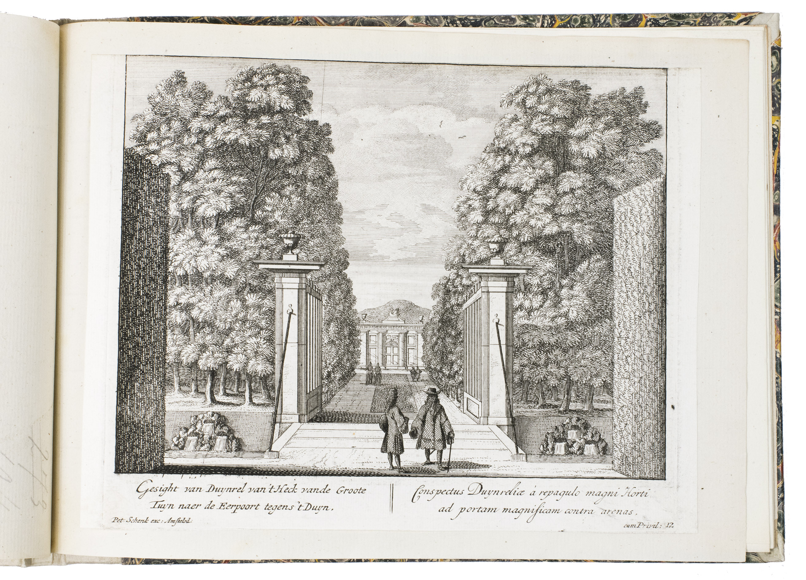 [Amsterdam, Pieter Schenk, 1702]. Oblong album (ca. 18.5 x 25.5 cm). With an engraved dedication, and 16 numbered engraved numbered views (ca. 170 x 205mm) of the manor house and gardens of Duinrel in Wassenaar, near The Hague. The 16 plates each show an engraved caption in Dutch and Latin beneath the view. The dedication leaf and the 16 views (each ca. 17 x 20.5 cm) are mounted (attached only at the top of each leaf) on blank leaves (ca. 18.5 x 25.5 cm). Later half vellum, marbled paper sides. [17] ll.