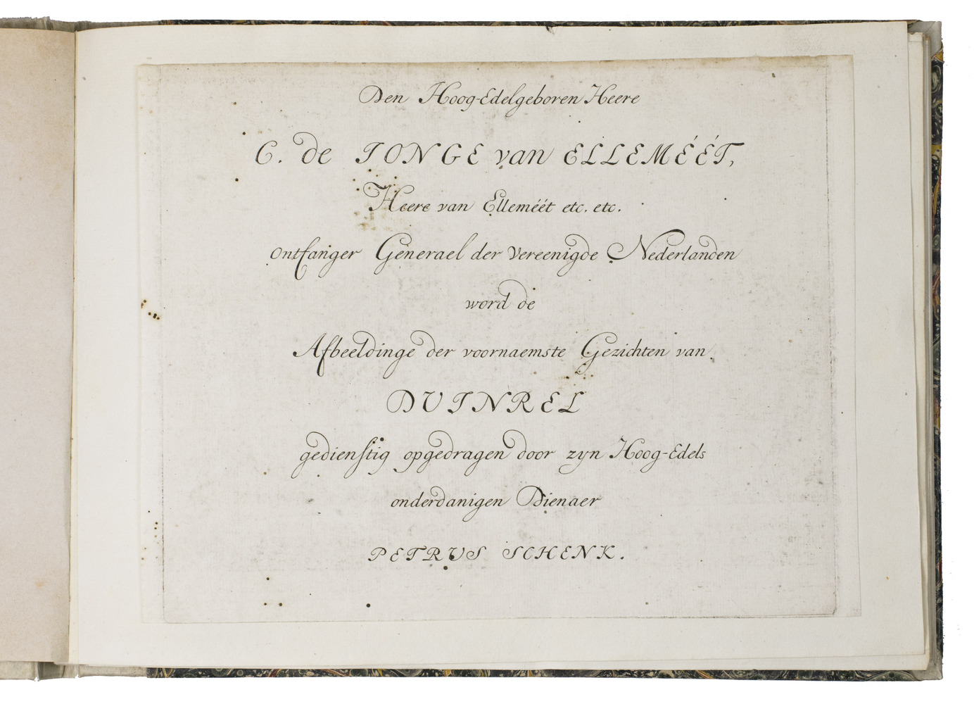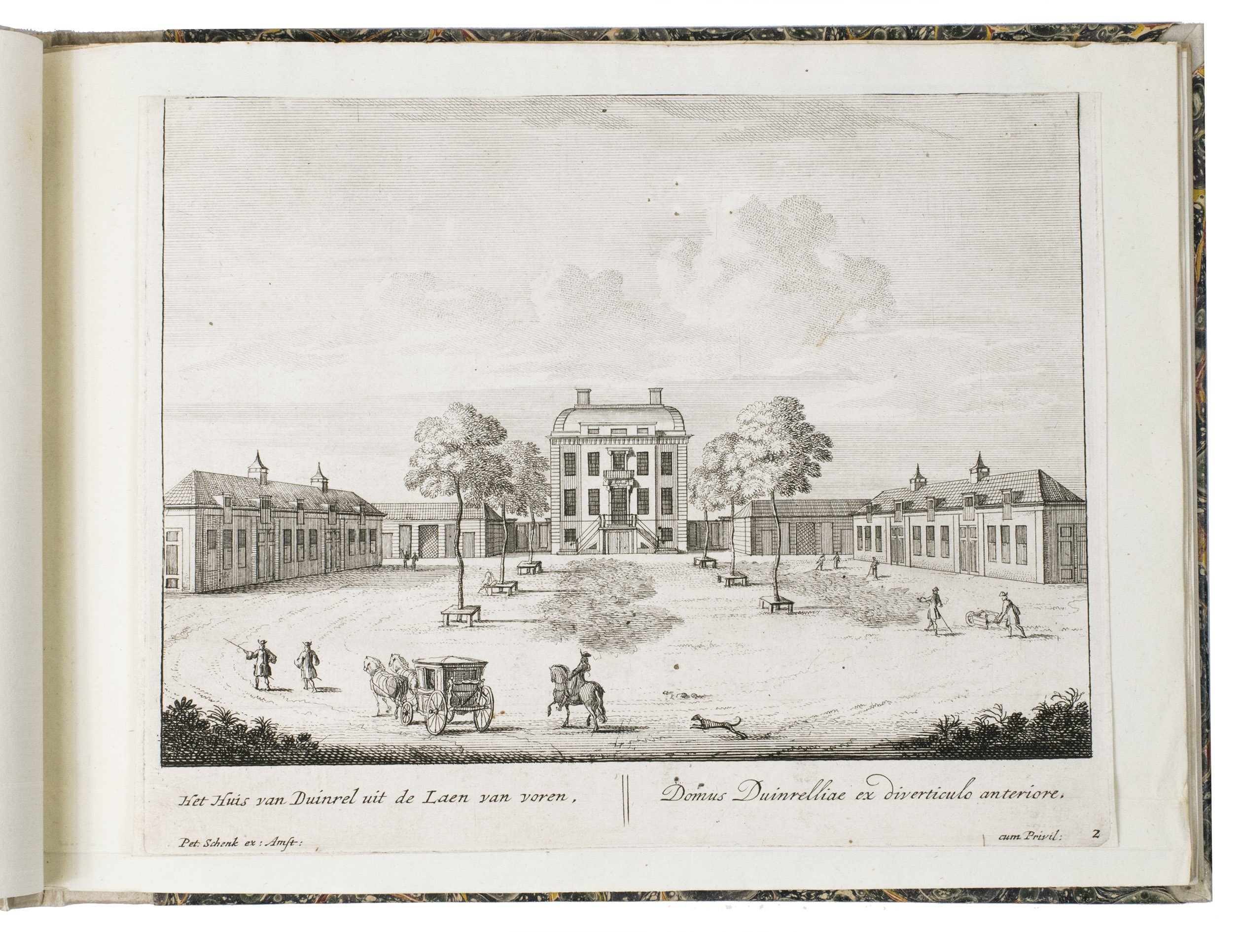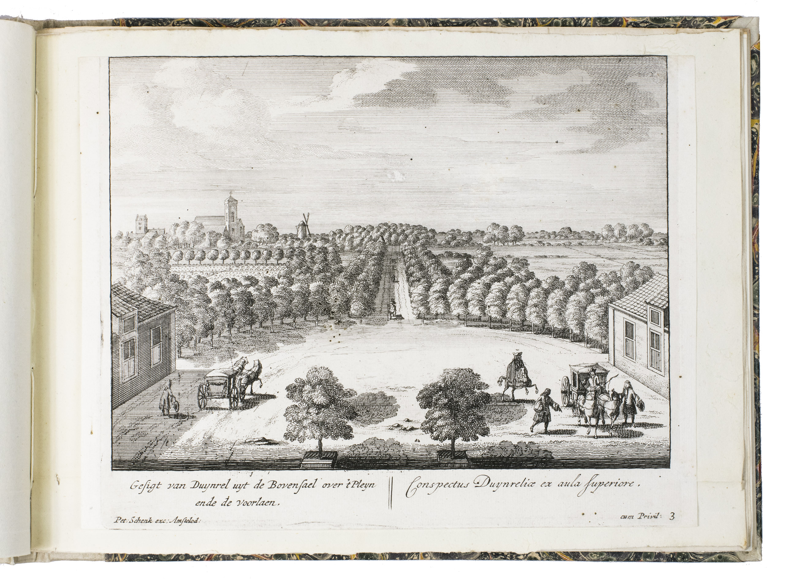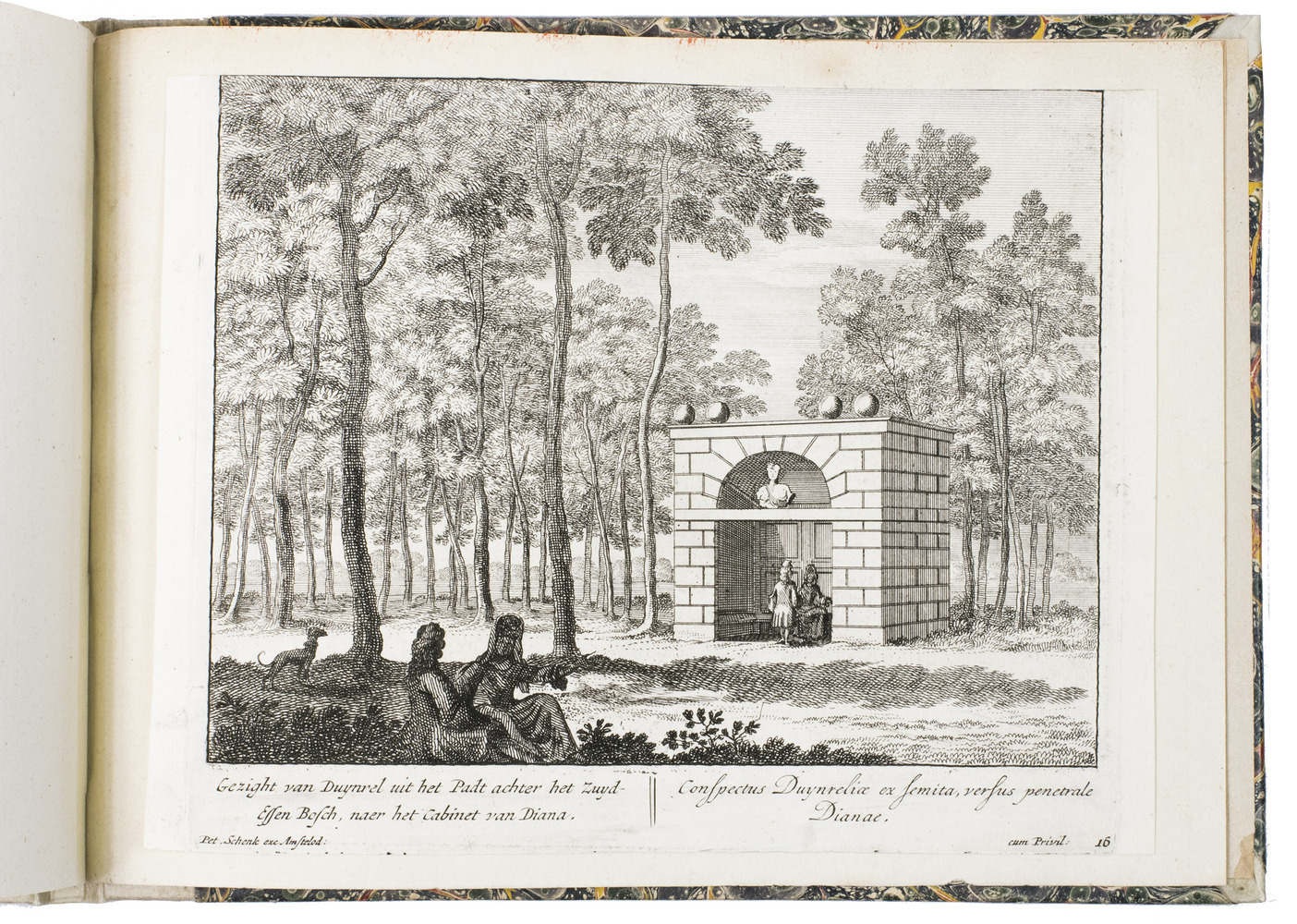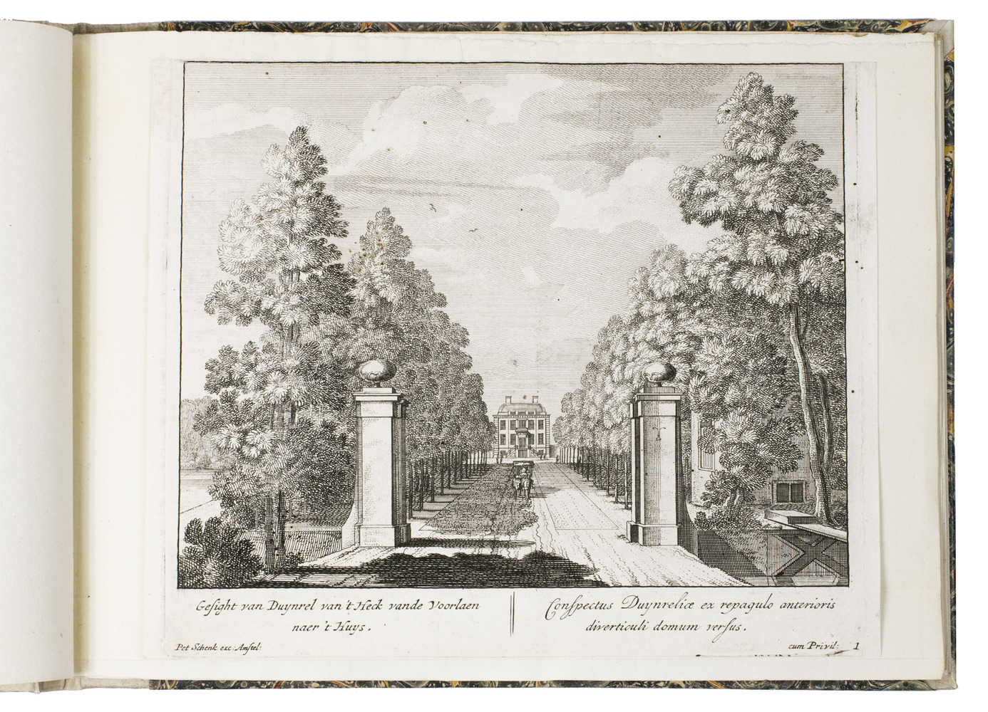 [Amsterdam, Pieter Schenk, 1702]. Oblong album (ca. 18.5 x 25.5 cm). With an engraved dedication, and 16 numbered engraved numbered views (ca. 170 x 205mm) of the manor house and gardens of Duinrel in Wassenaar, near The Hague. The 16 plates each show an engraved caption in Dutch and Latin beneath the view. The dedication leaf and the 16 views (each ca. 17 x 20.5 cm) are mounted (attached only at the top of each leaf) on blank leaves (ca. 18.5 x 25.5 cm). Later half vellum, marbled paper sides. [17] ll.