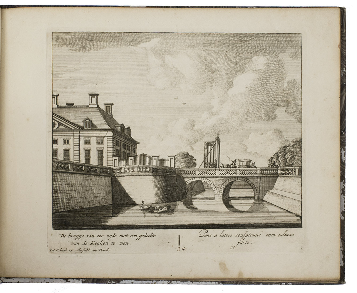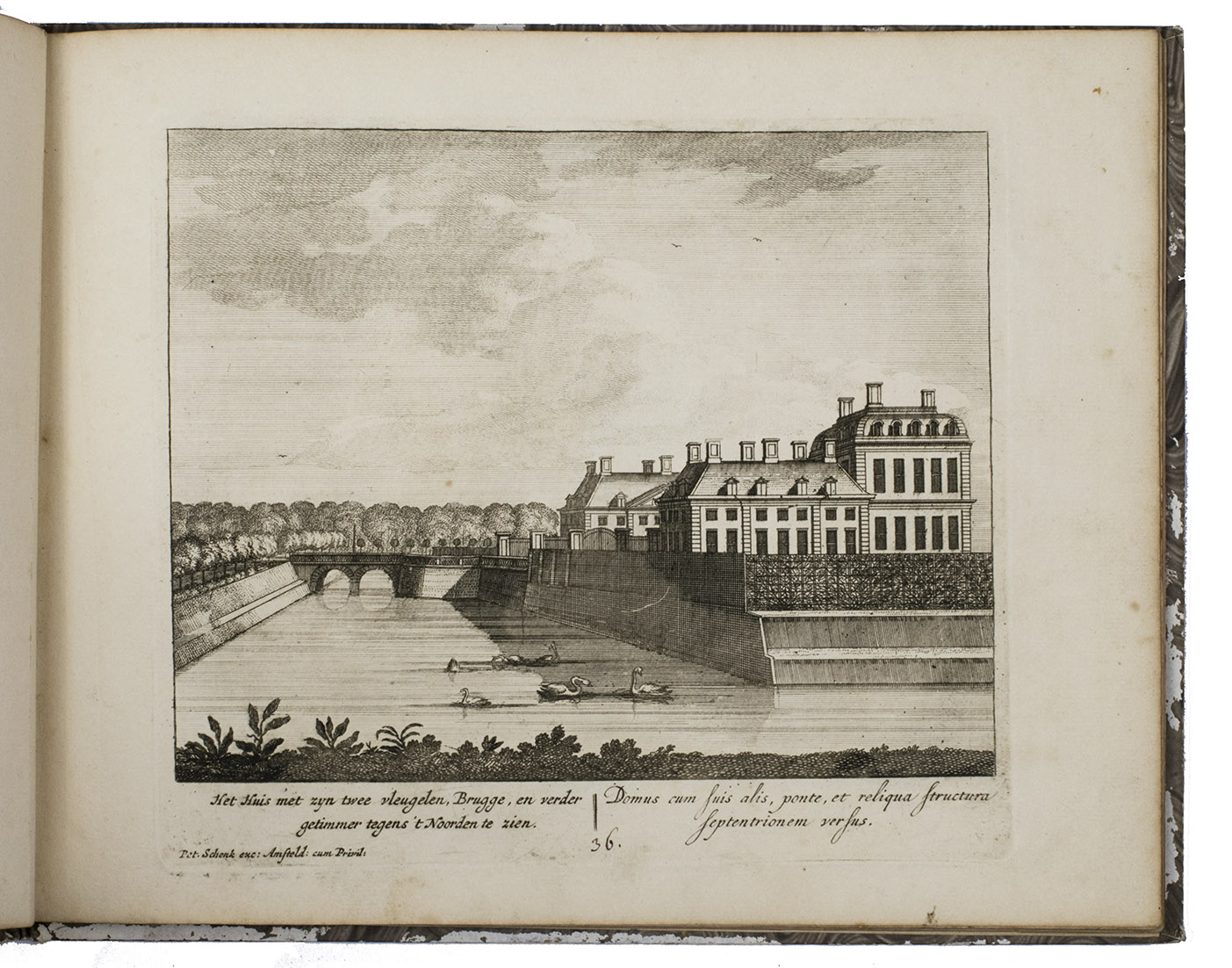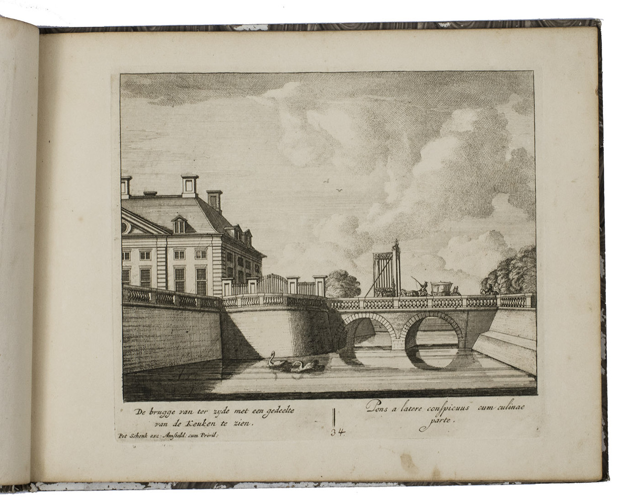 A magnificent series of 16 views of the house and gardens of "De Voorst", the country estate of Arnold Joost van Keppel (1669/70 - 1718), Baron of Ashford, Margrave of Bury and Count of Albemarle, built by the architect Jacob Roman (1640 - ca.1716). Each view has a caption in Dutch and Latin below, mostly in two lines.Van Keppel inherited the estate near Zuthphen in 1686. At the expense of King William III of England (formerly the Dutch Stadtholder Willem III), he replaced the modest buildings and grounds with the lavish palace and gardens that contemporaries dubbed "the Versailles of the Achterhoek". After the death of Van Keppel's widow the estate declined, parts were torn down in the 19th century and a fire destroyed the interior in 1943. The estate was restored in the 1950s and 1990s to the present state. Schenk's present architectural and horticultural series gives a detailed view of the buildings, gardens and fountains soon after they were built during the heyday of "De Voorst".