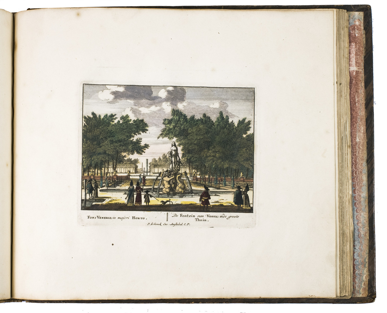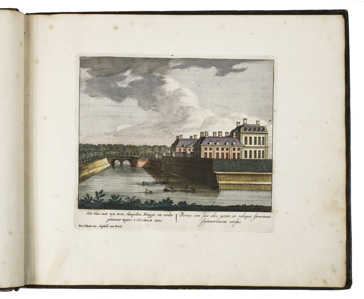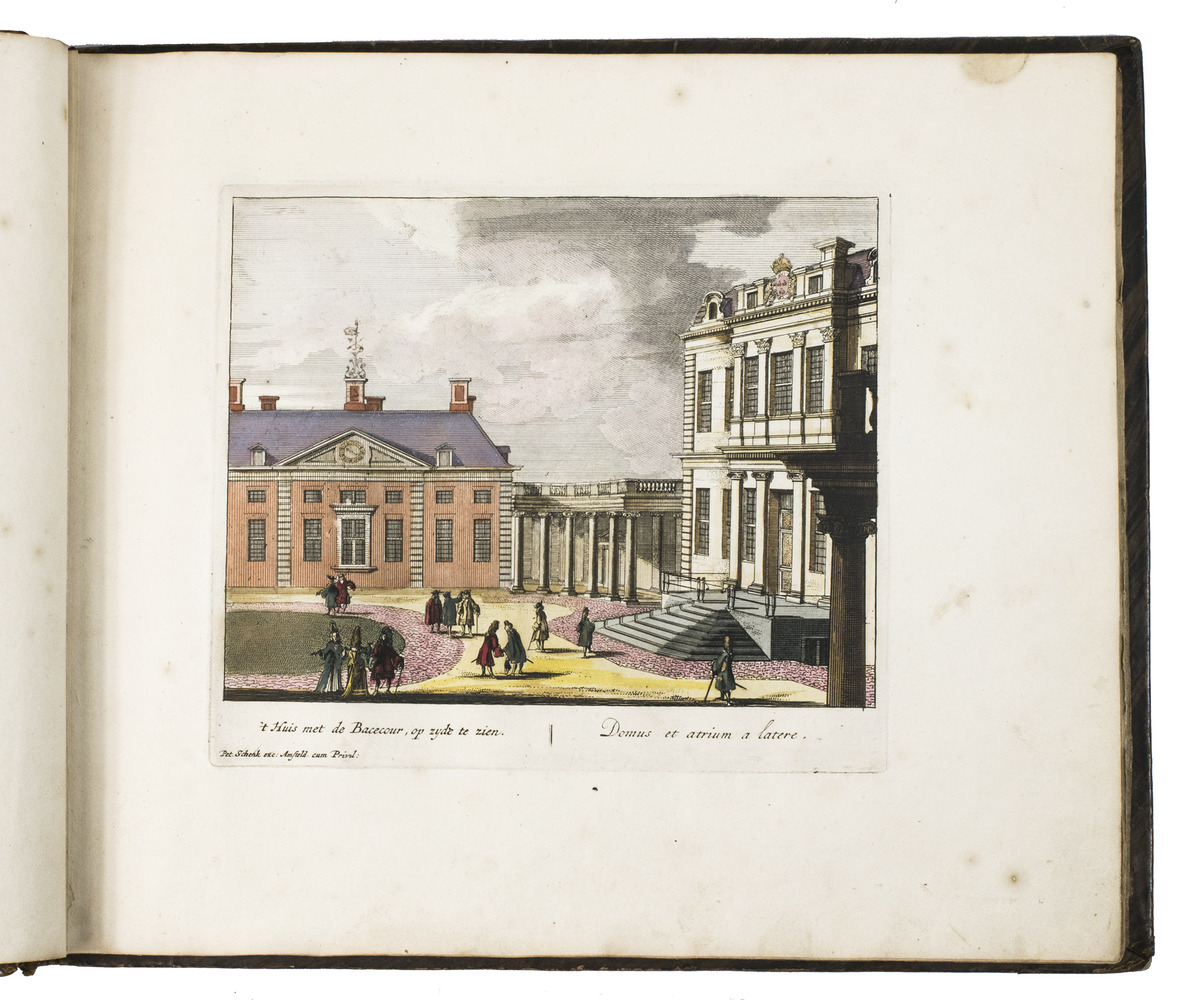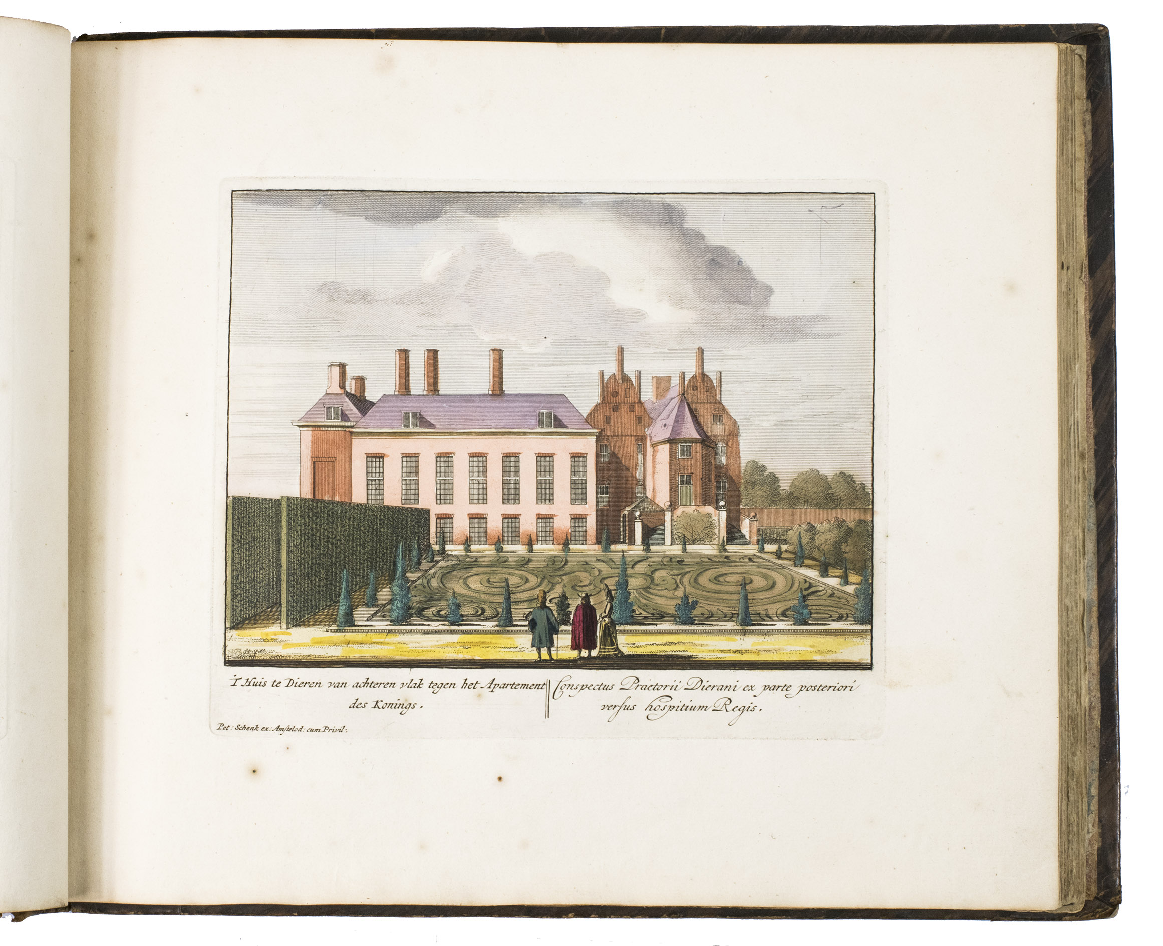 Magnificent large paper copy of series of views of some of the most sumptuous palaces and gardens of the 17th century. All the plates have been beautifully coloured by a contemporary hand. The work contains three different print series, depicting the most beloved houses and palaces of Stadholder/King William III (1650-1702) from various angles, as well as the gardens, fountains, and statuary. The 3 series were originally issued separately. The first 2, together with 4 other series, were reissued in the first part of Schenk's Paradisus oculorum in 1702, just before William of Orange passed away. However, most parts survive separately, and are now relatively rare.