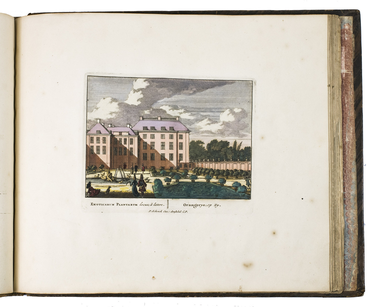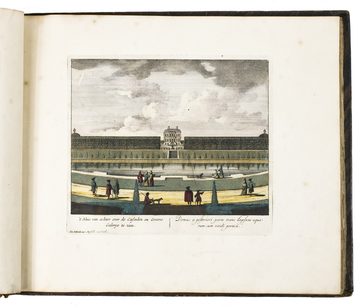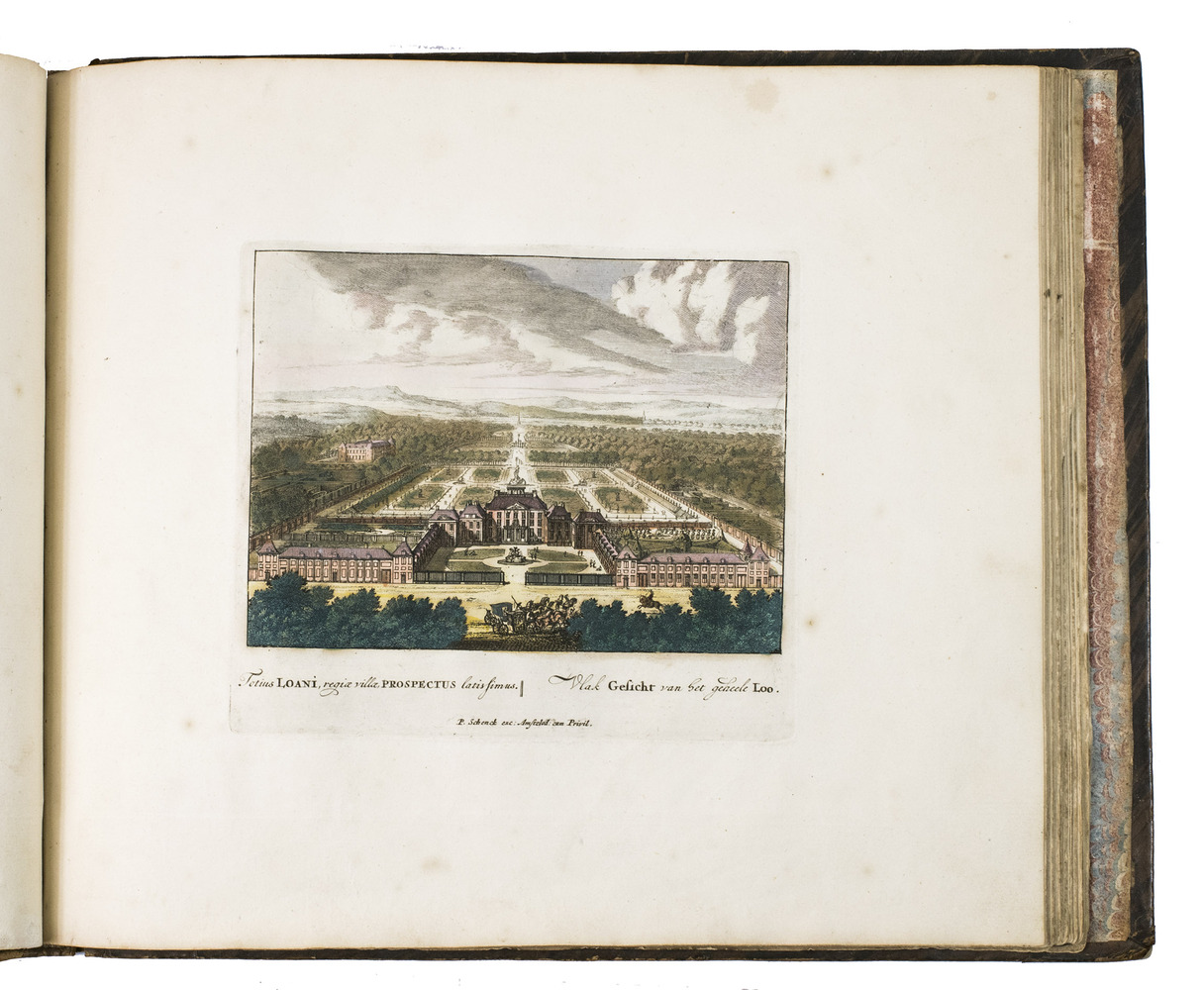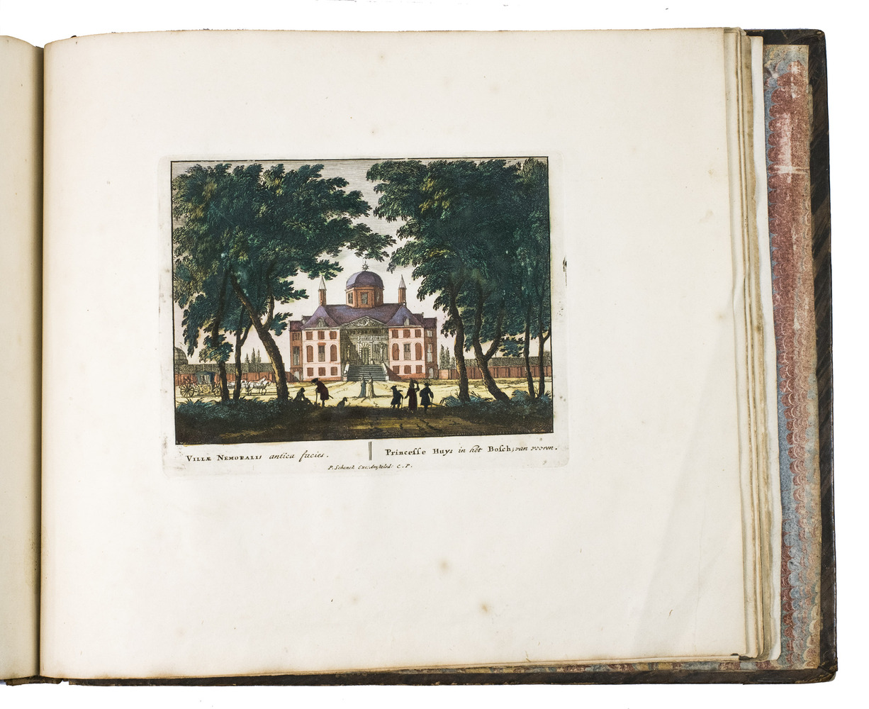 Magnificent large paper copy of series of views of some of the most sumptuous palaces and gardens of the 17th century. All the plates have been beautifully coloured by a contemporary hand. The work contains three different print series, depicting the most beloved houses and palaces of Stadholder/King William III (1650-1702) from various angles, as well as the gardens, fountains, and statuary. The 3 series were originally issued separately. The first 2, together with 4 other series, were reissued in the first part of Schenk's Paradisus oculorum in 1702, just before William of Orange passed away. However, most parts survive separately, and are now relatively rare.