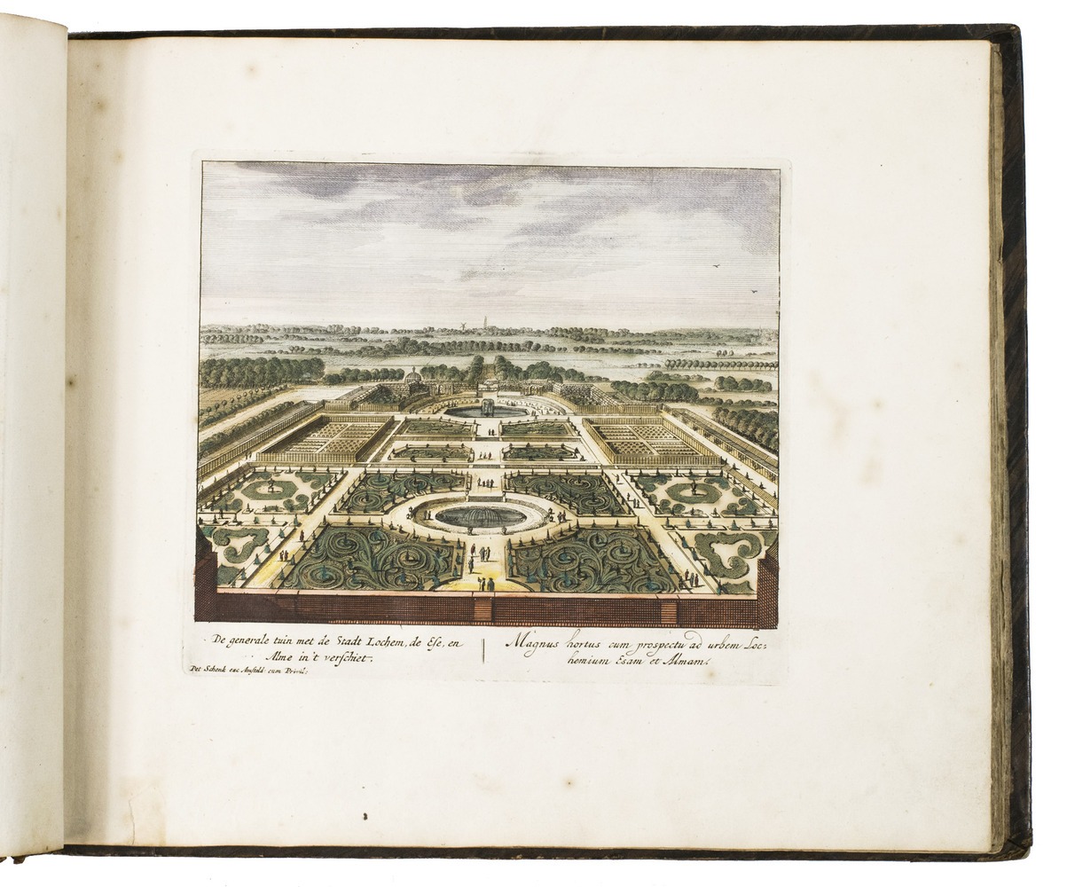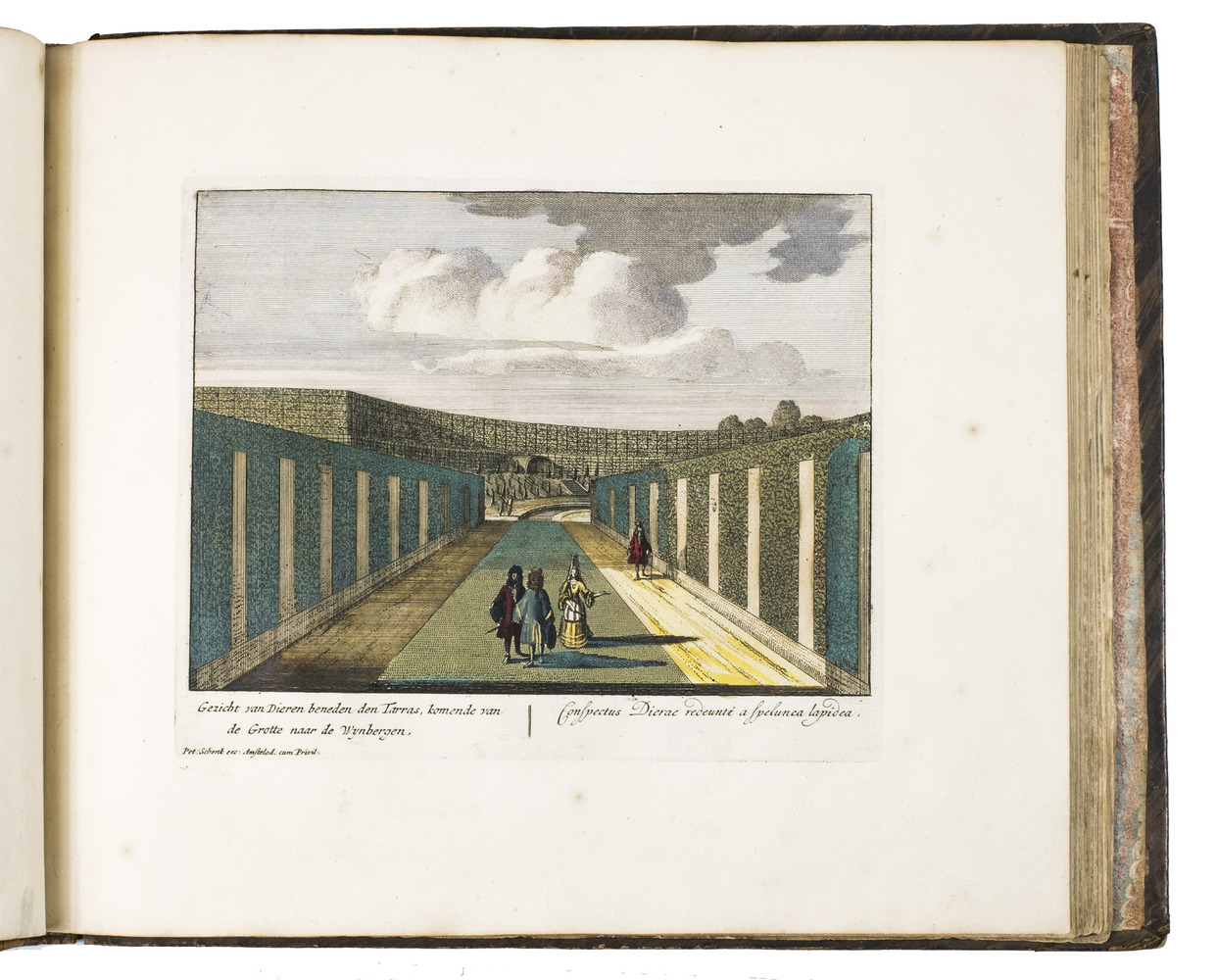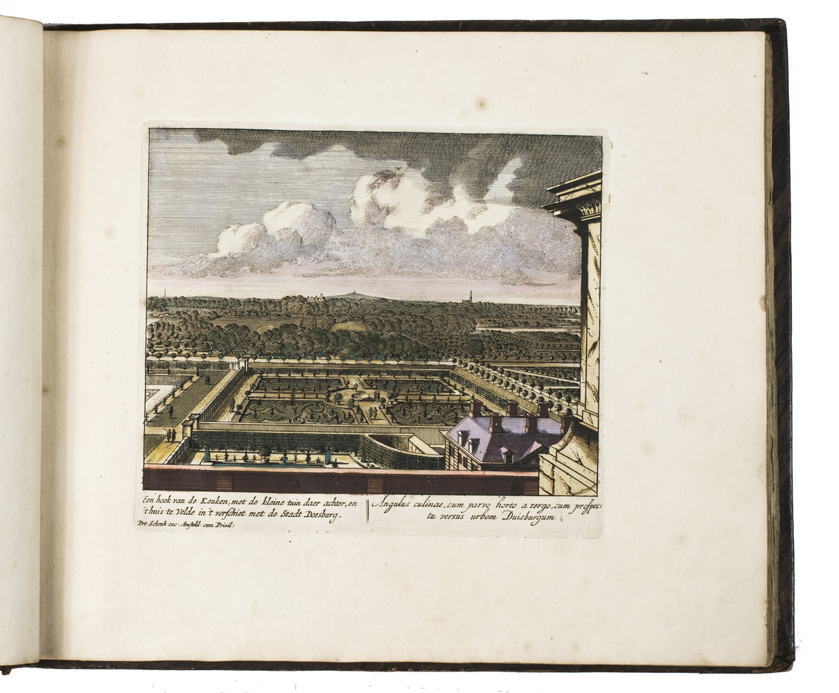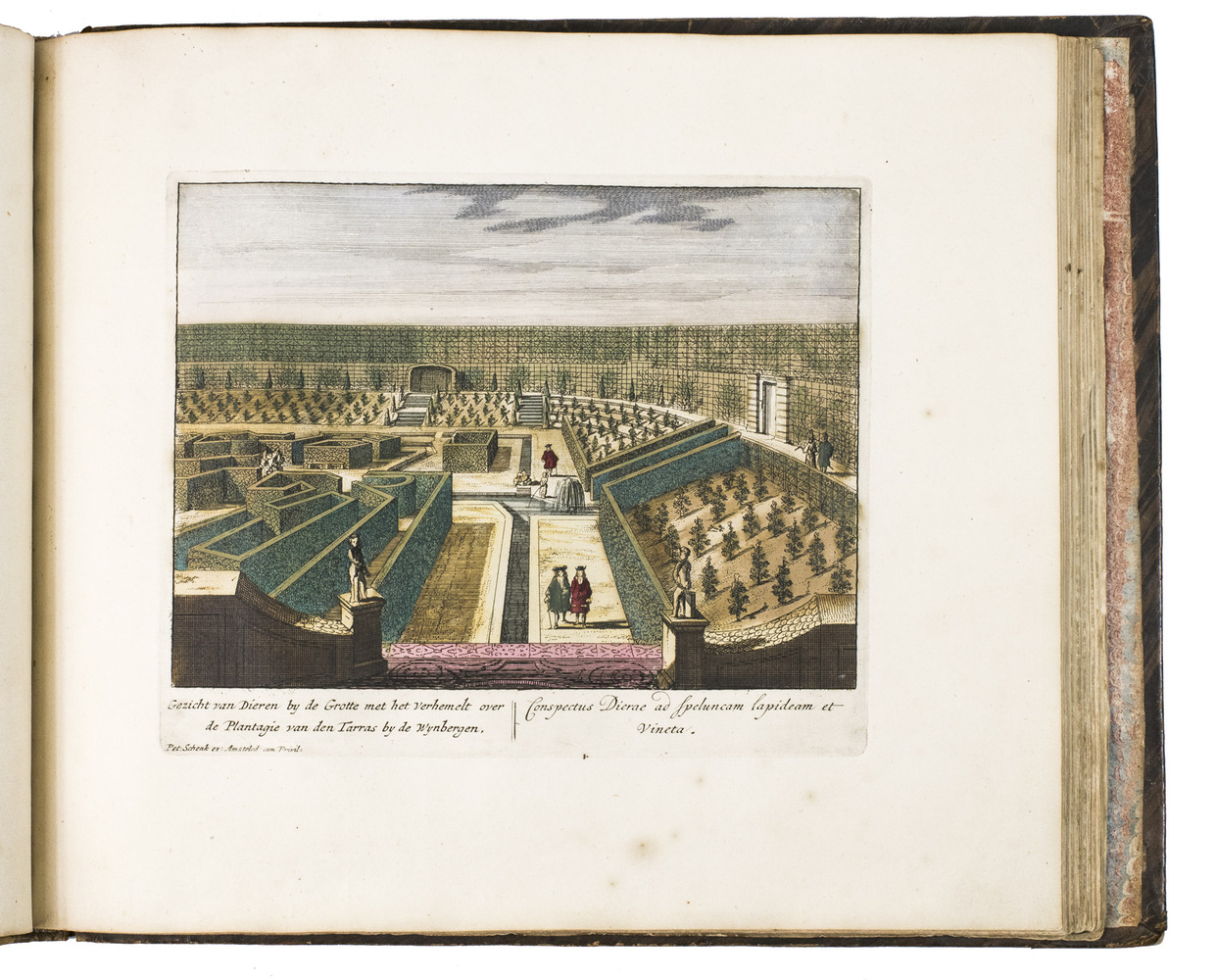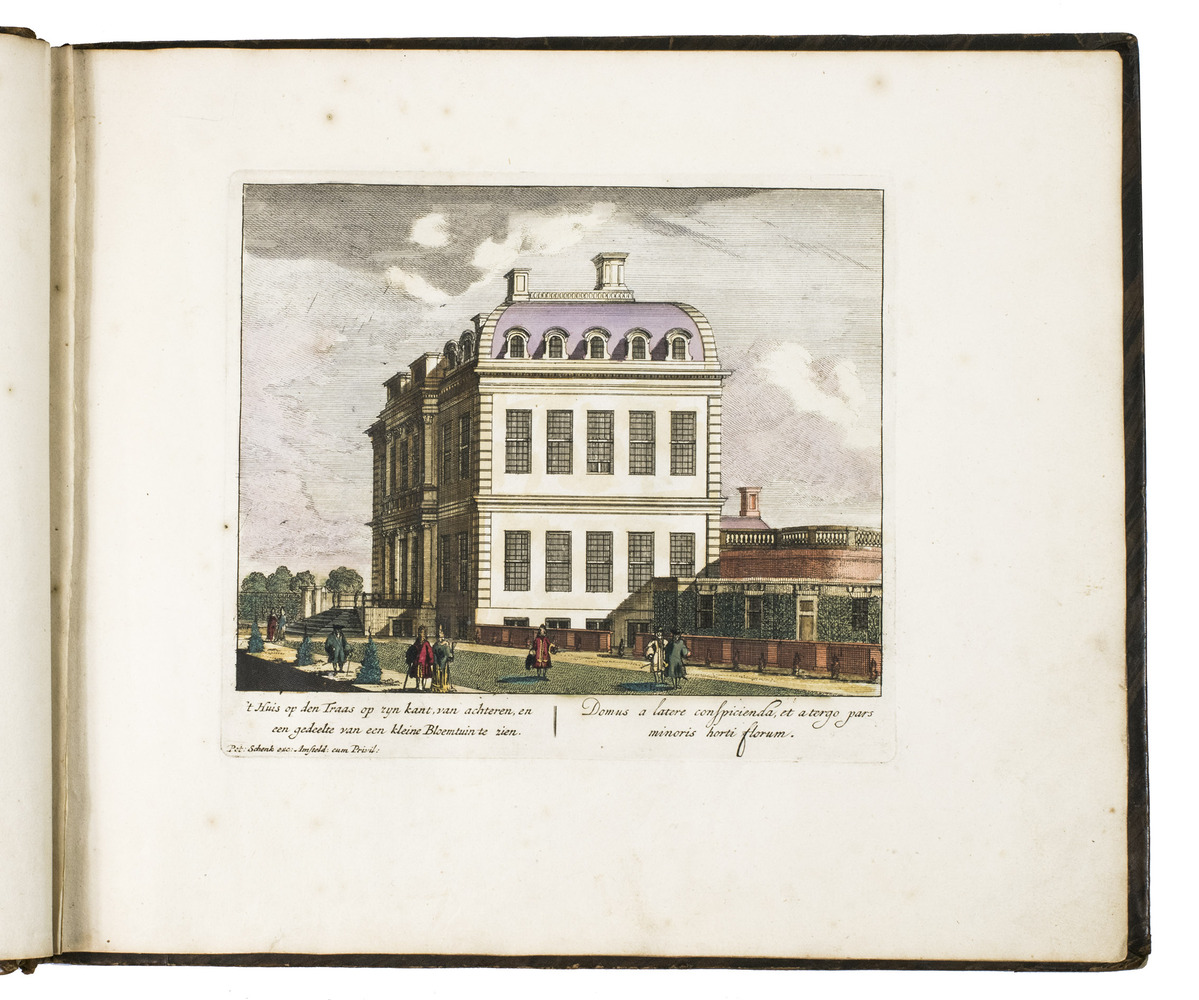 Magnificent large paper copy of series of views of some of the most sumptuous palaces and gardens of the 17th century. All the plates have been beautifully coloured by a contemporary hand. The work contains three different print series, depicting the most beloved houses and palaces of Stadholder/King William III (1650-1702) from various angles, as well as the gardens, fountains, and statuary. The 3 series were originally issued separately. The first 2, together with 4 other series, were reissued in the first part of Schenk's Paradisus oculorum in 1702, just before William of Orange passed away. However, most parts survive separately, and are now relatively rare.