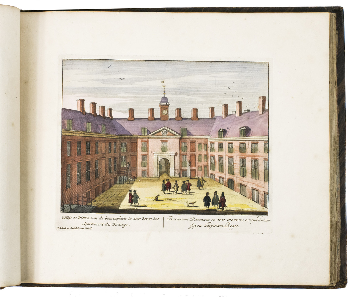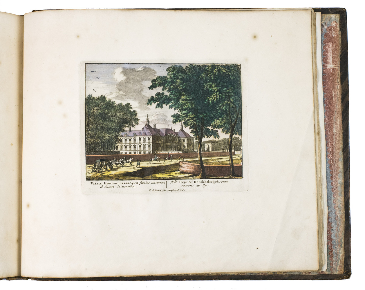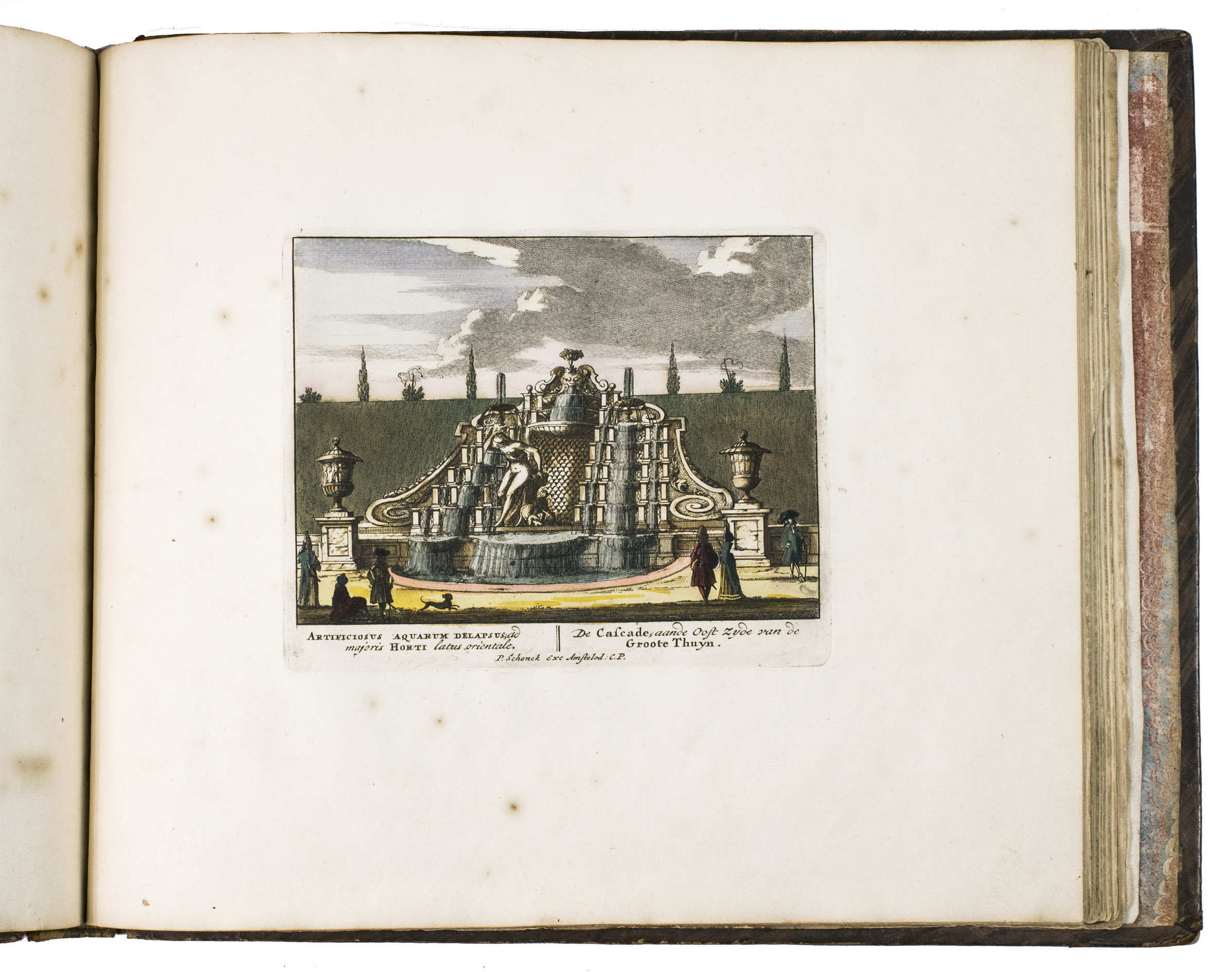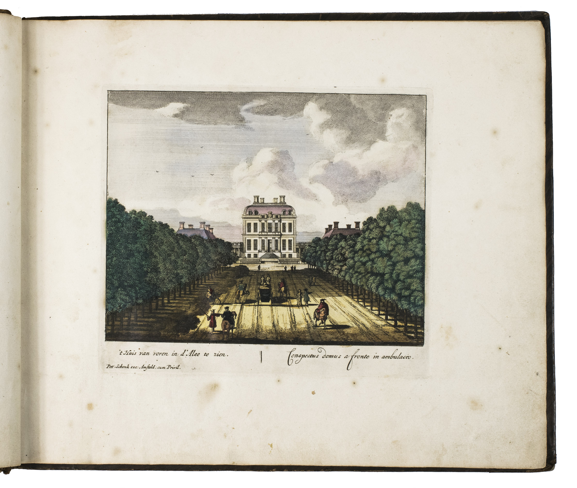 Magnificent large paper copy of series of views of some of the most sumptuous palaces and gardens of the 17th century. All the plates have been beautifully coloured by a contemporary hand. The work contains three different print series, depicting the most beloved houses and palaces of Stadholder/King William III (1650-1702) from various angles, as well as the gardens, fountains, and statuary. The 3 series were originally issued separately. The first 2, together with 4 other series, were reissued in the first part of Schenk's Paradisus oculorum in 1702, just before William of Orange passed away. However, most parts survive separately, and are now relatively rare.