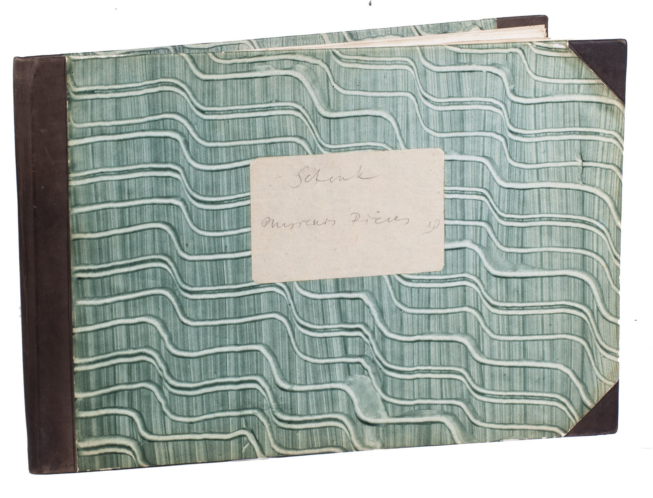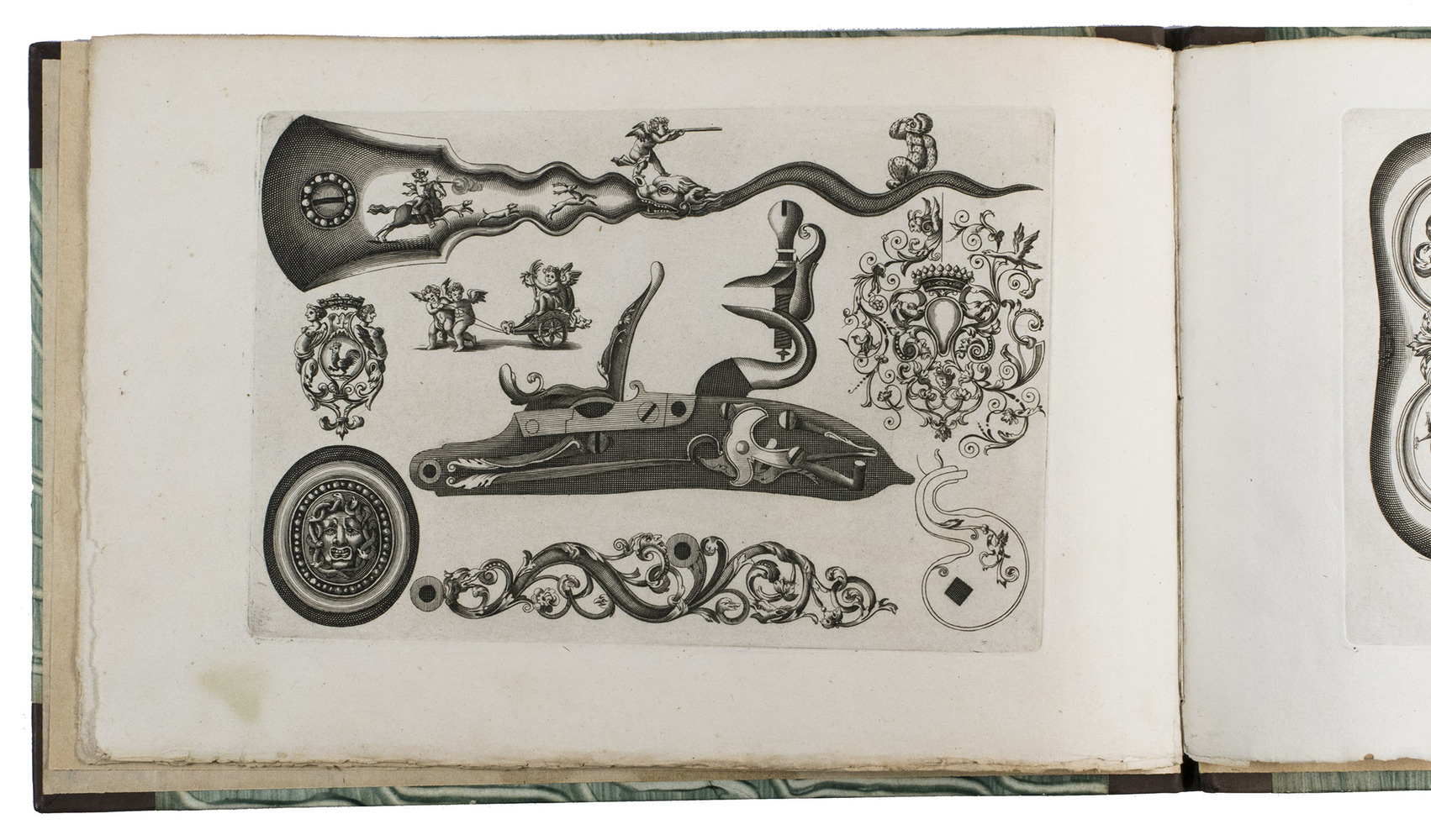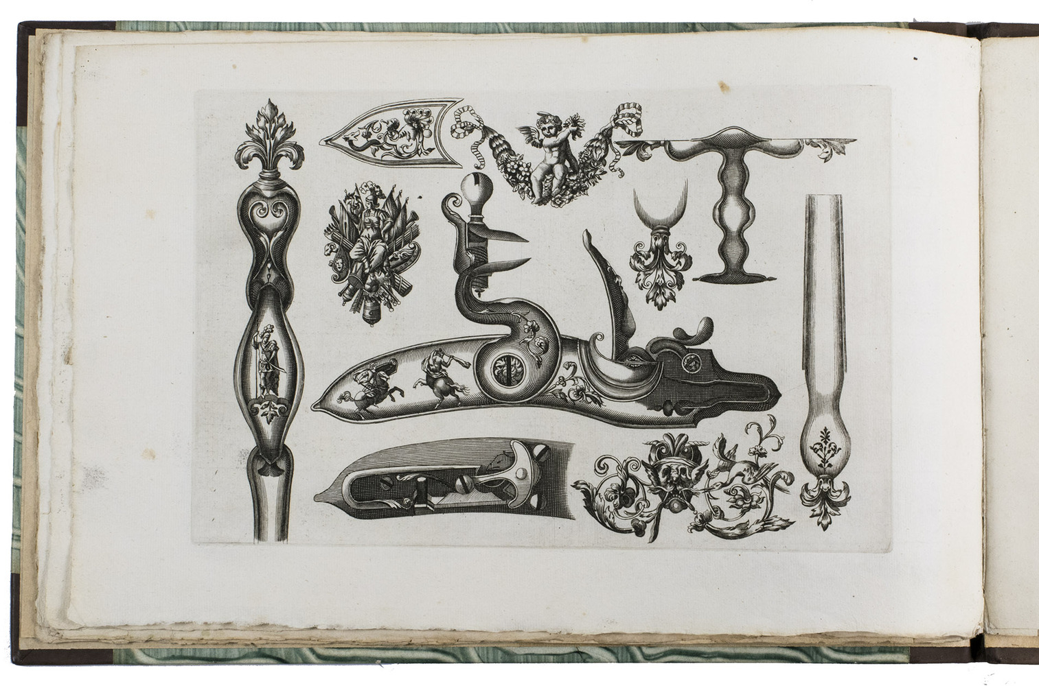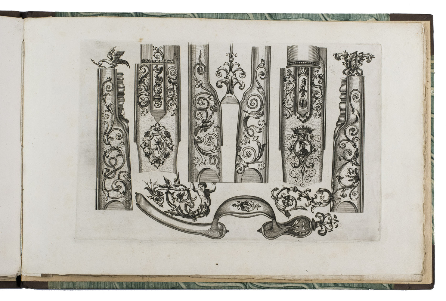 Very rare complete and uncut copy of an expertly engraved pattern book for decorated firearms by the German engraver Petrus Schenk I (1660-1711), after the French designer of gun fittings and ornamental engraver Claude Simonin (ca. 1635-1721).
