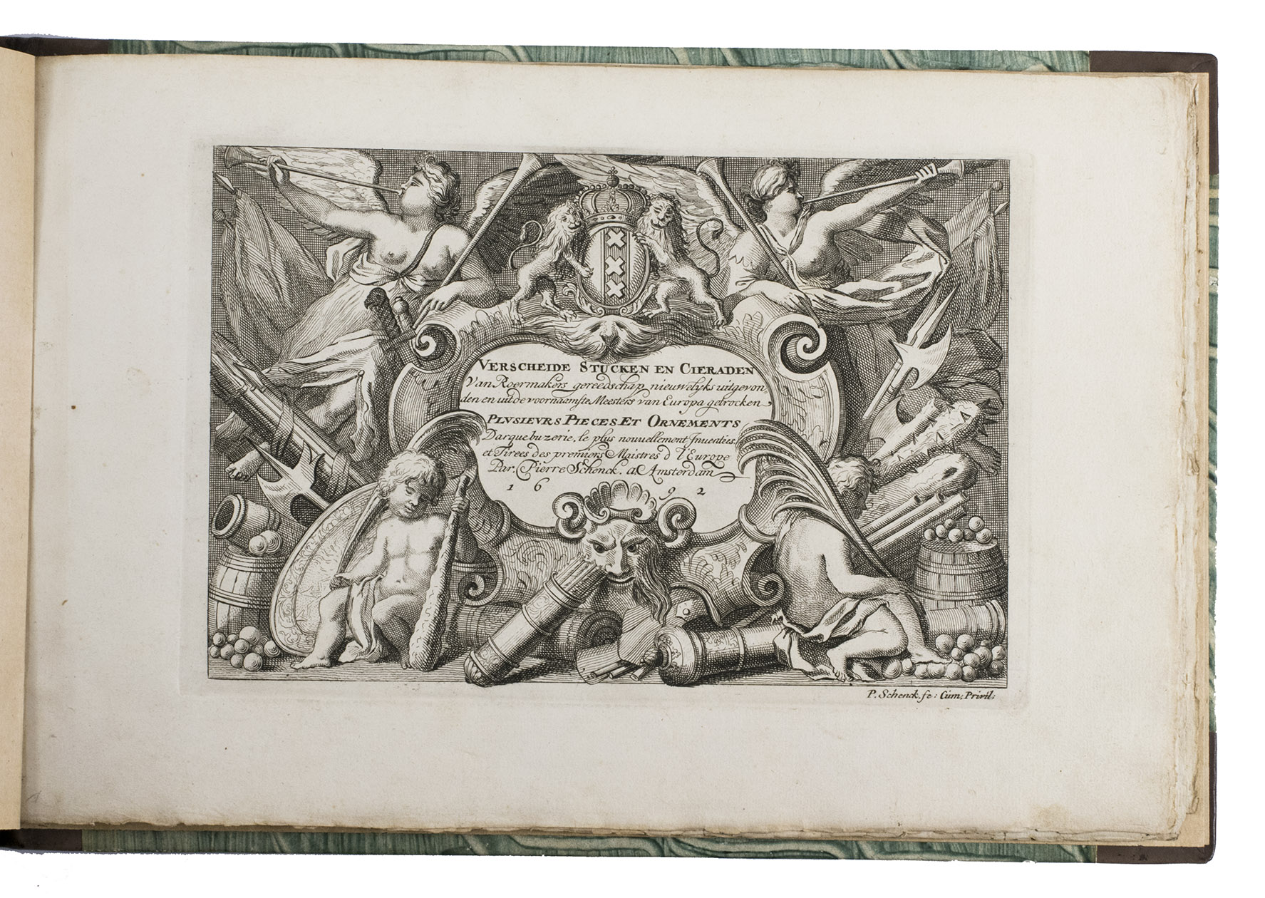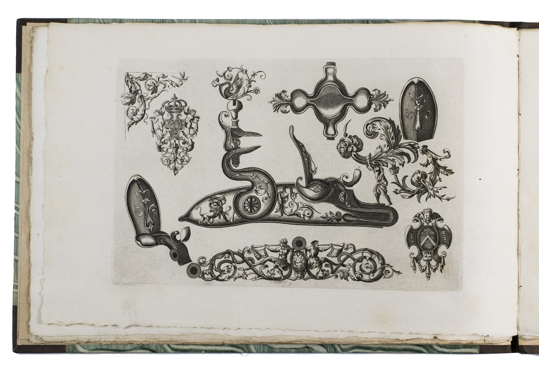 Amsterdam, Petrus Schenk, 1692. Oblong folio. With an engraved allegorical title page and 7 expertly engraved plates of ornamental designs on arquebuses. Modern half calf and green decorated paper sides. [8] ll.