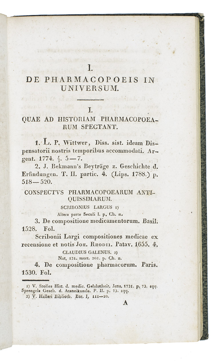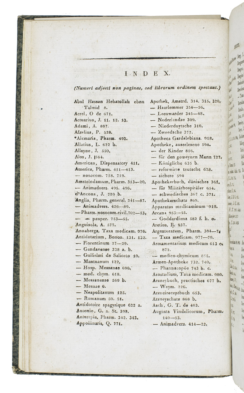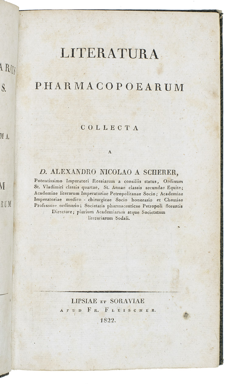Rare first and only edition of a bibliography of European pharmacopoeiae published to ca. 1820, by Alexander Nicolaus Scherer. It is arranged systematically on publication place and the relatedness of the pharmacopoeias. The book contains over 1100 titles and appeared as the last volume in a series of pharmacological texts (vols. 1-7, 1818-1822).