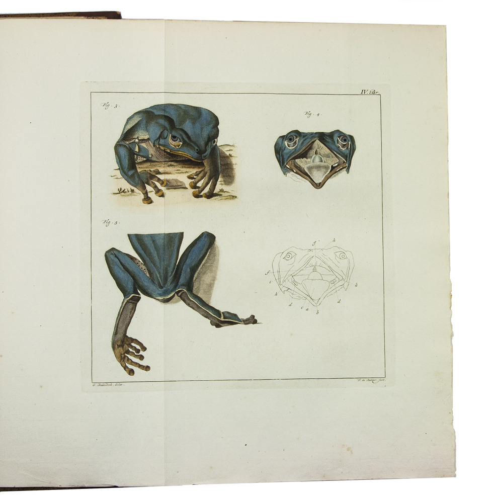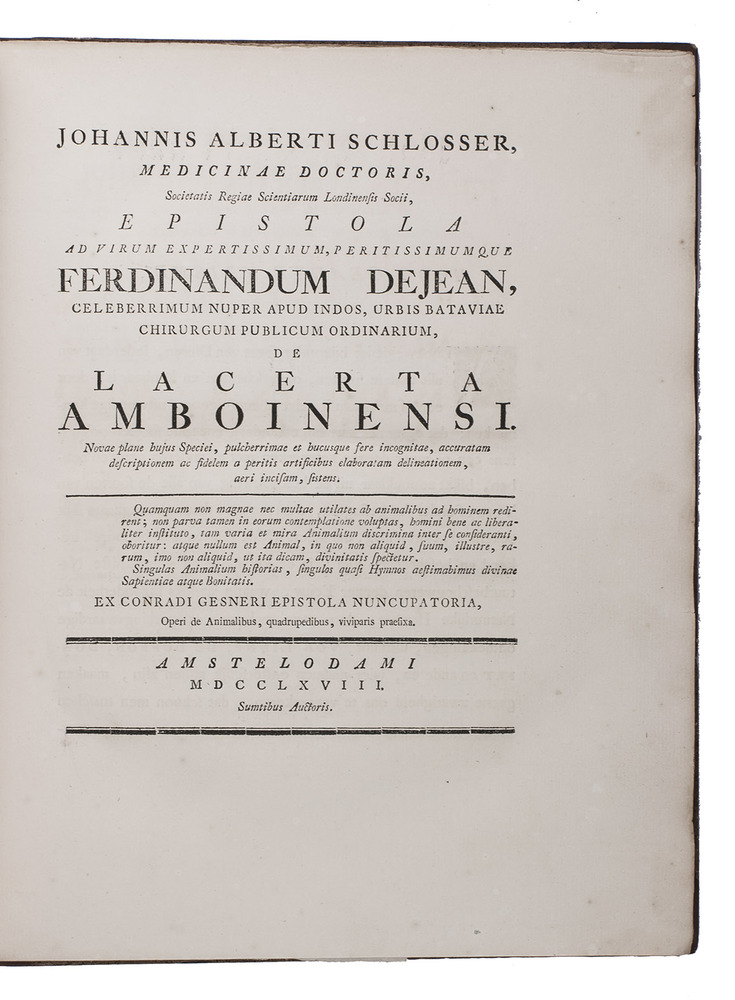 Amsterdam, for the author, 1768. With a folding engraved plate of the Amboinese lizard in two copies, one coloured by a contemporary hand.