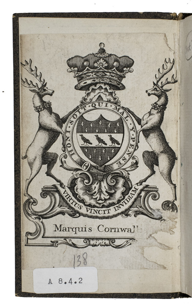With the engraved armorial bookplate of Charles Cornwallis (1738-1805), 1st Marquess Cornwallis, one of the leading British generals in the American War of Independence. Browned throughout, trimmed edges, occasionally shaving the running heads. Binding rubbed along the extremities. Overall a good copy. Krivatsy 10589; VD17 39:140905K (4 copies); Schönborn not in Hirsch.