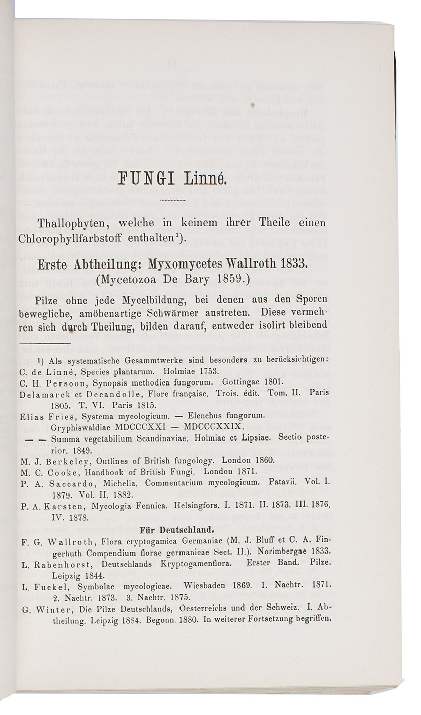 First edition of an extensive "flora" of the fungi of Silesia, written by the Polish mycologist Joseph Schröter (1837-1894). It was published as the third volume of the Krypogamen-Flora von Schlesien of Ferdinand Cohn.