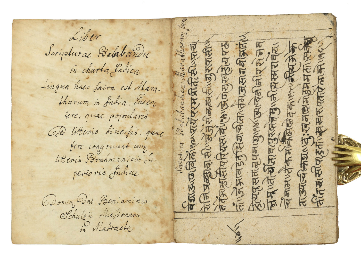On the verso of the front cover, the work is titled and gifted in a contemporary hand: "Liber Scripturae Balabandu in charta Indica. Lingua haec sacra est Maratharum in India, eadem fere quae popularis sed litteris diversis, quae fere congruunt cum litteris Brahmanicis superioris Indiae. Donum Domini Beniaminas Schulzii, missionarii in Madrasta". The following page is superscribed, "Scriptura Balabandica Maratharum sacra". A rare survival of an 18th-century manuscript written in the Marathi language.