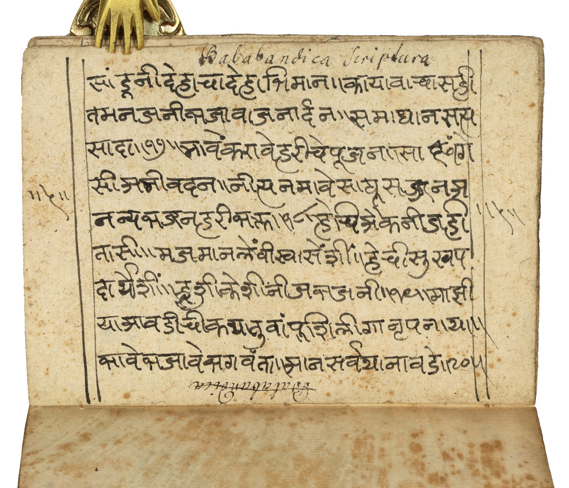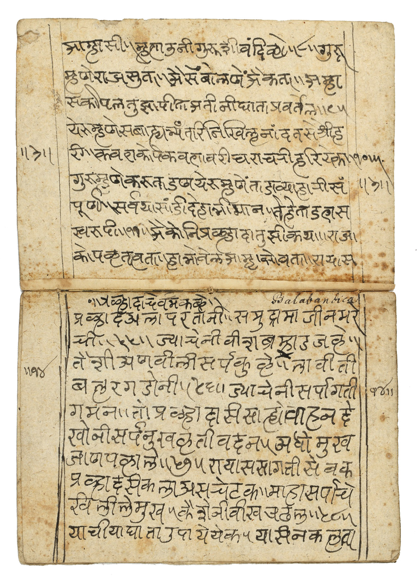 A fine and early specimen of written Marathi, an Indic language spoken mainly in the western Indian state of Maharashtra, but also in Goa, Karnataka, Tamil Nadu, Telangana, Gujarat, and Kerala. One of the 22 scheduled languages of India, with 83 million speakers, Marathi has the third largest number of native speakers in India, after Hindustani and Bengali, and ranks 13th in the list of languages with most native speakers in the world. It can boast some of the oldest literature of all modern Indian languages.
