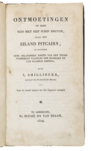Lieutenant John Shillibeer (1786-1841) participated in the Battle of Trafalgar in 1805, before he was assigned to the HMS Briton in 1813. His notes from this voyage were the basis for the work A narrative of the Briton's voyage, to Pitcairn's Island (1817), which was published shortly after his return to England. This work was translated into Dutch in 1819, which is the present work. This translation is very scarce. It has only been recorded in six libraries worldwide, and we have only been able to find two other copies in sales records of the past 100 years.