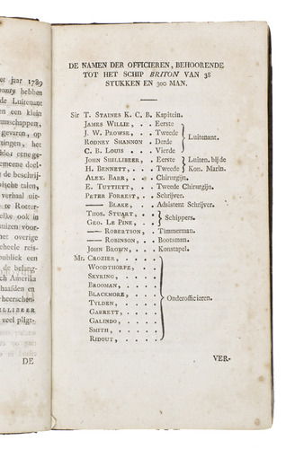 First Dutch edition of a fascinating account of the voyage of the HMS Briton to Brazil and the Pitcairn Islands, including some noteworthy details about the mutiny of the HMS Bounty in 1789. Unbeknownst at the time, the survivors of the mutiny had settled on Pitcairn. Although most of them had passed away in the early 19th century, their descendants where still living there. The crew of the HMS Briton met them in 1814. The present work includes a rare interview with one of them, which offers a wealth of information about the mutiny and its aftermath.