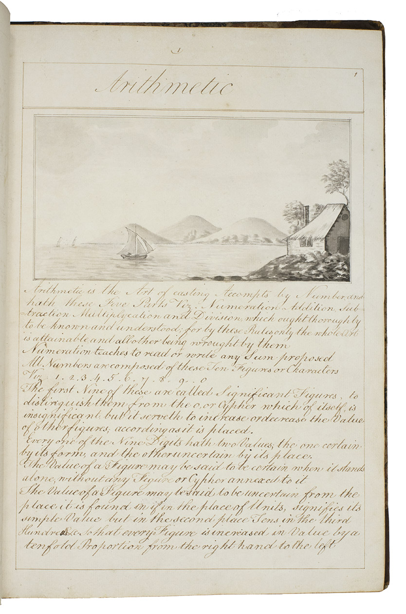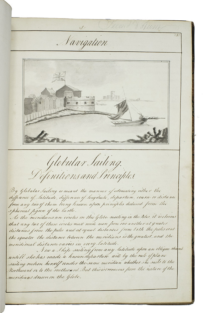Exercises in mathematics, navigation, fortification, surveying, mechanics, etc., at the Royal Naval Academy in Portsmouth, finely executed by the future Admiral Charles Sotheby (1782-1814) when he studied there in the years 1795 to 1798 (probably ages 13 to 15). The large folding nautical chart of the North Atlantic shows the North American coast from Newfoundland to Cape Cod, the Caribbean and Atlantic islands and the coasts of West Africa and western Europe, while the full-page one includes the coasts of Greenland, Iceland, western Europe, West Africa, the Atlantic islands and a sand bank off Newfoundland. The other nautical charts show Christmas Island (off the coast of Java, though the form differs), Palmerston Island (in the South Pacific) and Table Bay (at Cape Town, South Africa) in great detail. The pages have been numbered as a whole, with a single series covering both volumes, and mostly also section by section with the following number of pages: arithmetic 56, geometry 48, plane trigonometry 18, the description and use of the terrestrial globe 5, geography 12, chronology 10, navigation 17 & 29, spherics 28, astronomy 34, latitude 13, longitude [33], days works [= journal keeping] [22], marine surveying [31], fortification [29], gunnery [22] and mechanics [19].