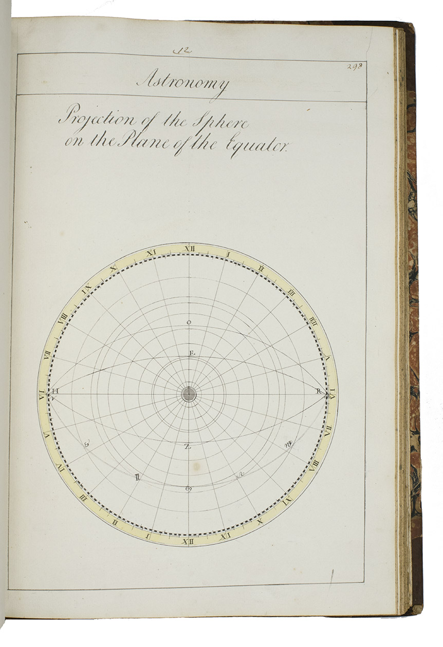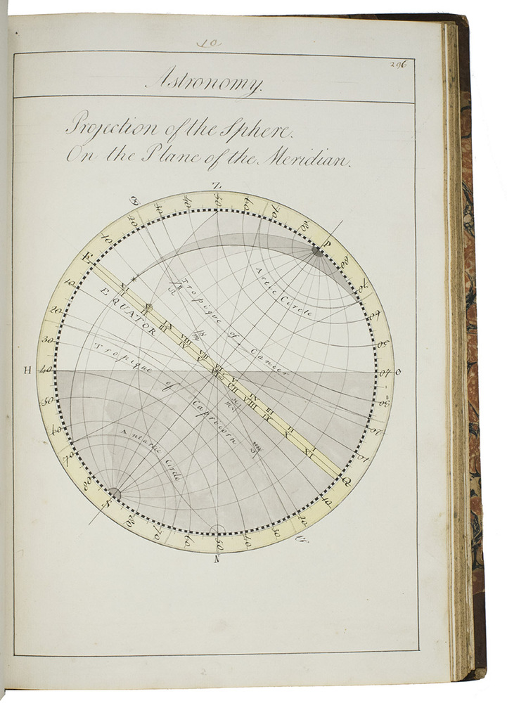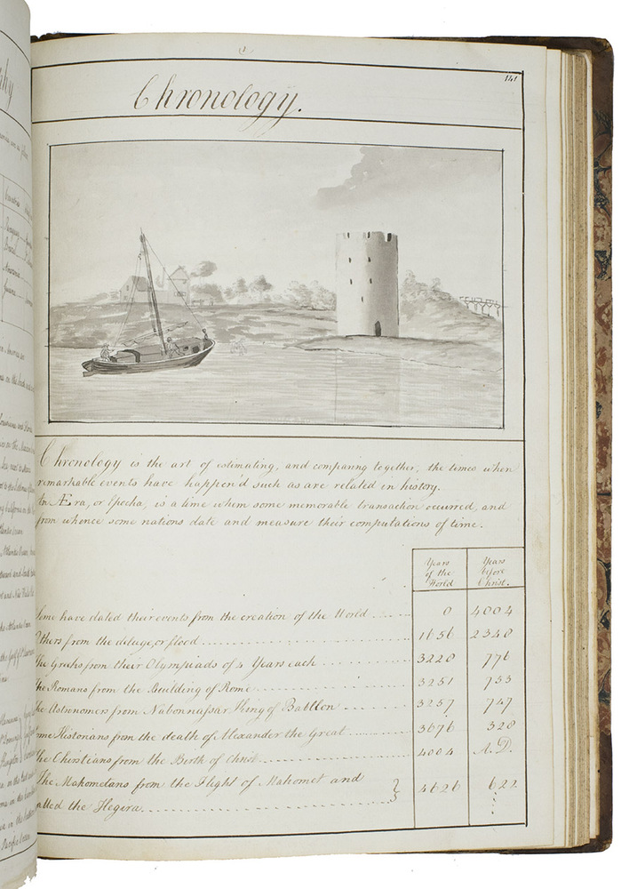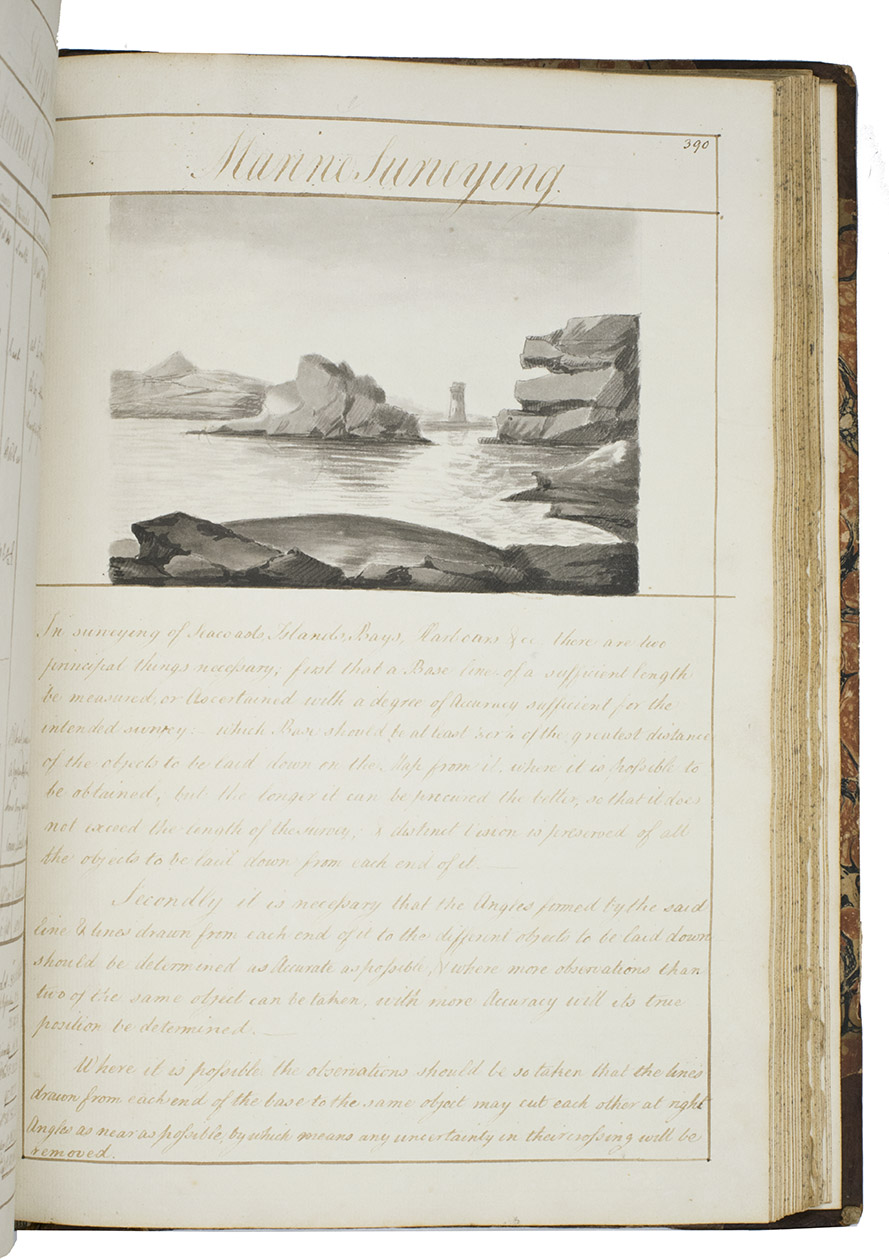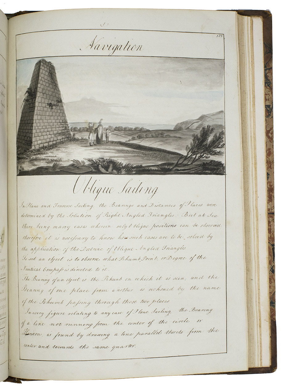 [Portsmouth], "177 " [recté 1795-1798]. 2 volumes. Imperial 4to (37.5 x 27 cm). Manuscript school exercises with a pre-printed engraved title-page with a blank space for the student to add his name, with 4 full-page and 1 larger folding nautical charts (some partly in colour), 7 full-page fortification plans (in black ink with 1 to 3 colours), 4 full-page astronomical diagrams (2 also with yellow), a full-page compass rose, 23 pen and ink wash views in the text (9 x 15 cm to 12.5 x 22 cm, 1 also with blue washes), and numerous other diagrams (including maps in the surveying section) and some illustrations in the text. Near contemporary (ca. 1803) blind- and gold-tooled half calf, blue sprinkled edges. engraved title-page + “229” [= 228]; 230-493, [2 blank] pp., with pp. 229 and 493 blank excepting the page numbers.