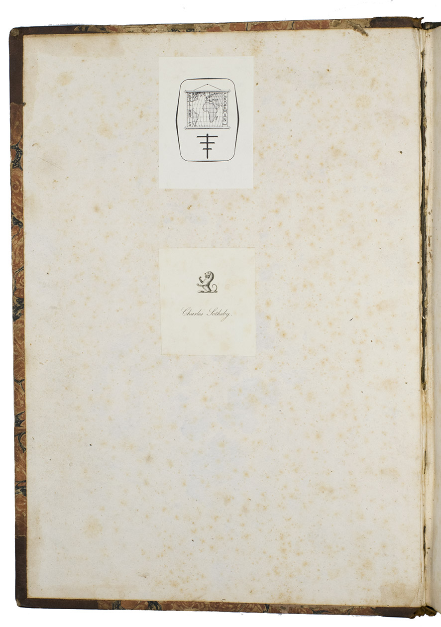 Each volume with the engraved bookplate of Charles Sotheby, with the rampant talbot crest from the Sotheby coat of arms, and also with the bookplate of the Dutch cartographic historian Cornelius Koeman (1918-2006). In very good condition, with only a small chip in one leaf and a tattered fore-edge in a few others. The bindings are rubbed and the spines worn, with a crack in the front hinge of vol. II, but the tooling remains clear. A detailed and fascinating picture of the teenage studies at the Royal Naval Academy in Portsmouth.