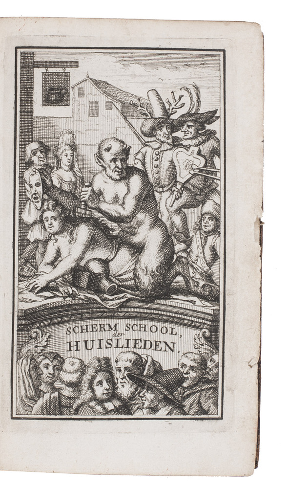 Second edition, by the printer-publisher of the 1704 first edition, of a rare coarse satire whose title can be translated as, "The comical and entertaining life of Louwtje Zevenhuizen, or the family fencing school." The two volumes of the "fencing school" are followed by the African and Asiatic guide, which Spaan had published separately in 1694 and 1695. The former includes a chapter on the fictitious Isle of Pines.