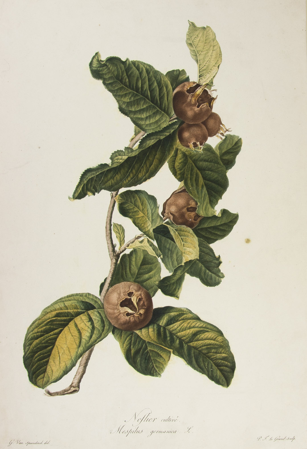 [Paris, 1799-1801]. Stipple engraving on unwatermarked wove paper (56.5 x 42 cm), printed in colour à la poupée and finished by hand, of a Mespilus germanica, showing a branch with five medlars in various sizes, signed "P.F. Le Grand sculp." In passepartout.