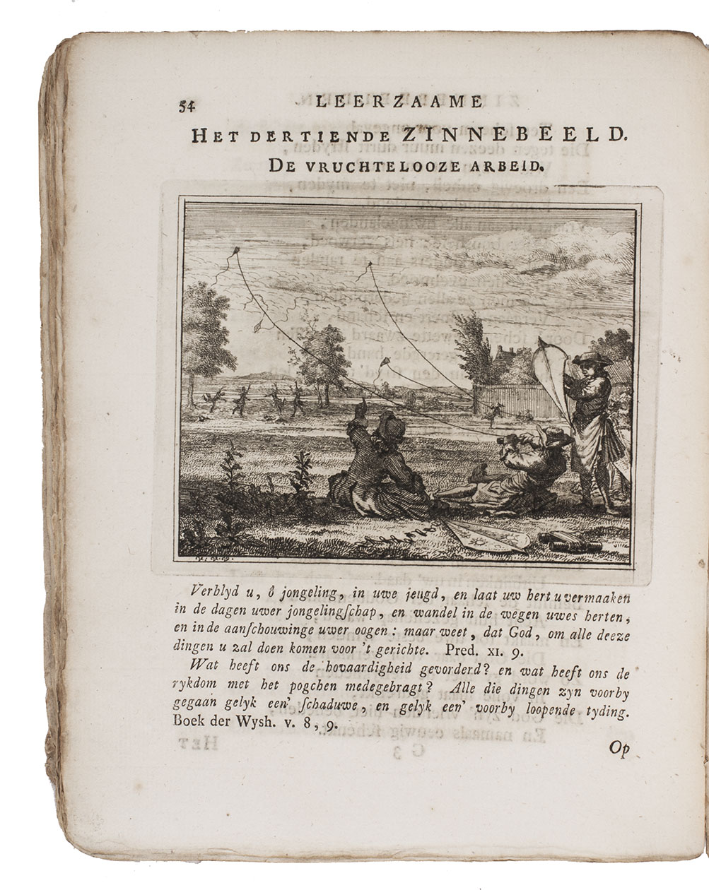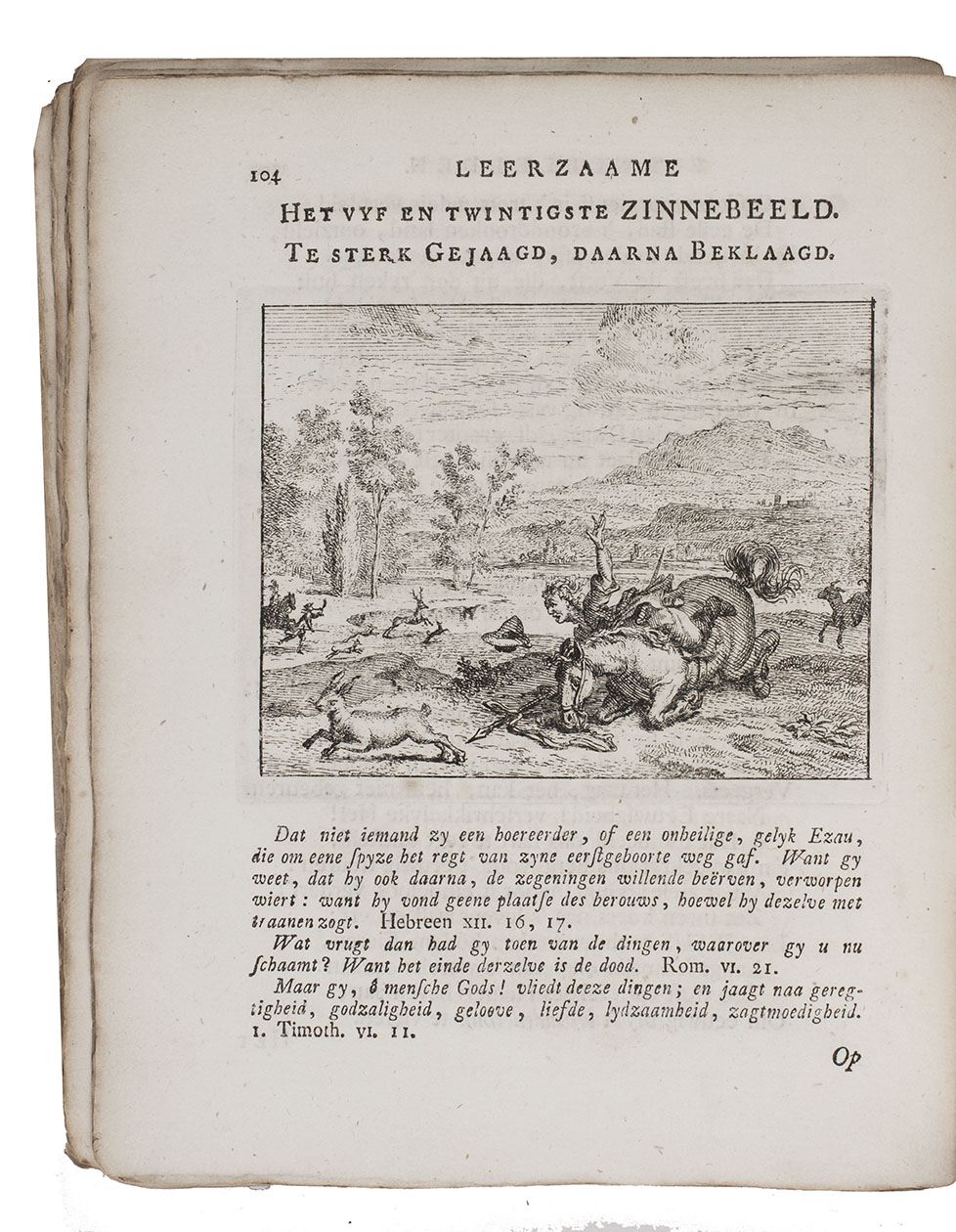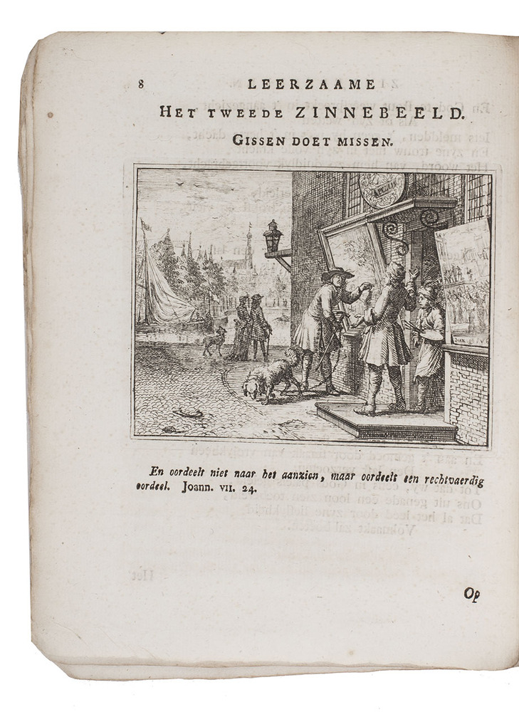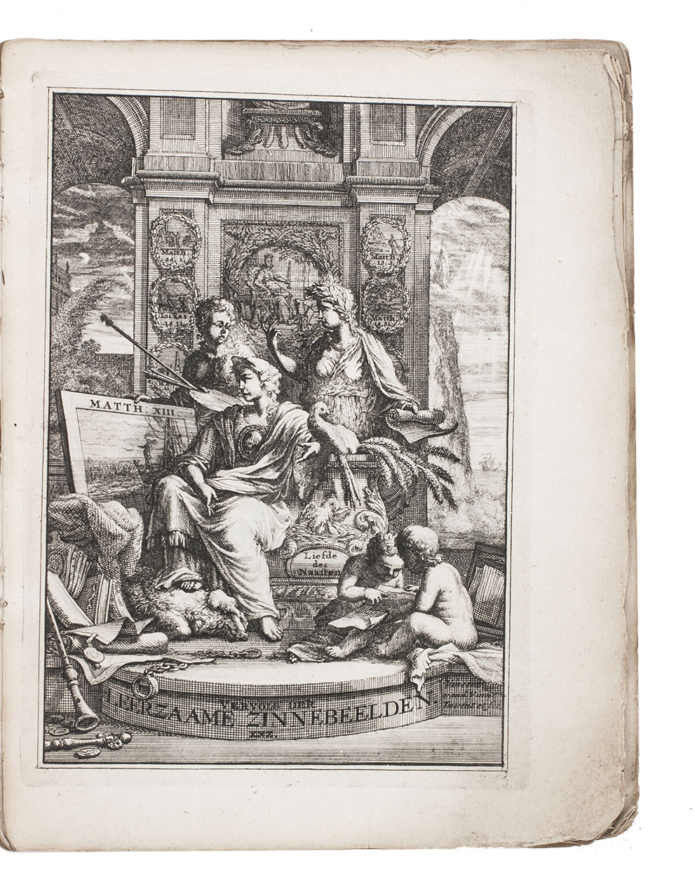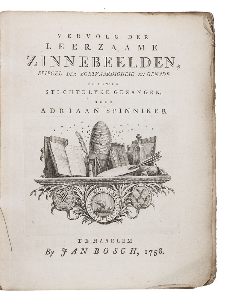 First and only edition of an emblem book by Adriaan Spinniker (1678-1745). It is an independent continuation of Spinniker's Leerzaame Zinnebeelden (Haarlem, 1714) which contained 50 emblems by Vincent van de Vinne (1686-1742), the grandson of the famous painter Vincent vander Vinne (1629-1702) who was a pupil of Frans Hals in Haarlem. The 30 emblems in the present work are by the same artist, and represent scenes from daily life, scenes in the country, in shops, households, etc. and are accompanied by Bible verses underneath. An explanation of each emblem is given on the following pages in the form of a poem. The second part has an individual title page, Spiegel der boetvaardigheid en genade, and contains 4 engravings by Jan Caspar Philips (1690-1775). It deals with the concepts of repentance and mercy with reference to Bible passages, and ends with the Stichtelyke gezangen: devout songs.
