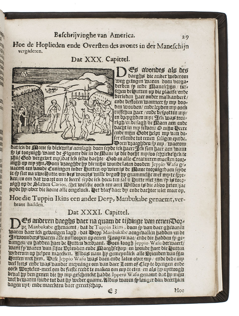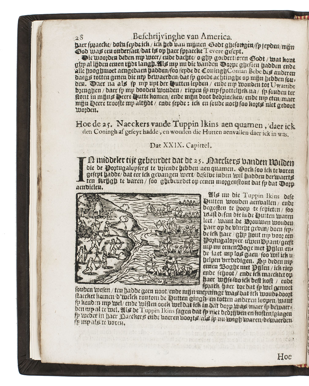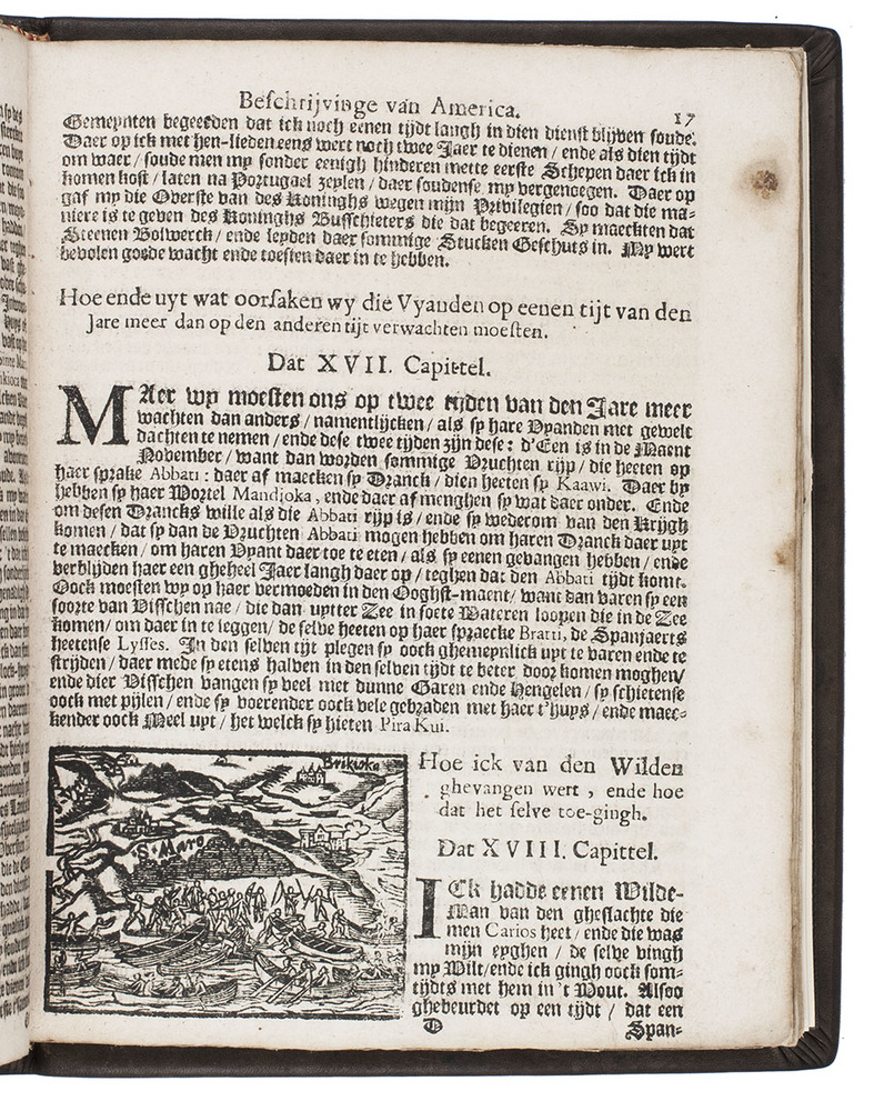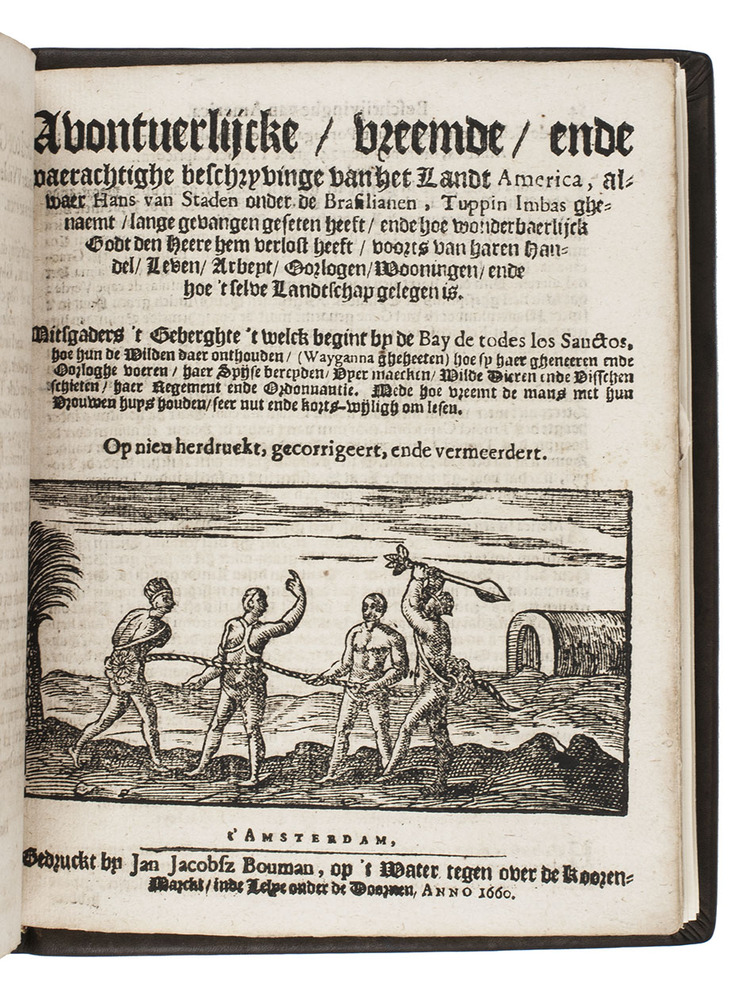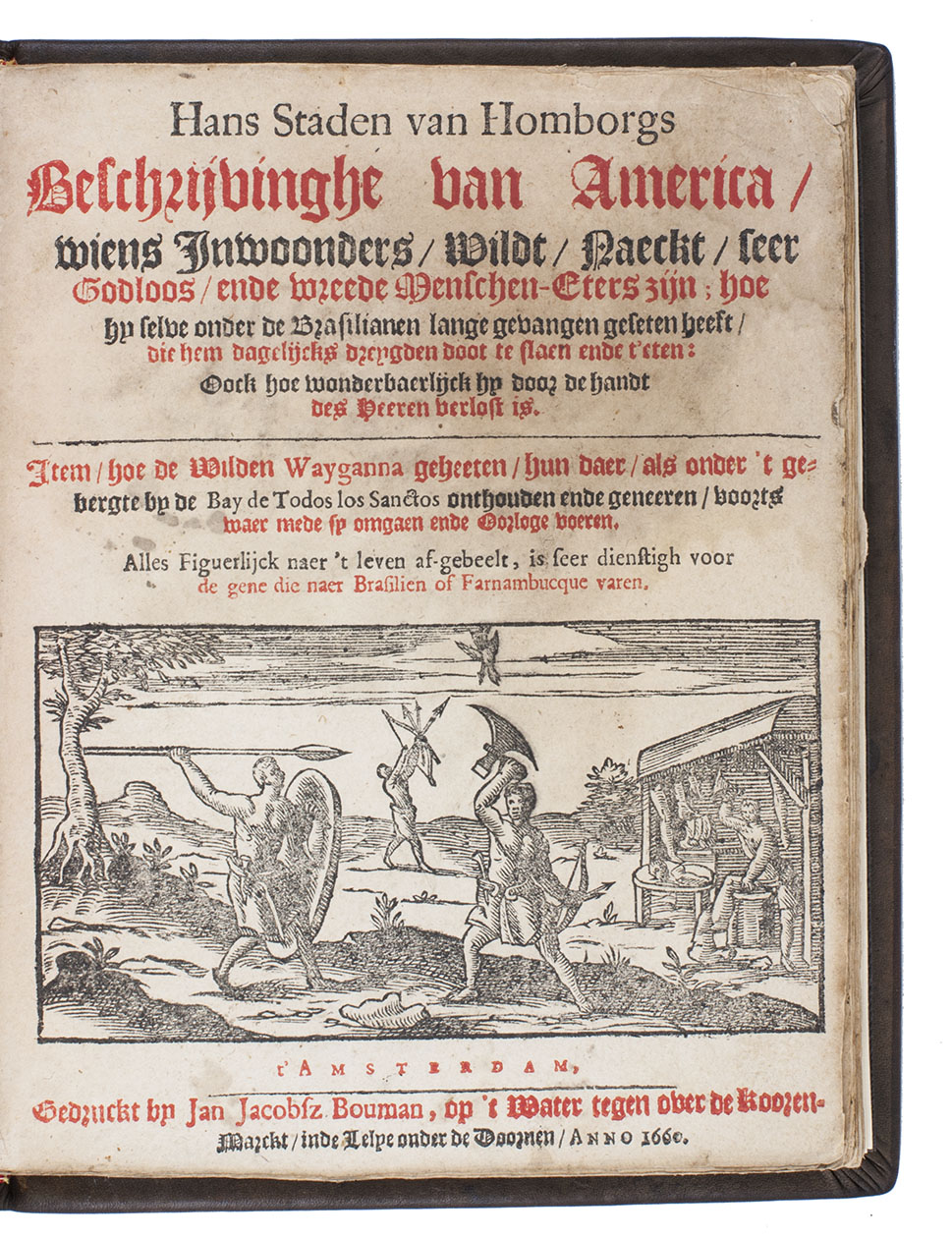 Extremely rare Dutch edition of an important and very popular eye-witness account of mid-16th-century Brazil, by Hans Staden (ca. 1520/25-ca. 1557 or ca. 1576), a Hessian artilleryman who served the Portuguese in Brazil in the years 1547-1548 and 1549-1555. During most of his second trip to Brazil he was held prisoner near Rio de Janeiro by the Tupinambá Indians. Already fluent in the Tupi language, he probably gained a more intimate knowledge of the Indians than any other writer of his day. The first part describes his voyages and his capture by the Indians, while the second part describes their culture and customs. Staden's sensational tales of the "savage, naked, very godless and cruel cannibals" of Brazil, published when Europeans knew almost nothing of the New World, immediately made the book a best-seller. While its biased view of the Brazilian "savages" was the progenitor of many widely accepted 16th-century European beliefs about the New World, it also contains a wealth of information from the direct observations of a participant observer familiar with the native language. It therefore forms one of the most important sources of both facts and misperceptions about indigenous Americans. We have located only three other copies of the present edition worldwide.