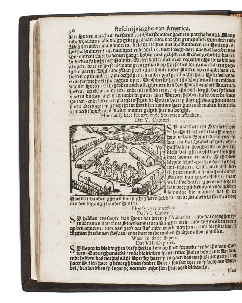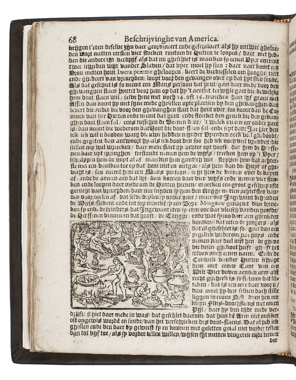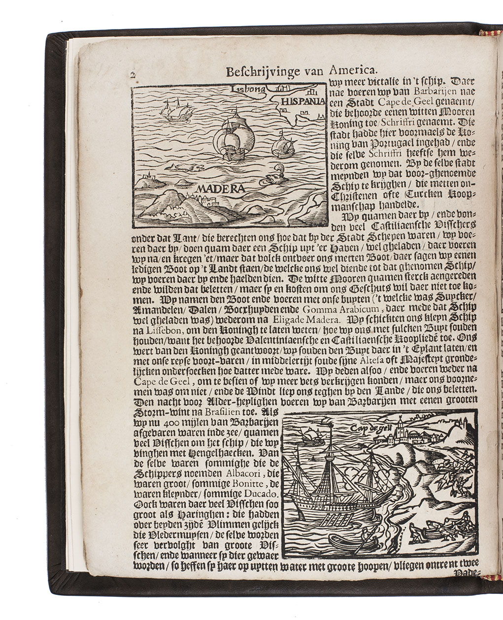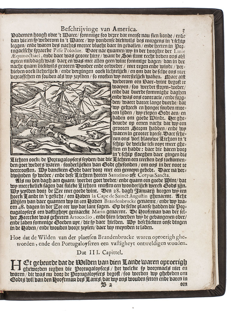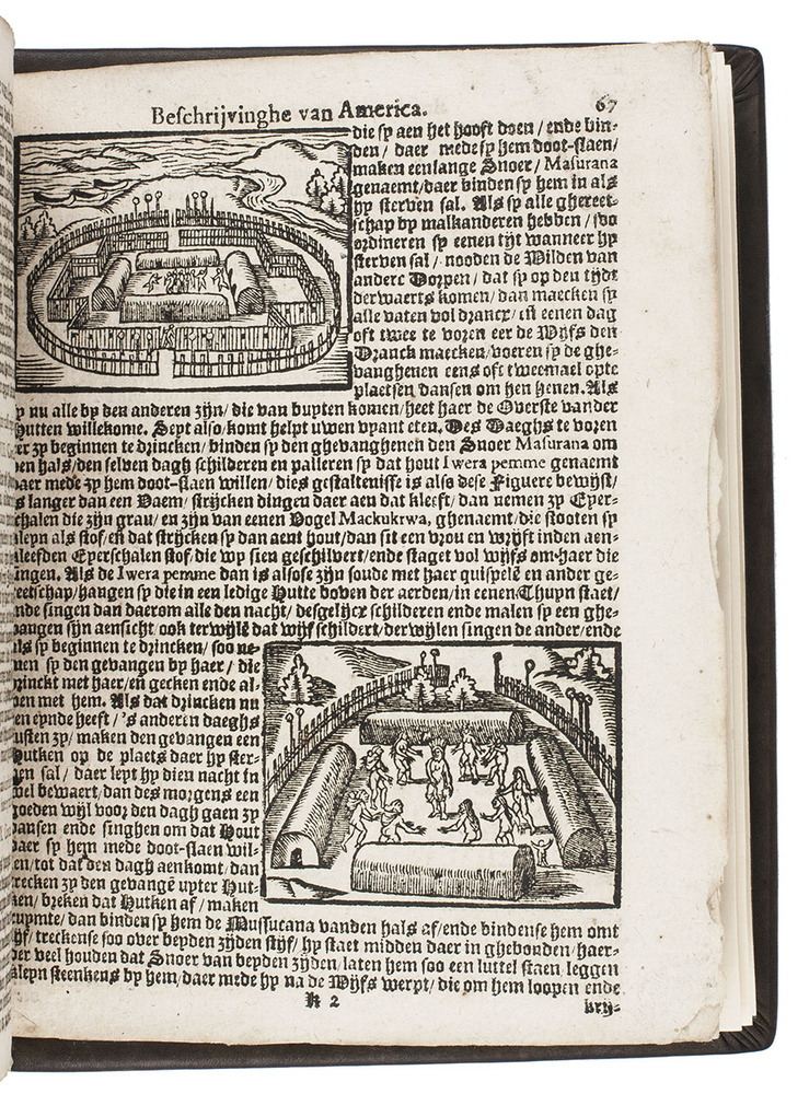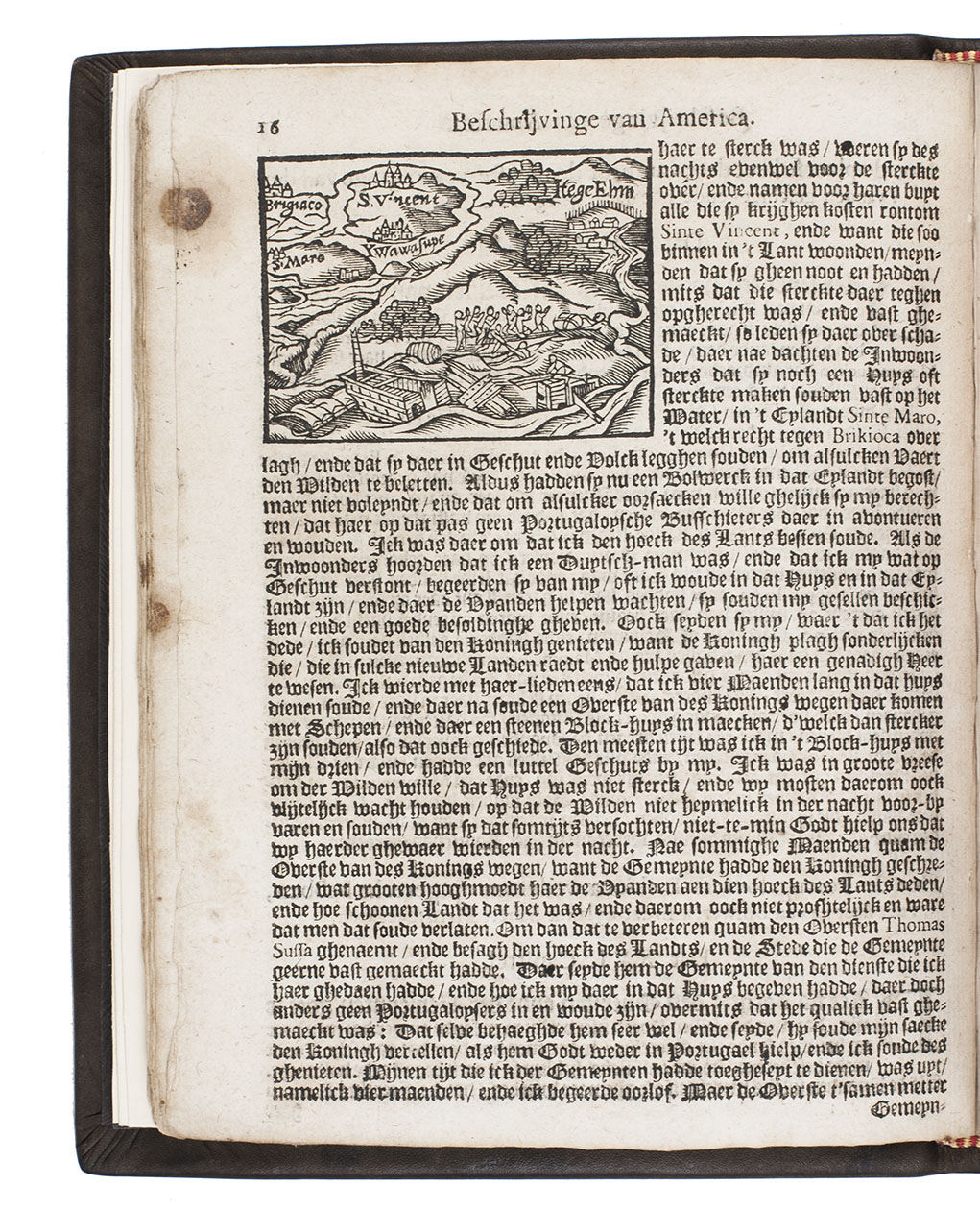 Extremely rare Dutch edition of an important and very popular eye-witness account of mid-16th-century Brazil, by Hans Staden (ca. 1520/25-ca. 1557 or ca. 1576), a Hessian artilleryman who served the Portuguese in Brazil in the years 1547-1548 and 1549-1555. During most of his second trip to Brazil he was held prisoner near Rio de Janeiro by the Tupinambá Indians. Already fluent in the Tupi language, he probably gained a more intimate knowledge of the Indians than any other writer of his day. The first part describes his voyages and his capture by the Indians, while the second part describes their culture and customs. Staden's sensational tales of the "savage, naked, very godless and cruel cannibals" of Brazil, published when Europeans knew almost nothing of the New World, immediately made the book a best-seller. While its biased view of the Brazilian "savages" was the progenitor of many widely accepted 16th-century European beliefs about the New World, it also contains a wealth of information from the direct observations of a participant observer familiar with the native language. It therefore forms one of the most important sources of both facts and misperceptions about indigenous Americans. We have located only three other copies of the present edition worldwide.