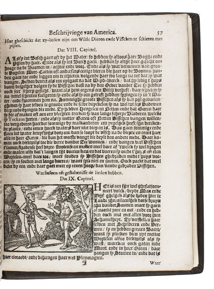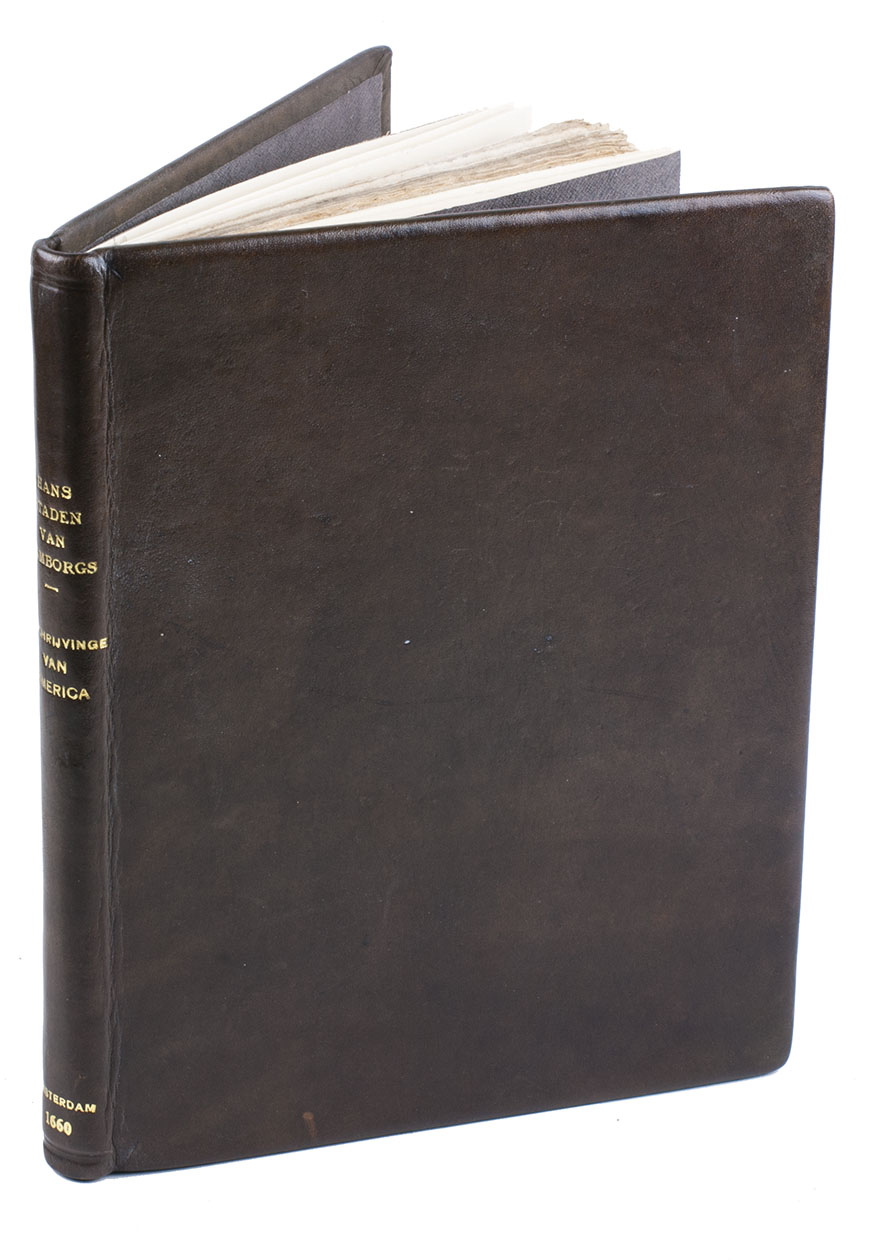 Amsterdam, Jan Jacobsz. Bouman, 1660. 2 parts in 1 volume. 4to. With 2 title-pages, the first printed in red and black, each with a different large (7 x 13 cm) woodcut illustration; and 17 smaller (5 x 6.5 cm) woodcut illustrations (plus 12 repeats) in the text, mostly of Brazilian Indians. 20th-century dark brown calf, with older stiff paper wrappers bound in. [8], 72 pp.