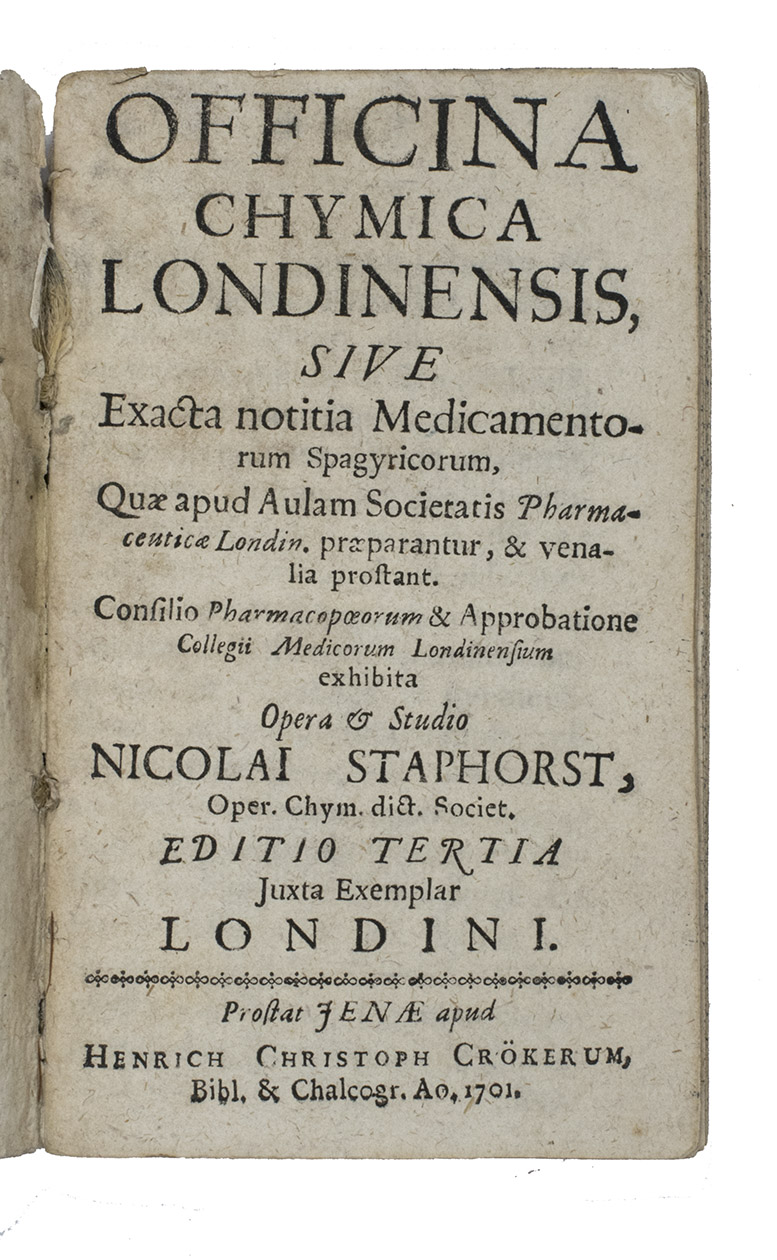 Third edition of a catalogue of medicines for sale at the Societas Pharmaceutica at London by Nicolaus Staphorst, director of the chemical laboratory of the Royal College of Physicians in London. Staphorst was an immigrant from Hamburg who belonged to an important family of ministers and church historians.