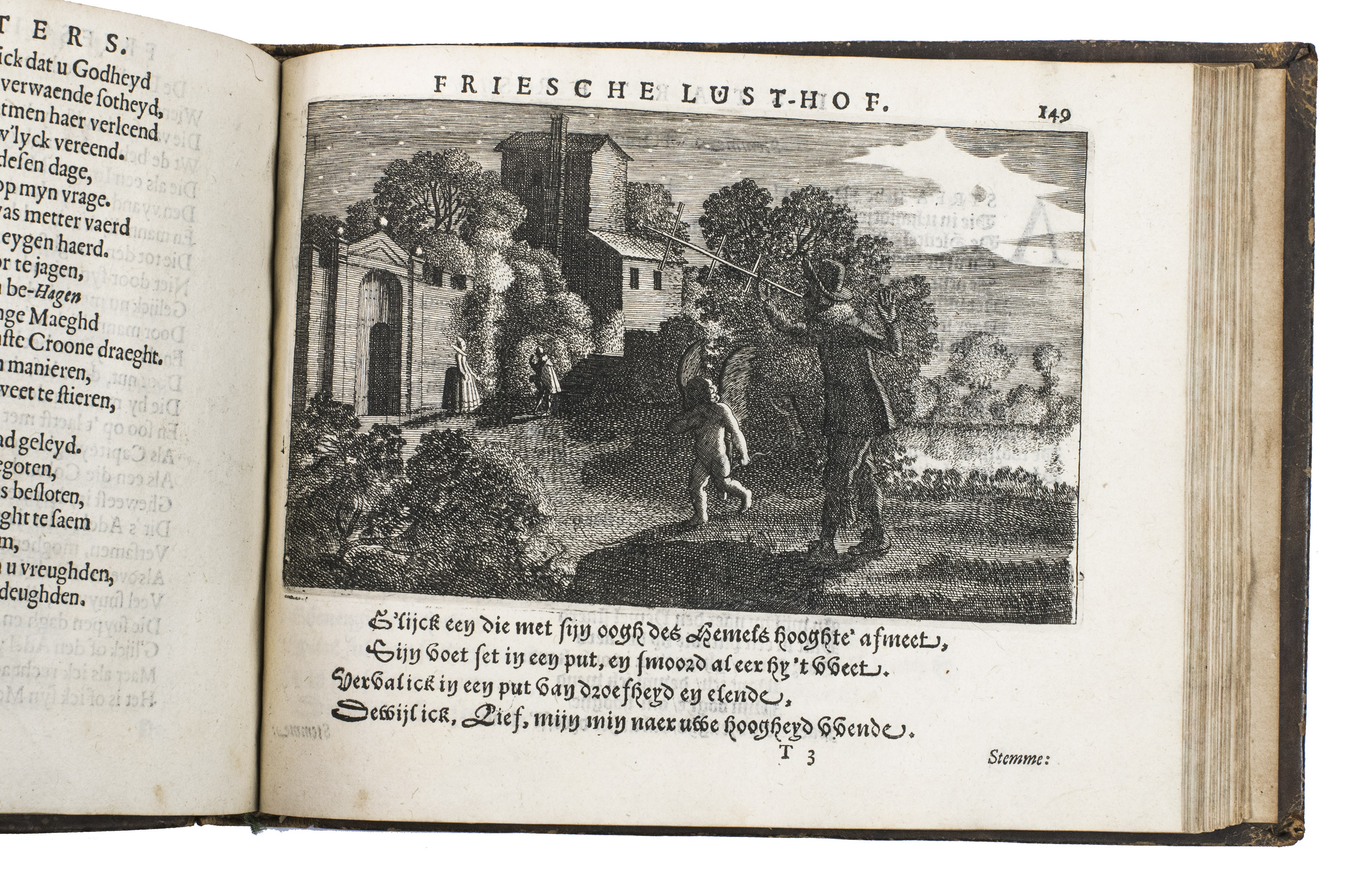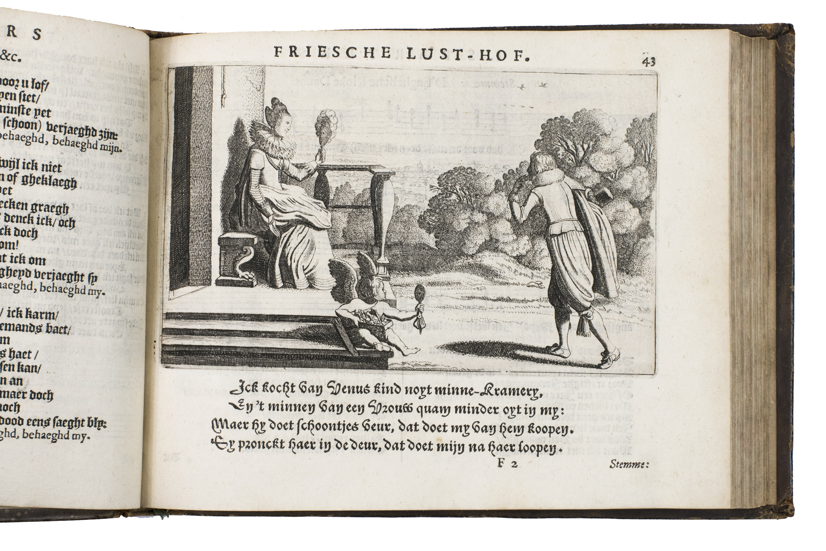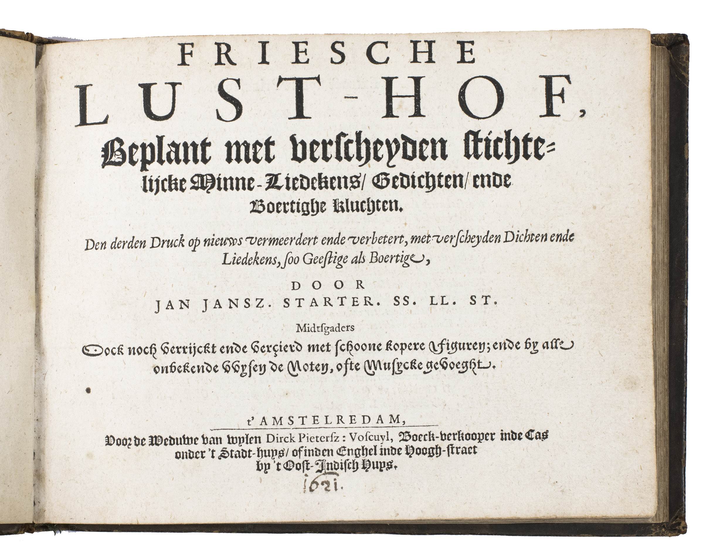 Friesche Lust-hof, beplant met verscheyden stichtelijcke minne-liedekens, gedichten, ende boertighe kluchten. Den derden druck op nieuws vermeerdert ende verbetert ... Midtsgaders oock noch verrijckt ende verçierd met schoone kopere figuren; ende by alle onbekende wysen de noten, ofte musycke gevoeght.