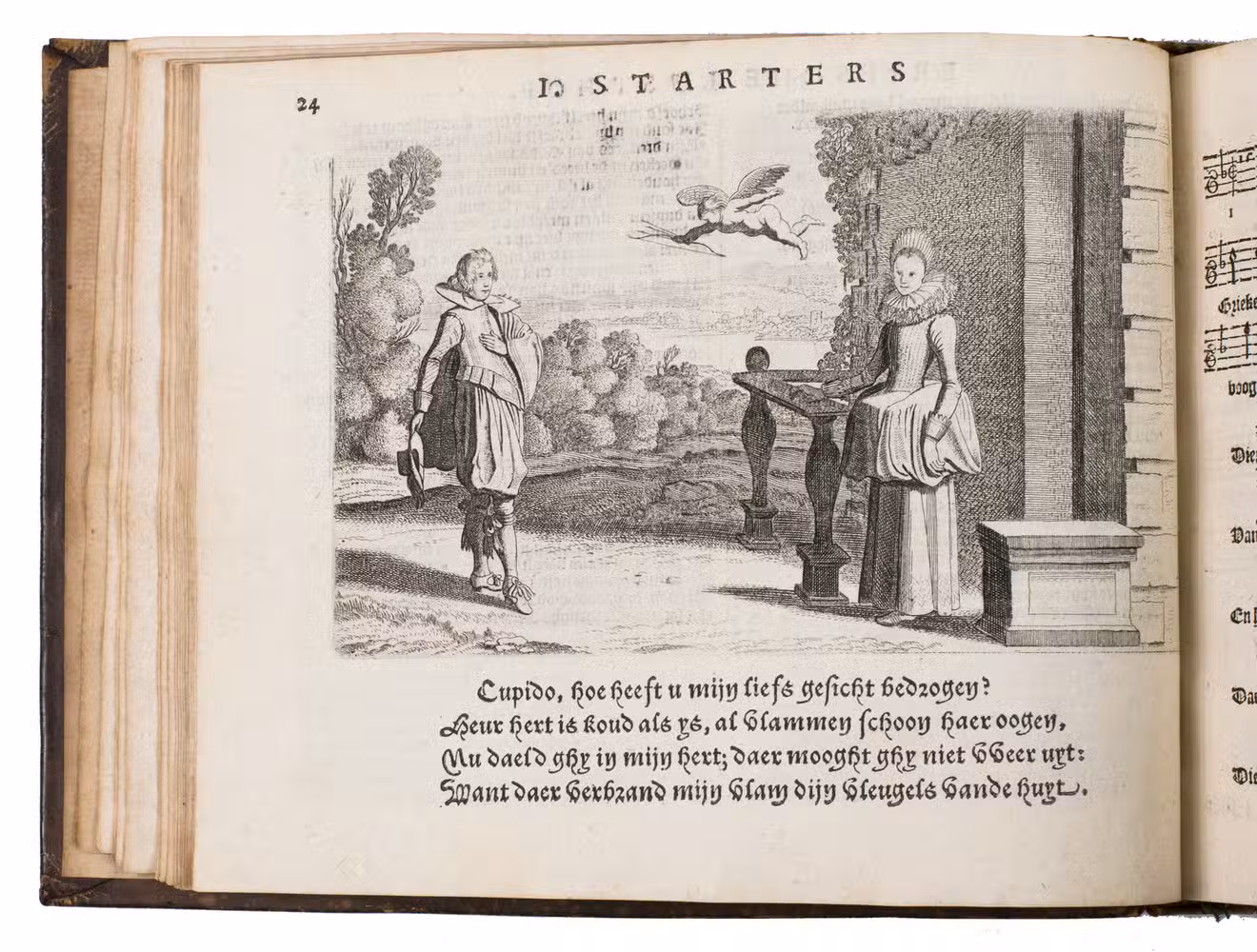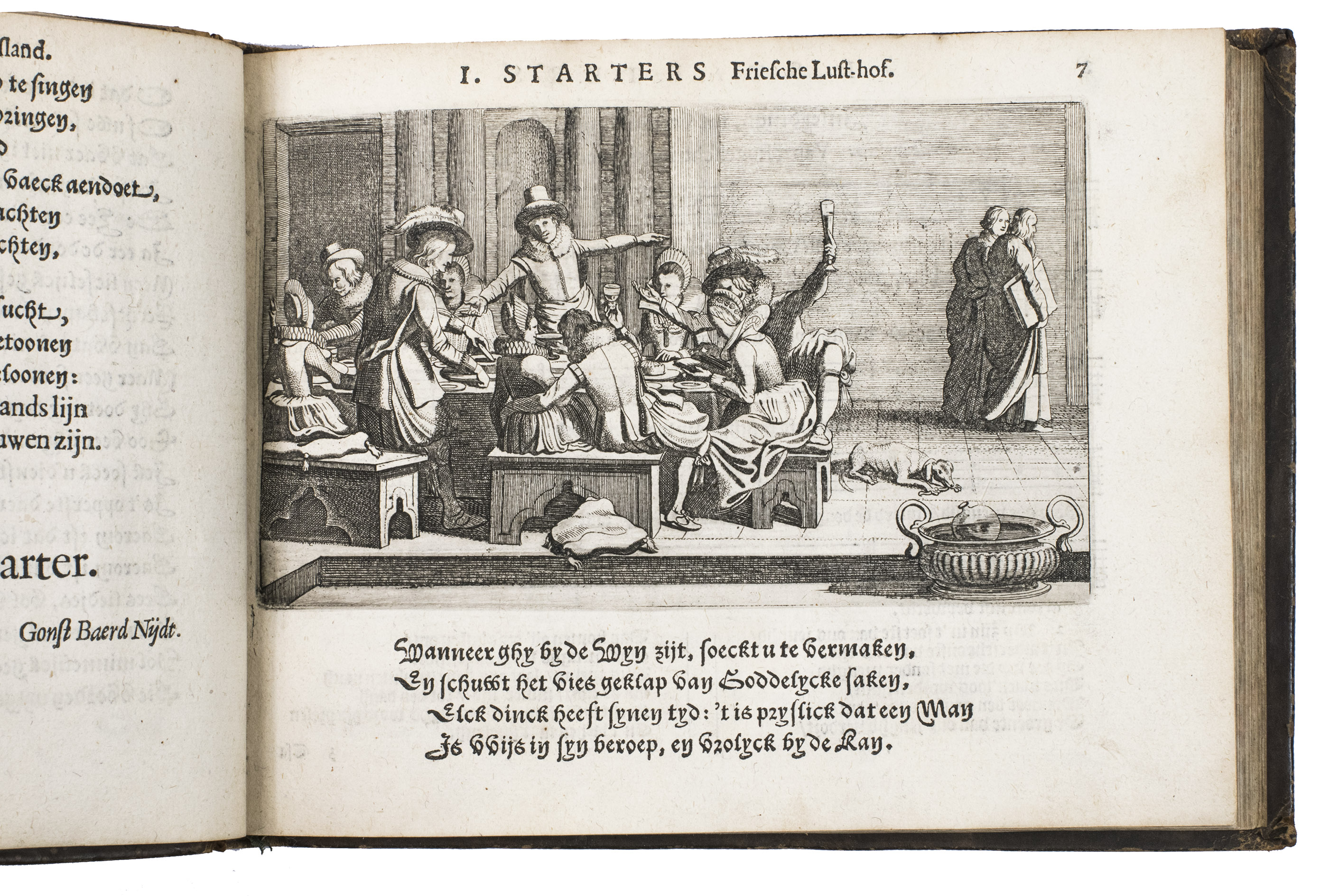Jan Jansz. Starter, (really John Startutt, 1593-1626), was of English origin, and from 1614 to 1621 bookseller and publisher at Leeuwarden, hence the title Friesche lusthof for his songbook, first published in 1621. Together with Bredero (1585-1618), Starter became one of the most popular poets and playwrights of the early 17th century. He worked together with composer Jacques Vredeman (ca. 1563-1621) in Leeuwarden, who contributed a great deal to the popularity of the songbook. Many of the songs were based on English songs, taken from The first book of songes and ayres (1600) by Robert Jones, and Thomas Deloney's Garland of delight (late 16th century). From other songs the sources are still unknown, including "Is Bommelarire so pritty soo groote geneughd", which is set to the music of the tune "Was Bommelarire so pritty a play". The fine plates by Jan van de Velde (1593-1641), a pupil of Jacob Matham, the step-son of Golzius, beautifully illustrate the songs with pastoral and courtly scenes, several shown at night with only the moon and the stars to lighten the scene.