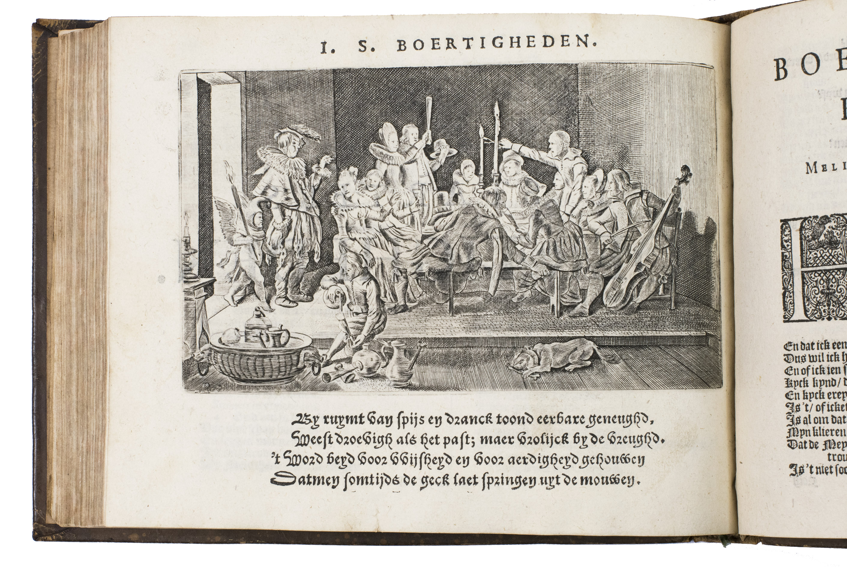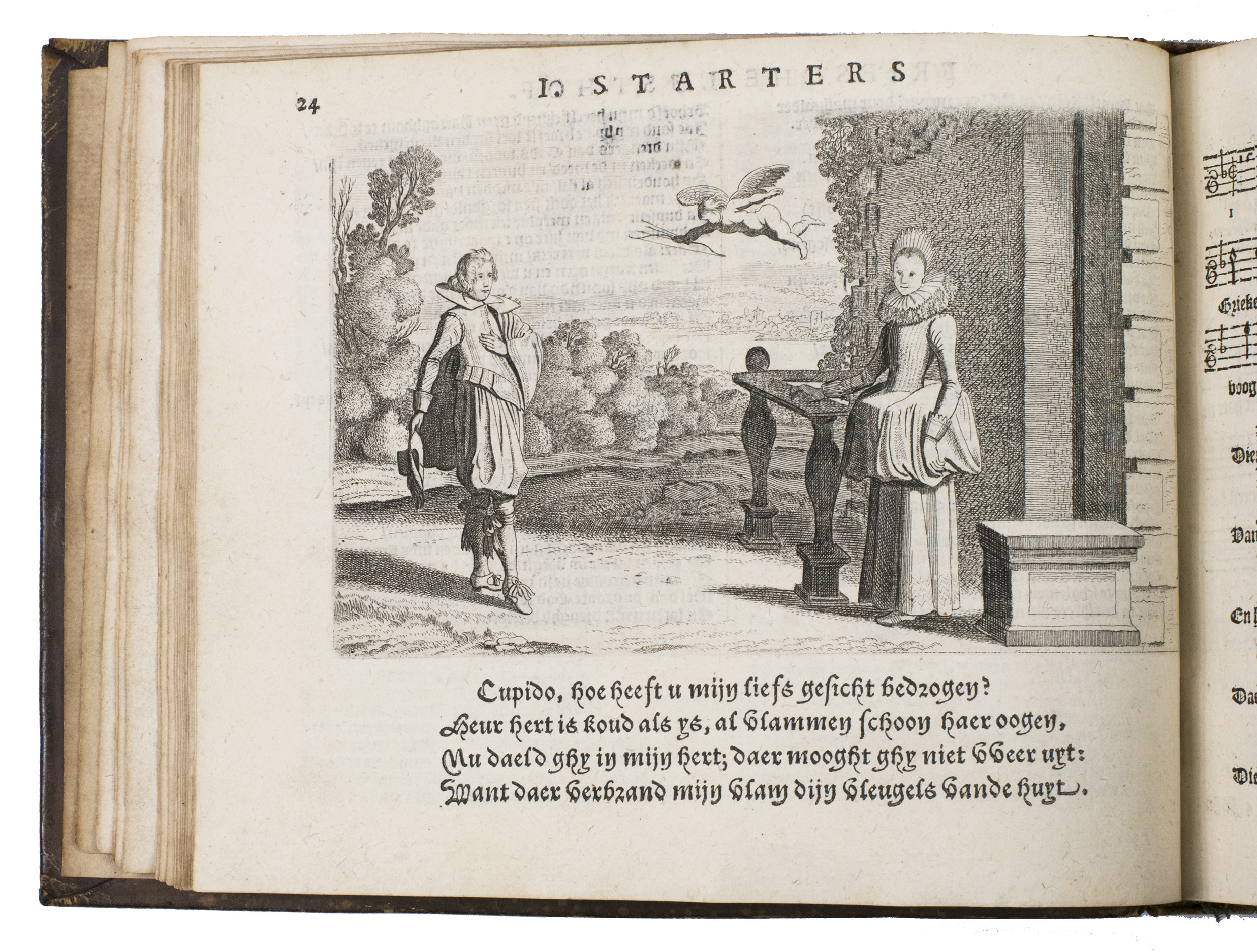 Amsterdam, Widow of Dirck Pietersz. Voscuyl, [1624]. Oblong 4to. With an engraved frontispiece, an engraved portrait of the author, 10 engraved plates in the text, musical annotation, and decorated woodcut initials. 18th-century mottled brown calf. [14], 206, [40] pp.