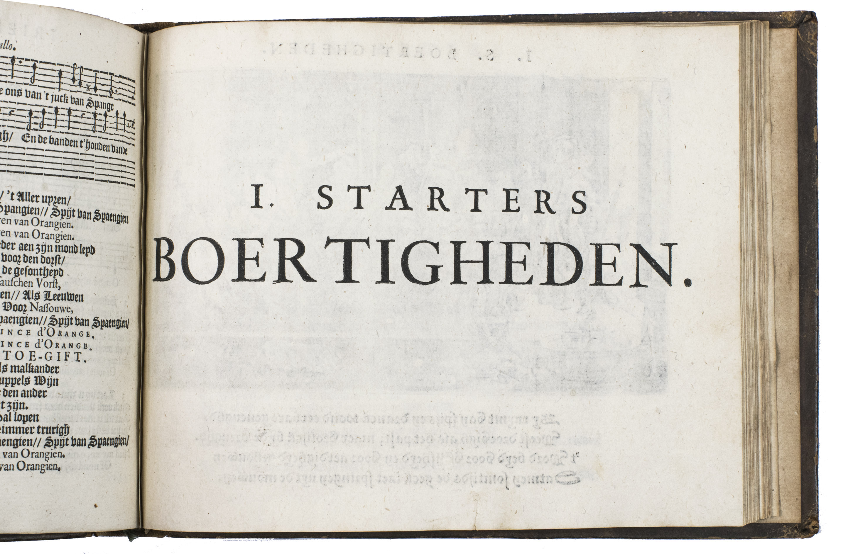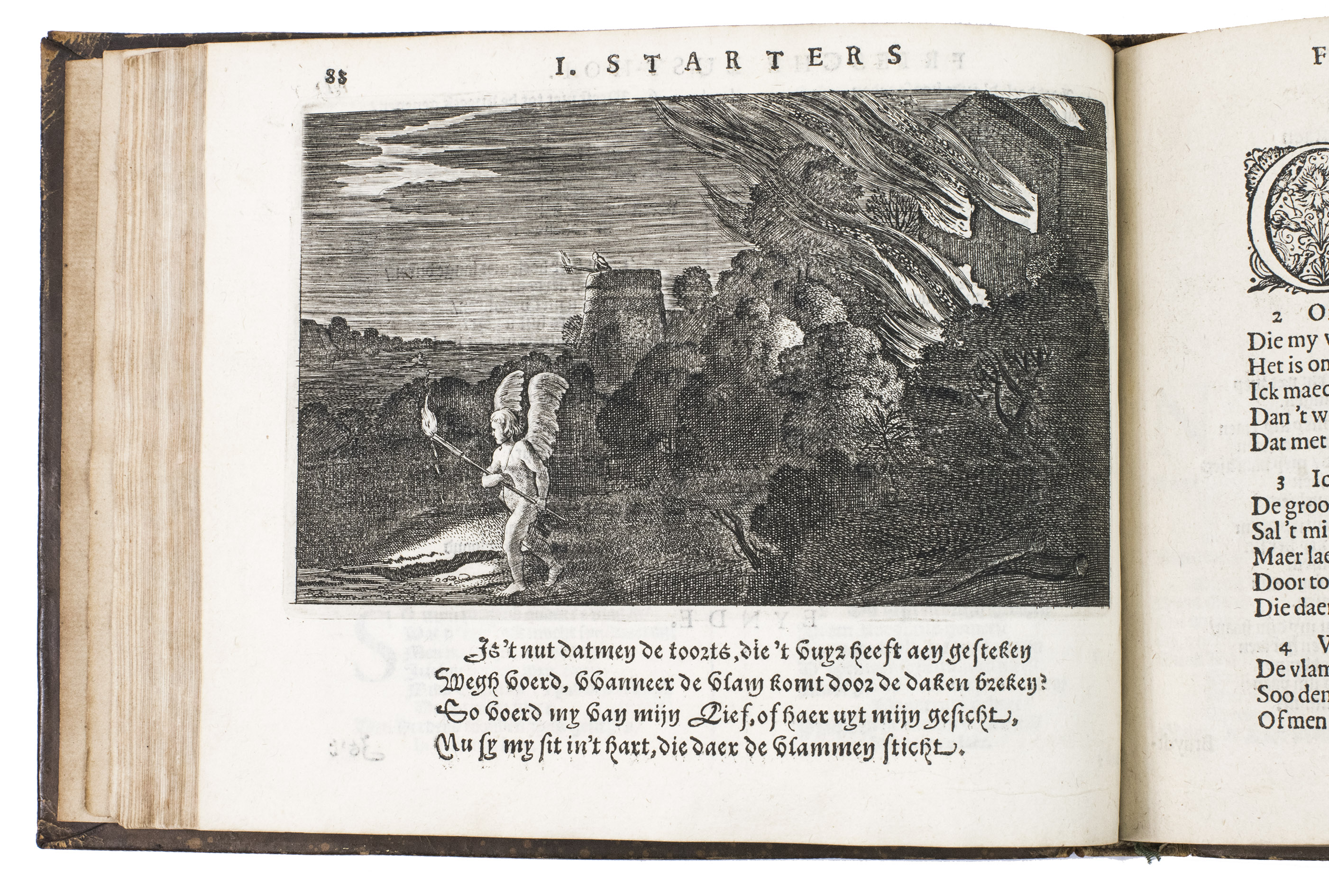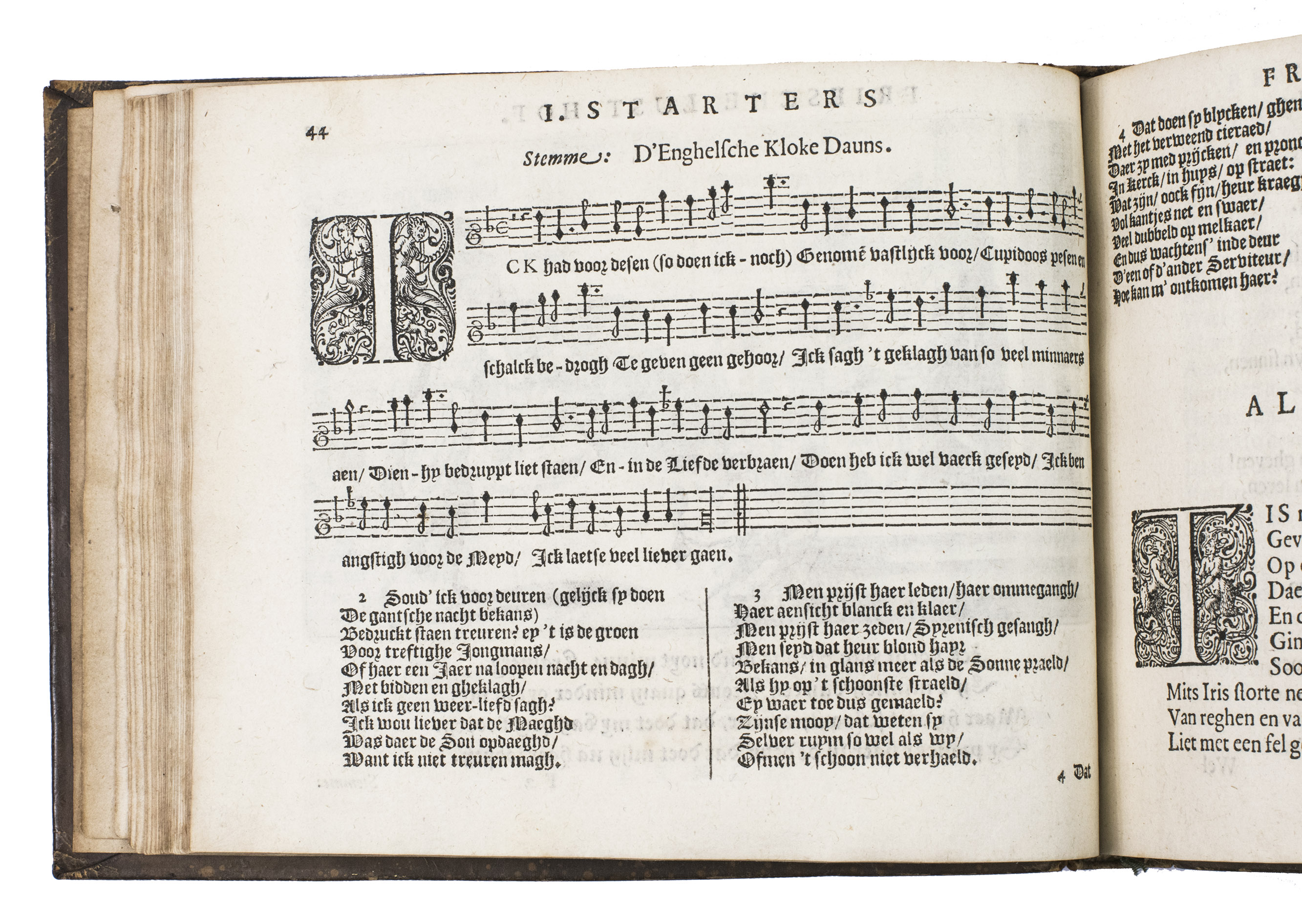 The edges and corners of the boards are very slightly scuffed, the spine is rubbed, affecting the final word of the title. The work is very slightly browned throughout, lacking two blank leaves (2C4 and F4). Otherwise in good condition. Goovaerts 565; Kleerkoper, Starter, p. 36; Scheurleer, Liedboeken, p. 147;STCN 842326928 (5 copies); USTC 1029946 (5 copies); Van Someren 5127a; cf. Brink, J. ten, G.A. Bredero, pp. 159-191; Brouwer, J. H., Jan Jansz, Starter.